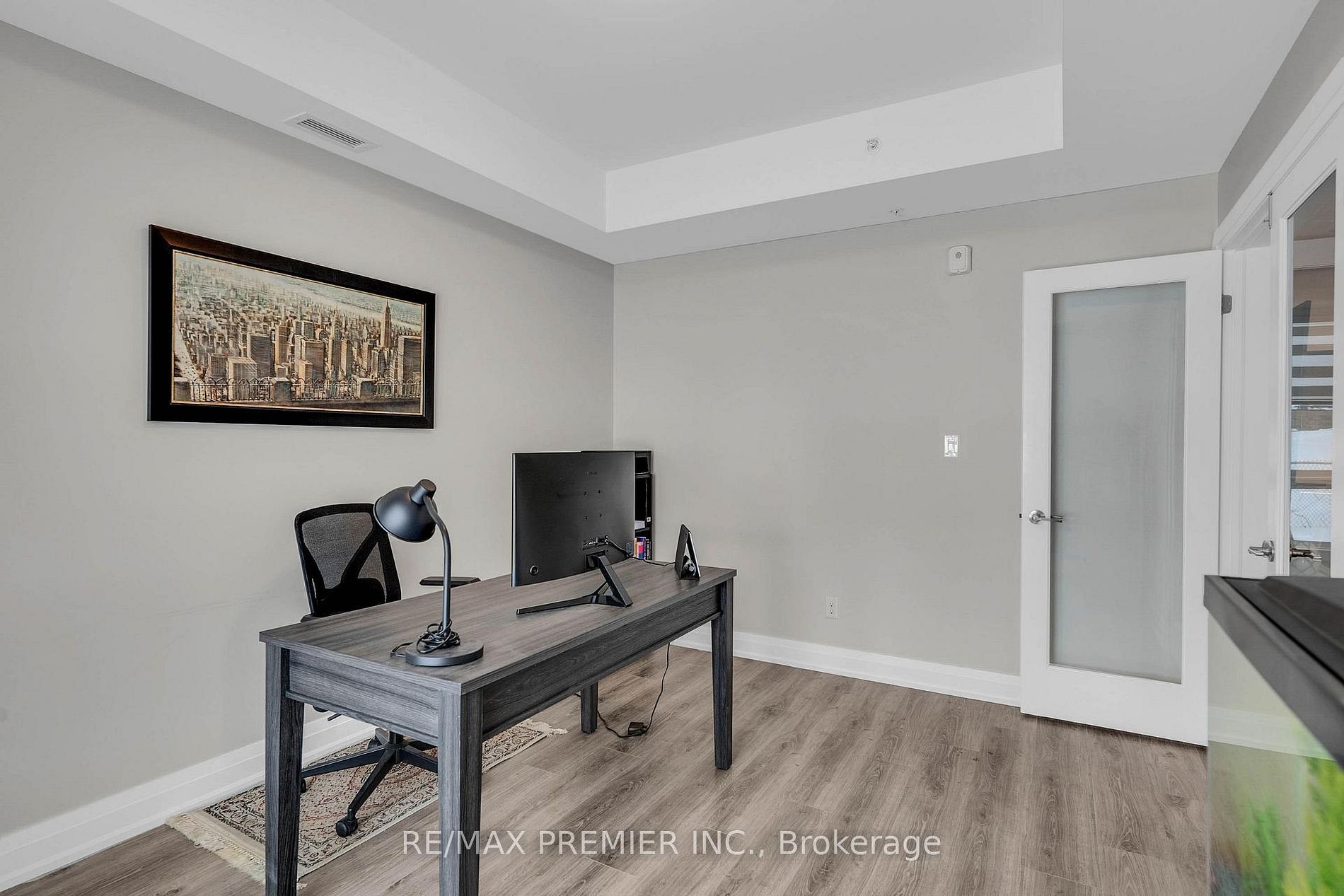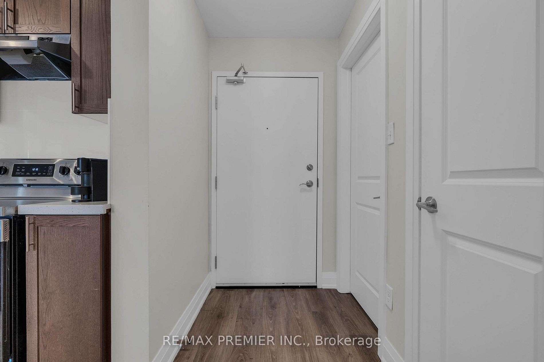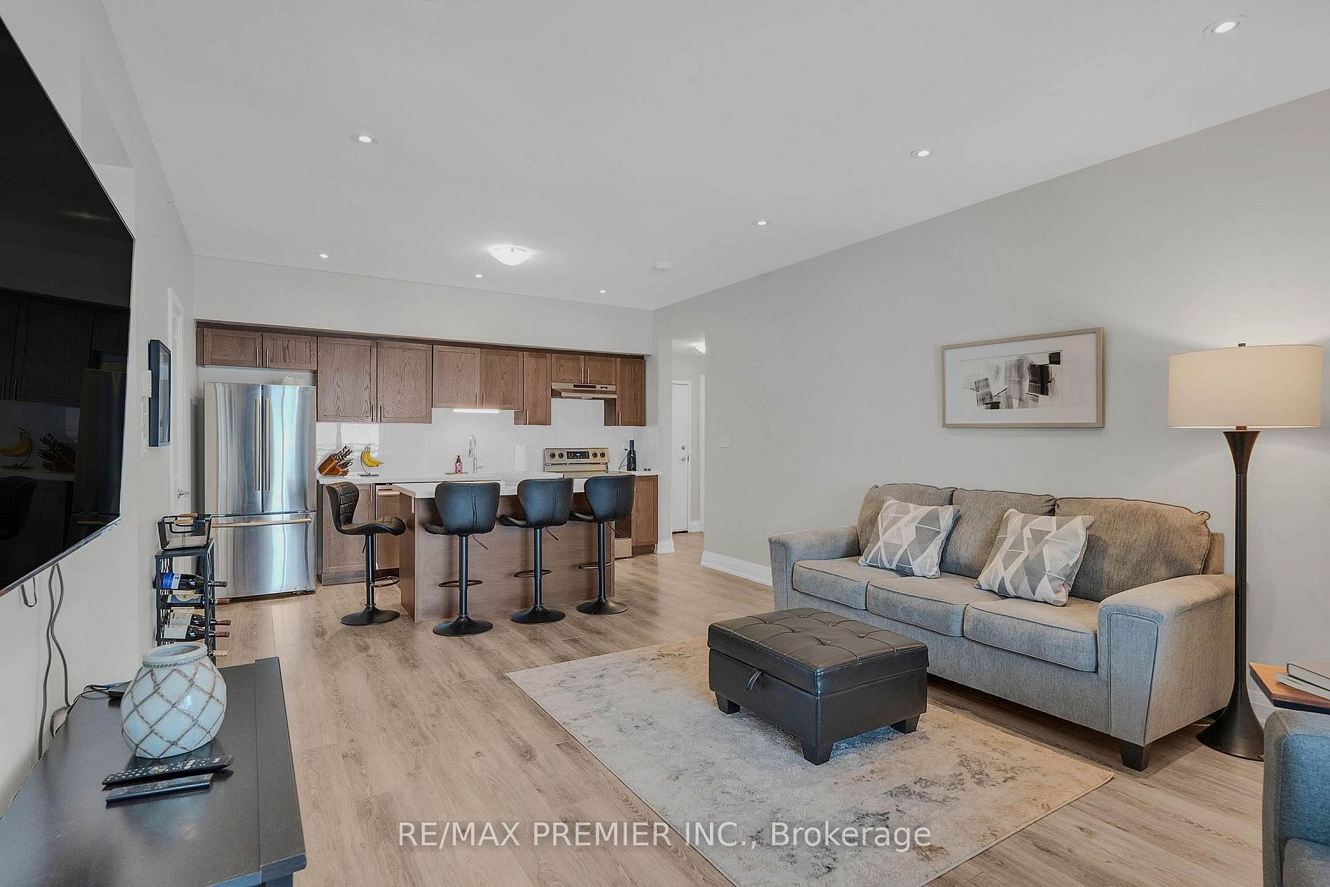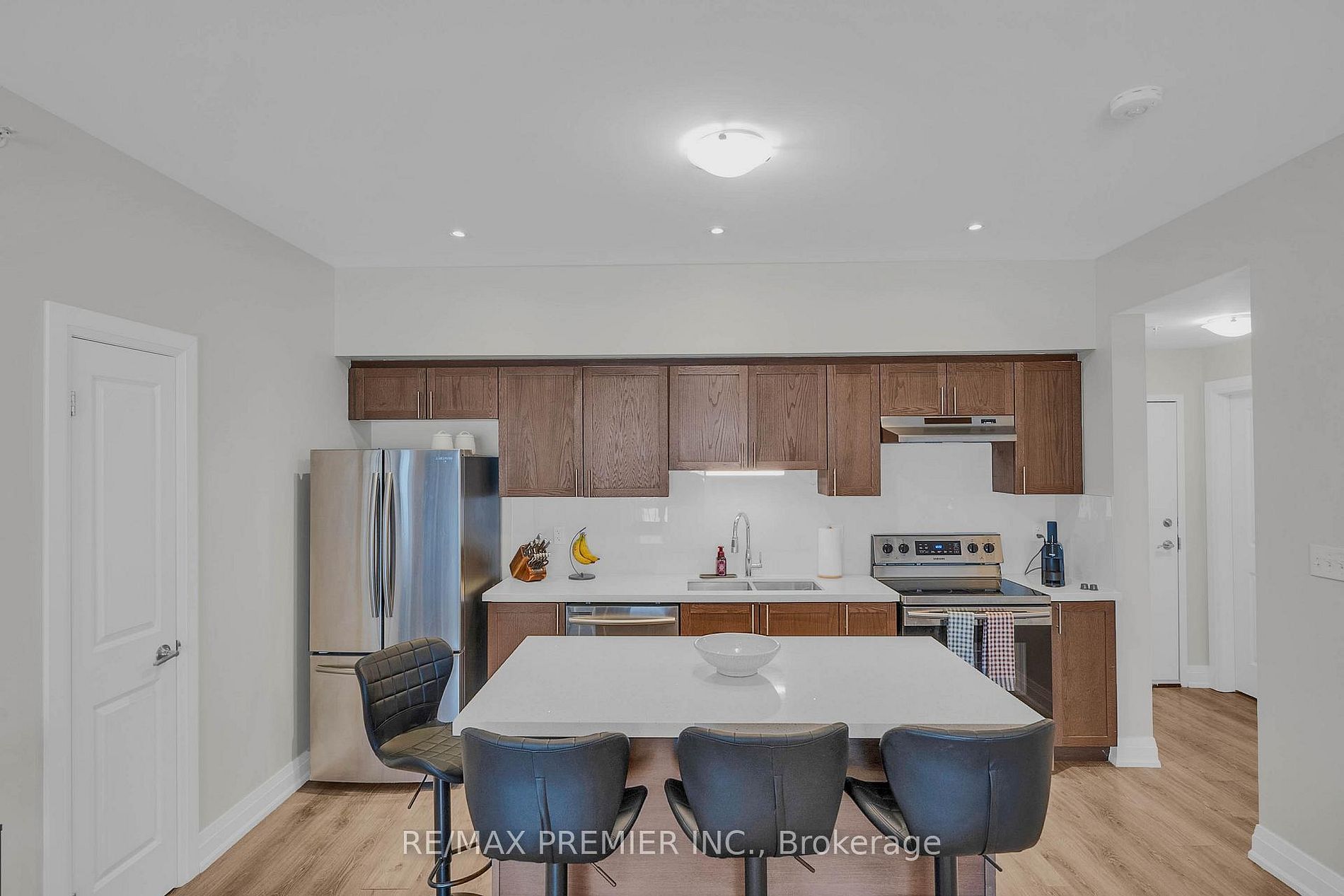 With 2 parking spots- this impeccably maintained 3-bedroom end unit offers 1,240 sq. Ft. Of upgraded, carpet-free living space, complete with both underground and surface parking. Located on the main floor, this bright corner suite features high ceilings and an open-concept layout. The renovated kitchen includes a centre island, full-size appliances, quartz countertops, upgraded faucets, new backsplash, modern hardware, and a dedicated pantry. The spacious living area provides a seamless walkout to the balcony. The private primary bedroom features a large walk-in closet with custom floor-to-ceiling organizers, remote-controlled zebra blinds, and a stylish ensuite with a glass shower enclosure. The second bedroom is generously sized with a double-door closet, while the third room offers flexibility as a bedroom or den. Additional highlights include two 4-piece bathrooms, in-suite laundry, upgraded lighting and hardware throughout, a private locker, and abundant pot lights. The location is ideal-minutes to public transit, schools, shopping, rvh hospital, georgian college, little lake, and hwy 400.