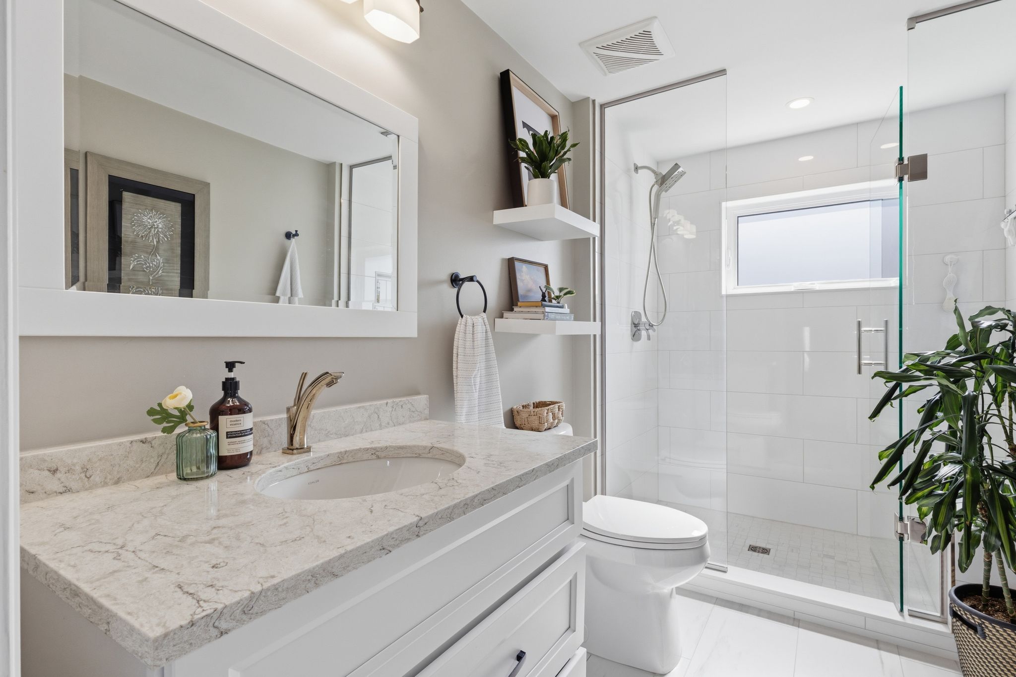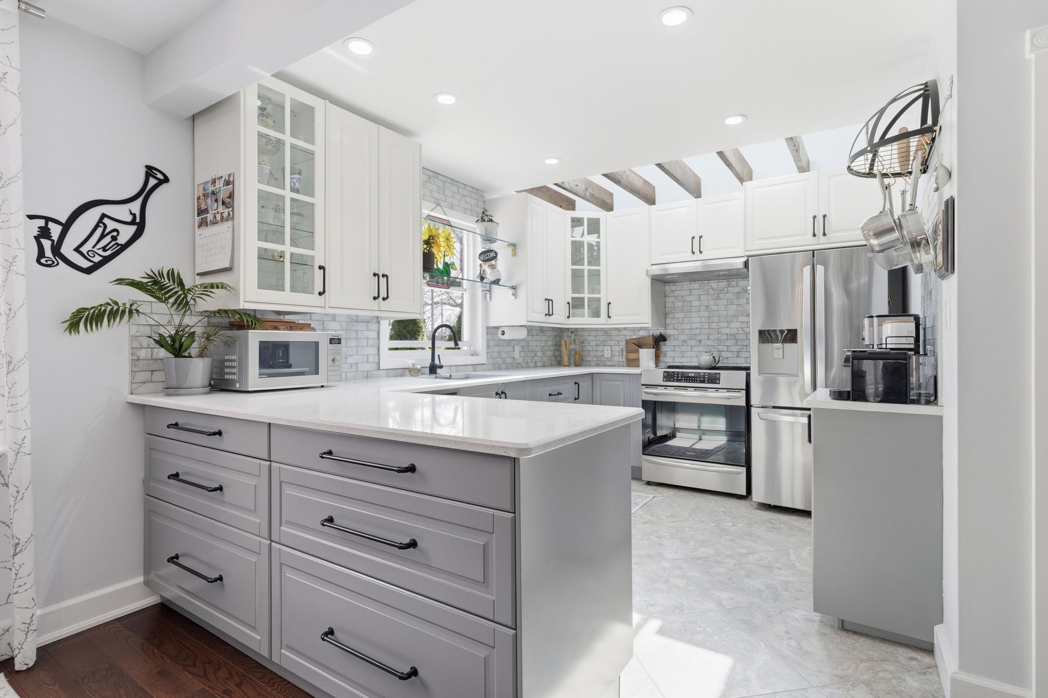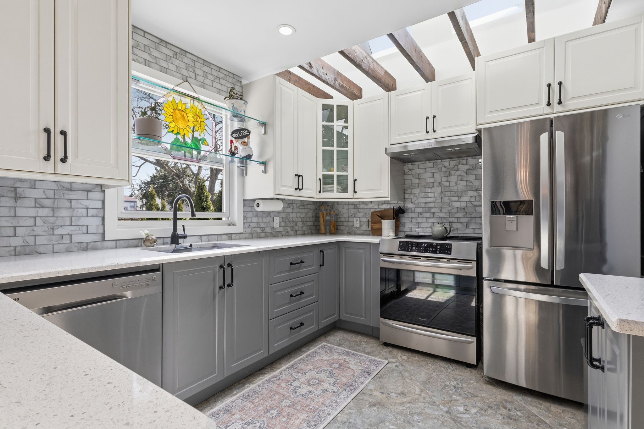 • Bright open-concept kitchen with quartz countertops and stainless steel appliances.