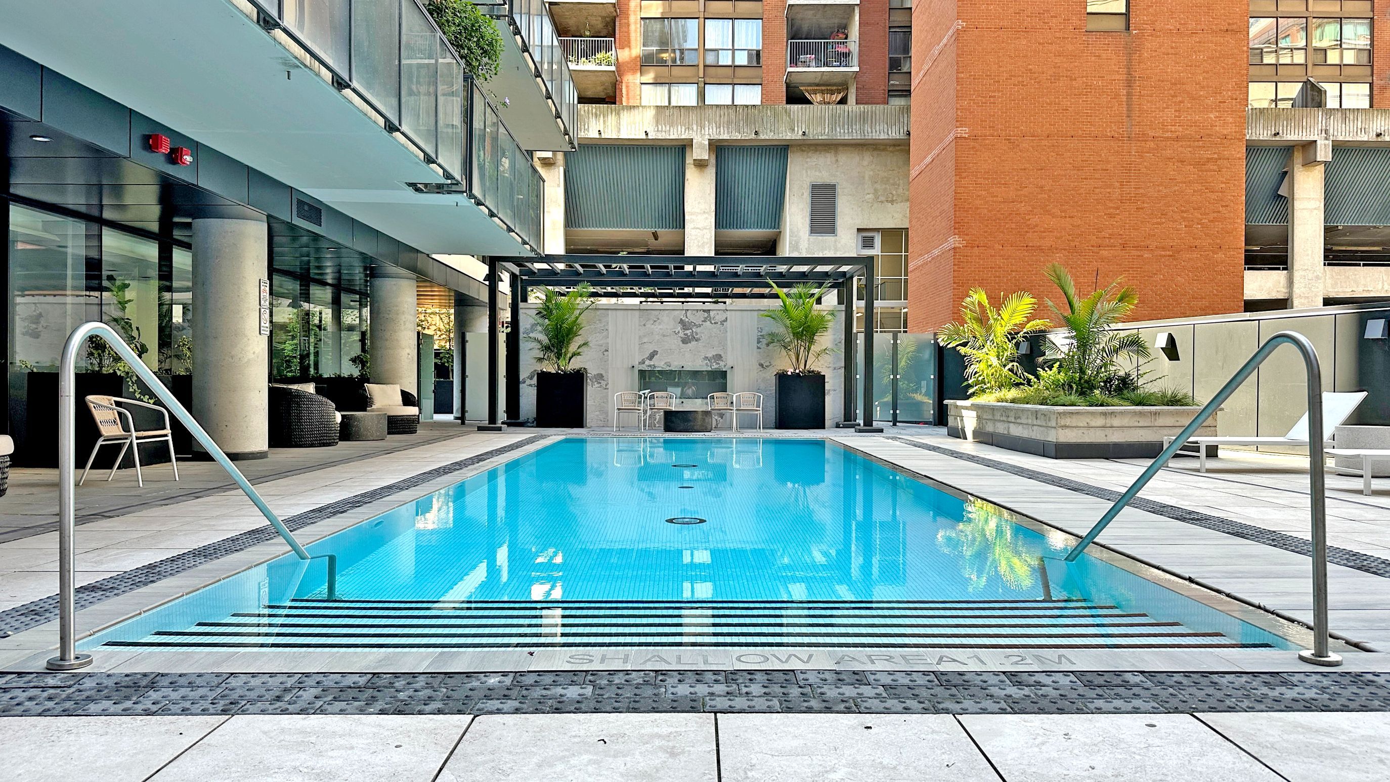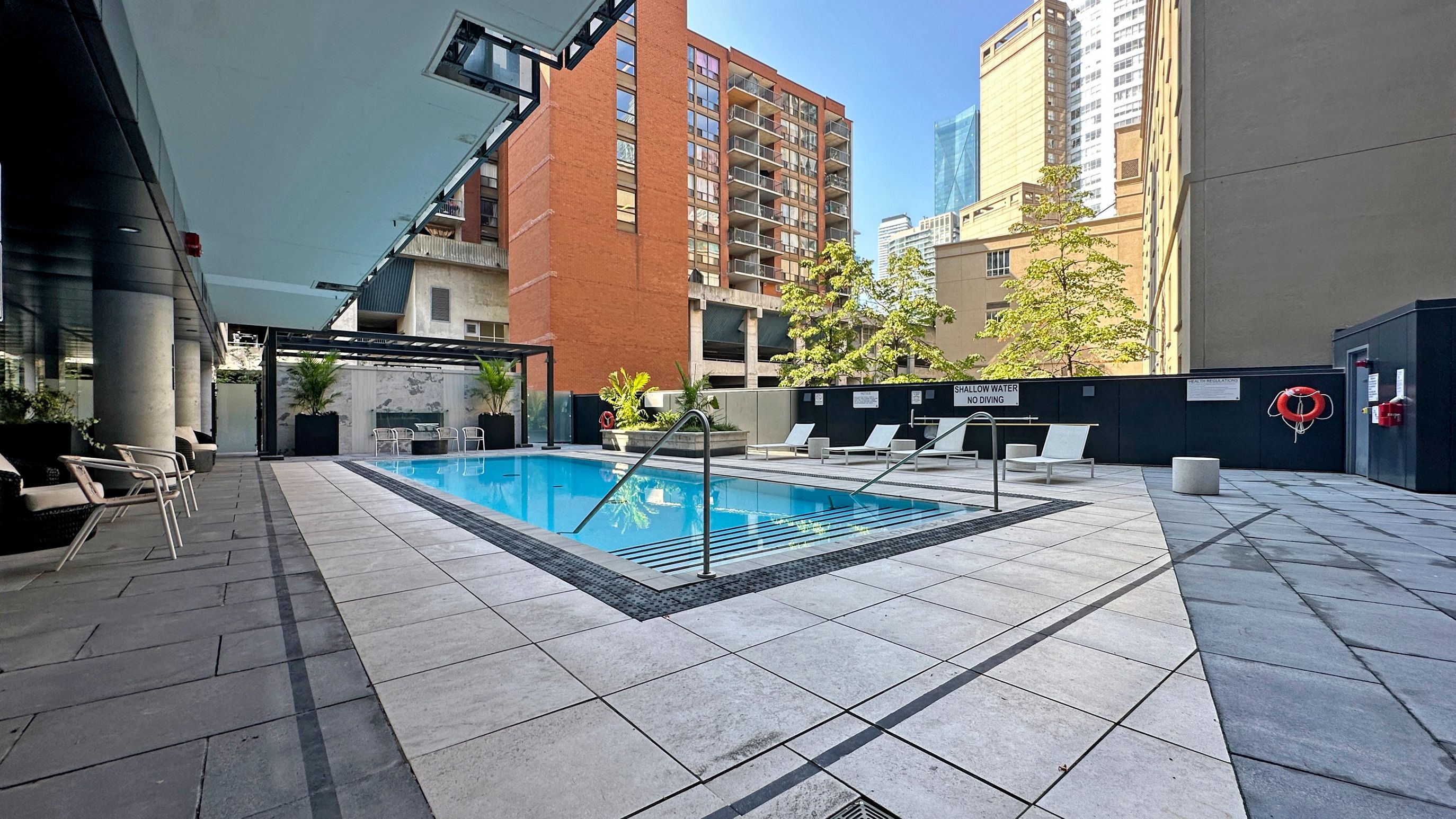 • Well-equipped building amenities including a rooftop pool and sun deck.
