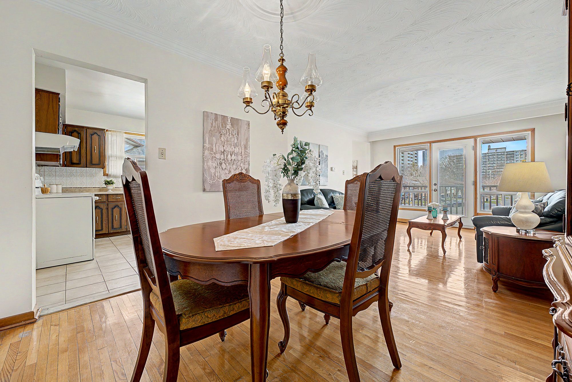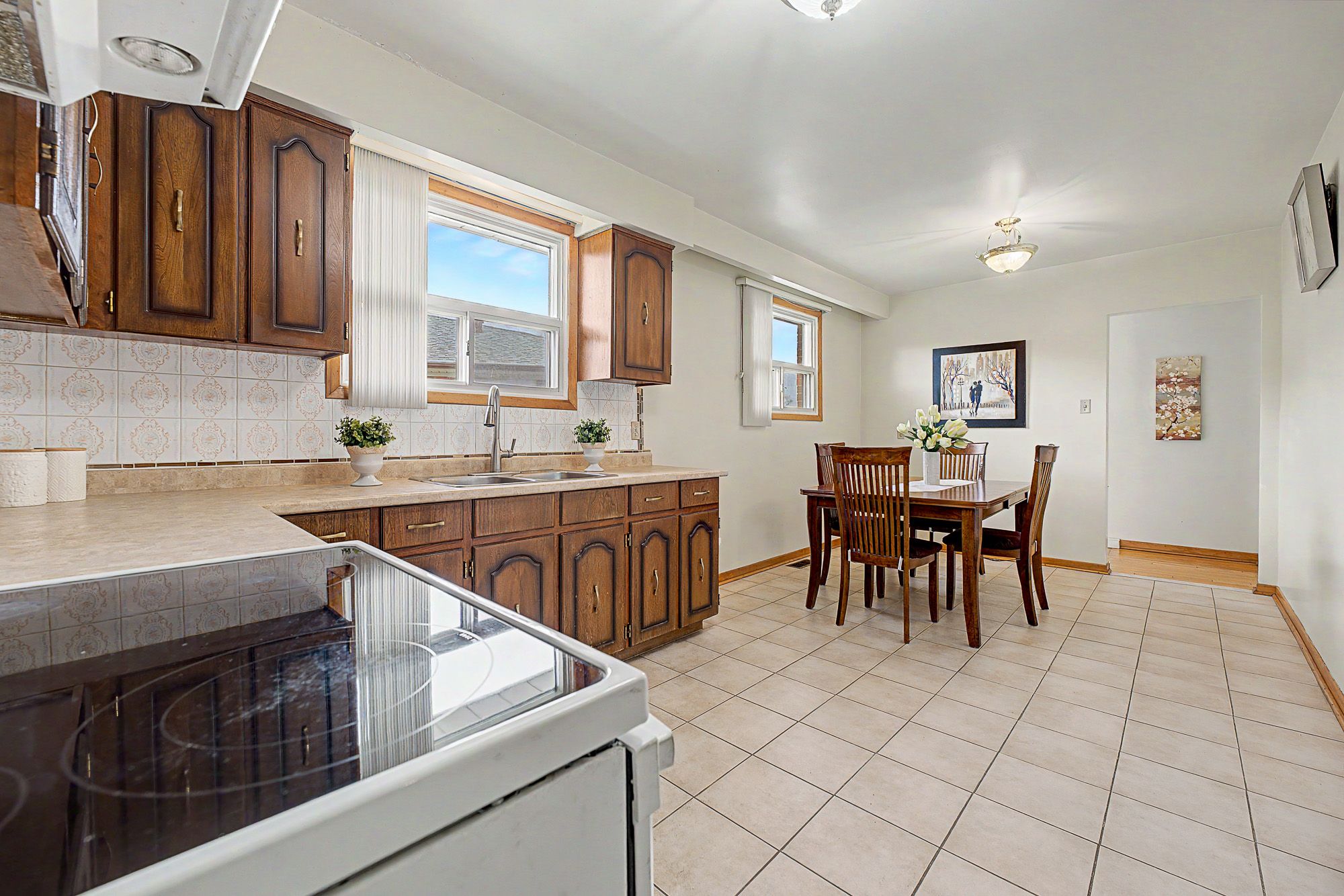 • Family-sized eat-in kitchen with ample cabinetry for cooking and gathering.