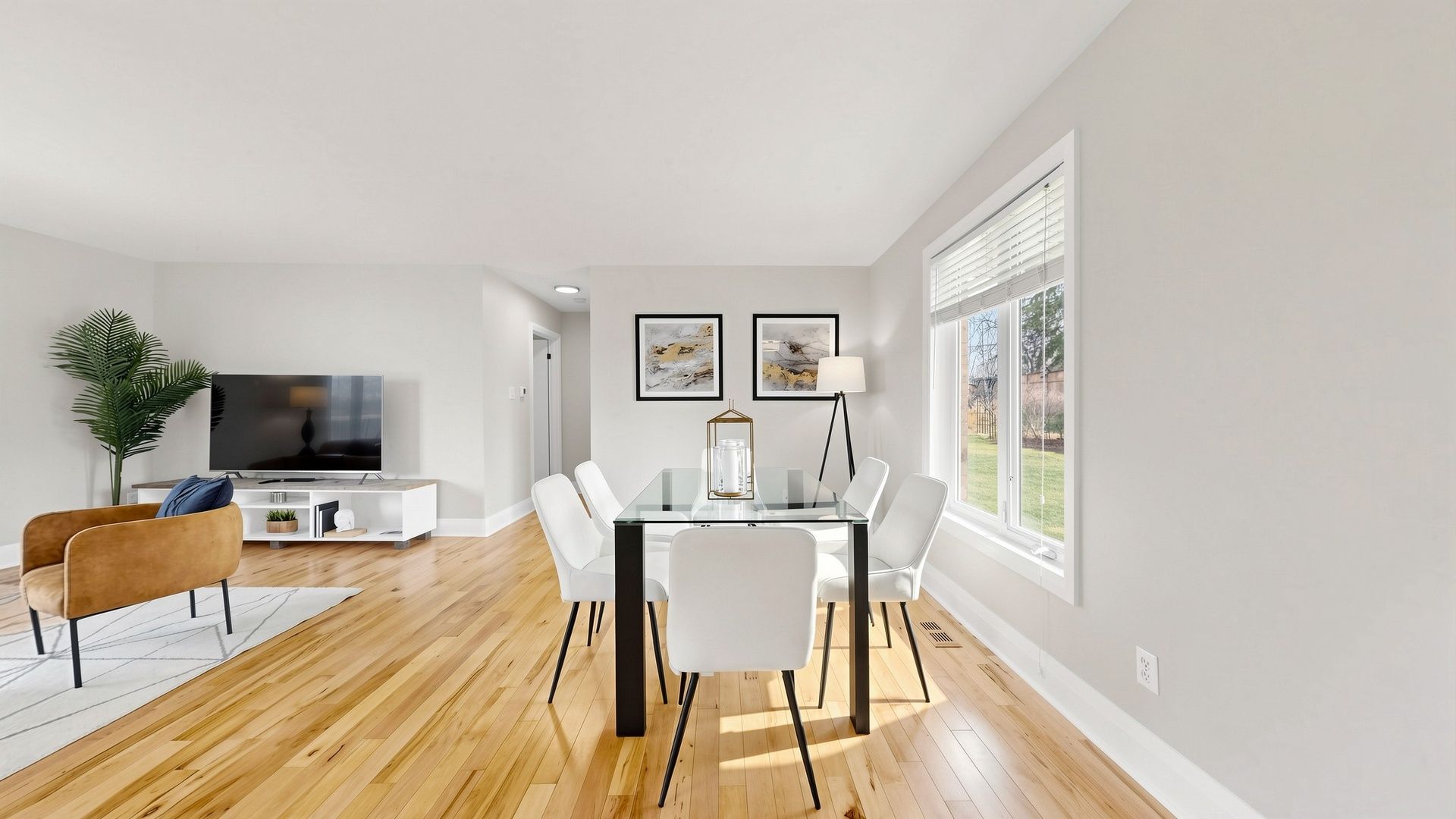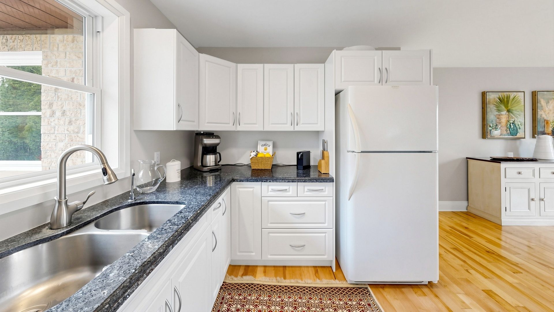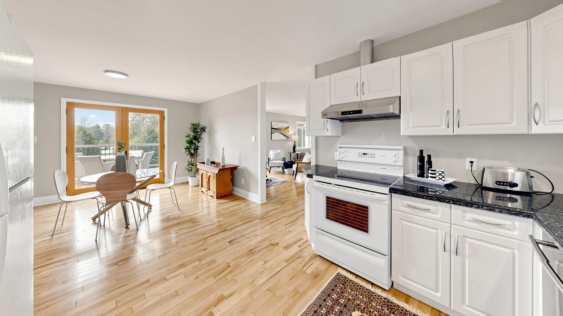 • Open-concept layout with hardwood floors and a cozy modern woodstove.