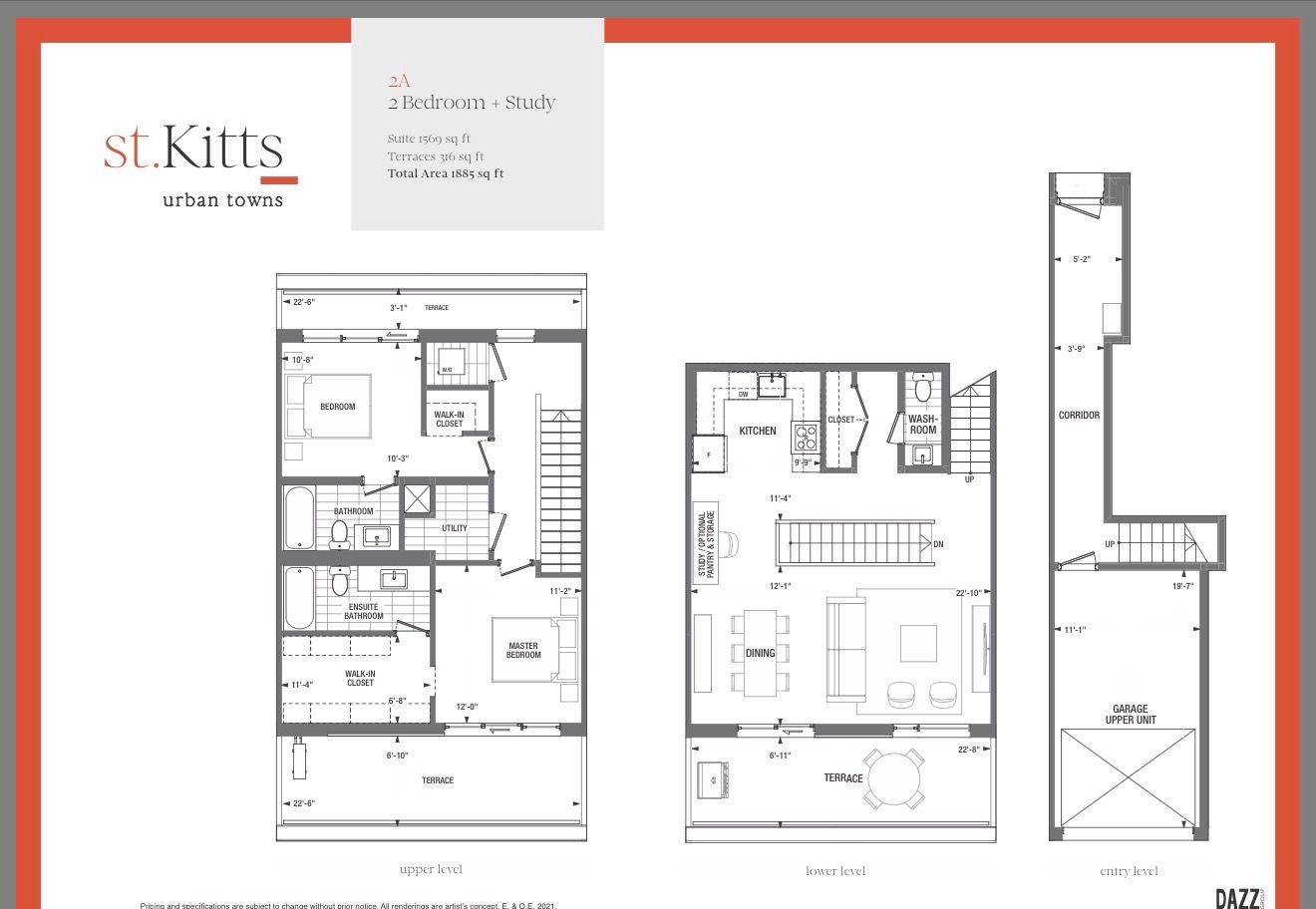Welcome to the st. Kitts urban towns by dazz group. This brand new stunning 2 bedroom + study, 3 bathroom upper stacked townhome boasts 1569 square feet of living space and checks all the boxes! With a built-in garage offering direct access to your unit, an open concept main floor with terrace and guest powder room, and 2 sizeable bedrooms upstairs, each with ensuite bathroom, walk-in closet and private balcony, no details were spared in creating this beautifully functional residence. Ideally located 11 minutes from the st. Catharines go station, 6 minutes from the pen centre shopping mall, 10 minutes from brock university, 13 minutes from a hospital, and even closer to groceries and restaurants. Be the first to call this amazing home yours!