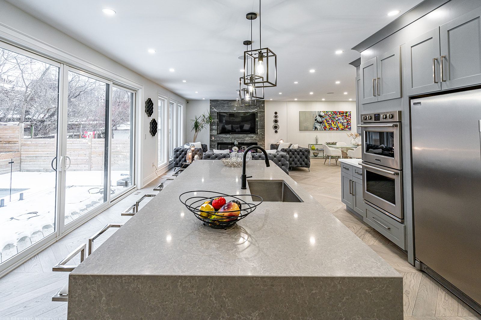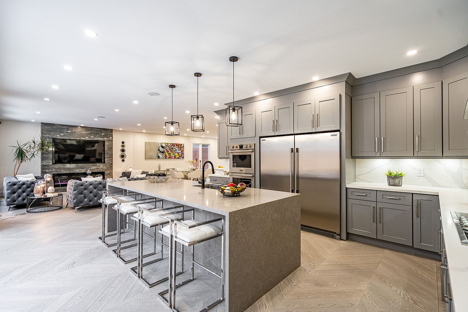 • Gourmet kitchen features quartz island and stainless steel appliances.
