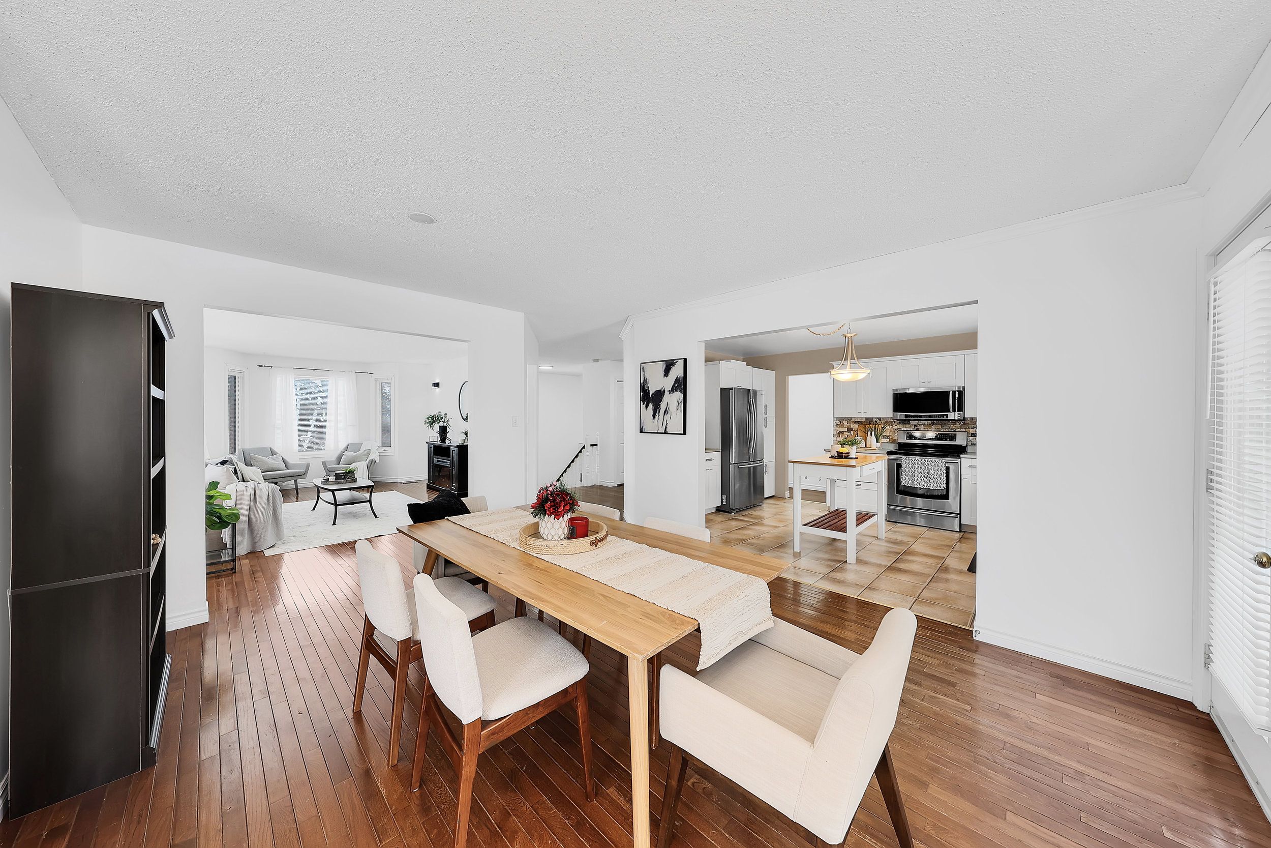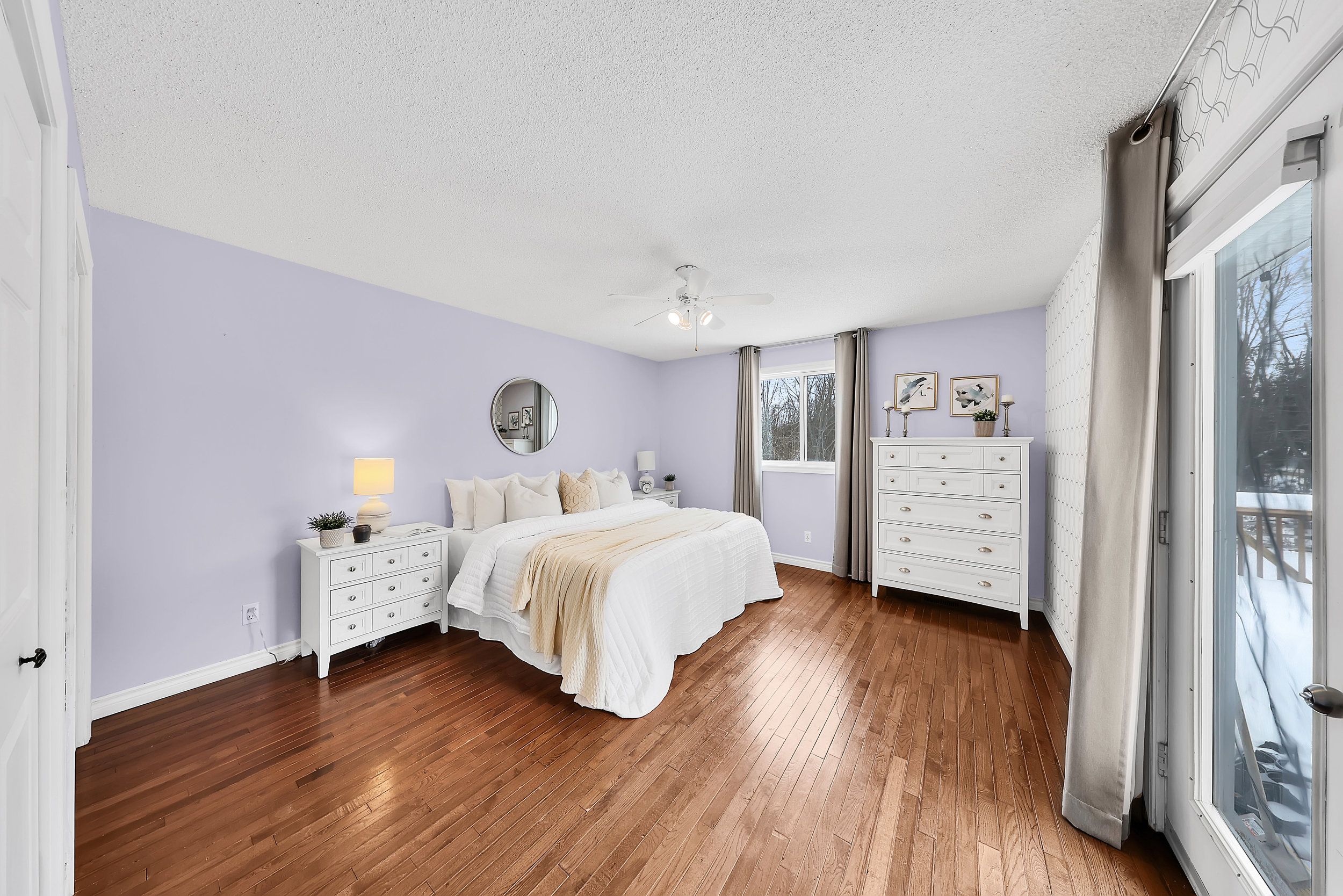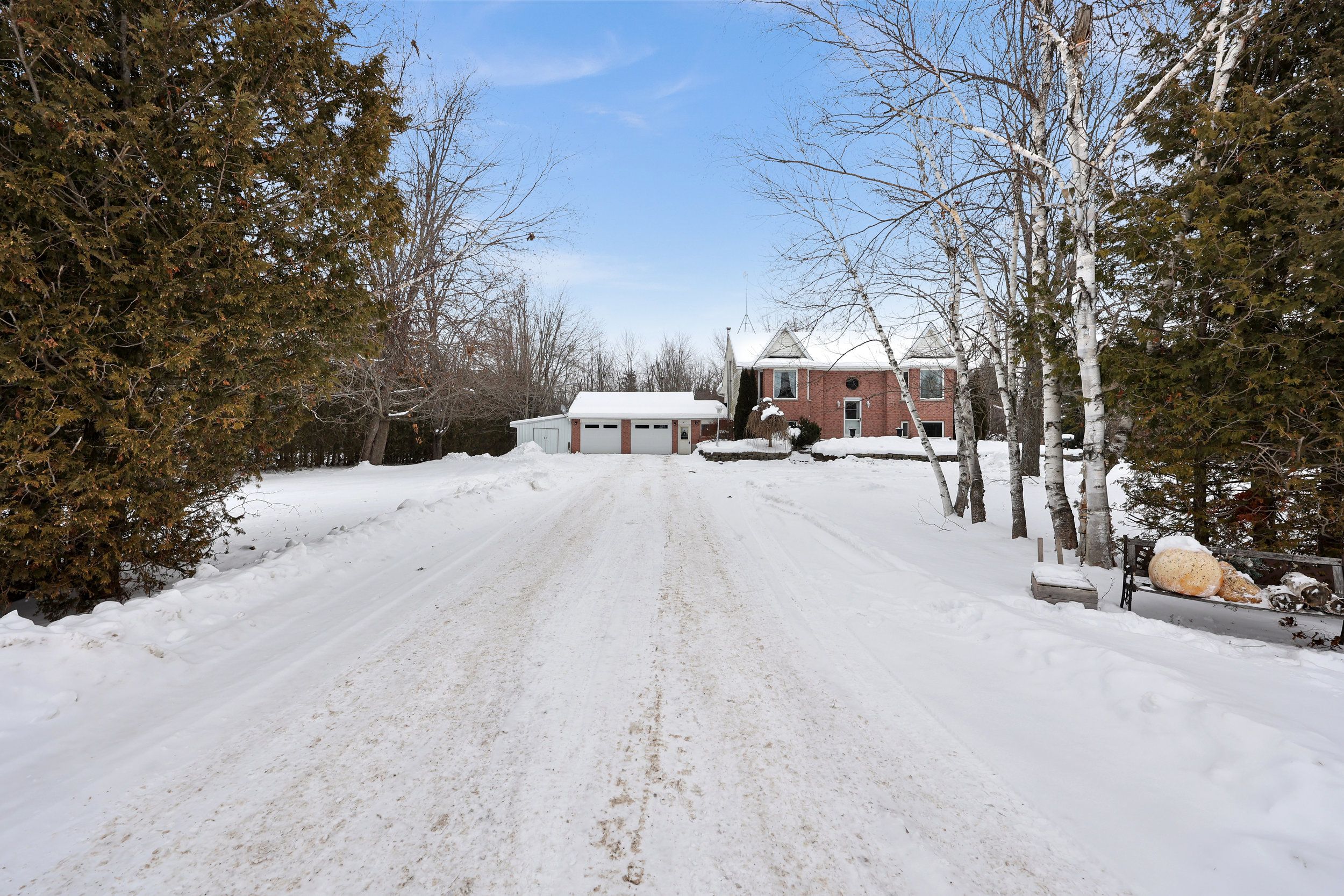 Stunning custom-built home situated on a spectacular private treed lot in a prime location. A bright open-concept oak kitchen with eating area, flows into the living room-ideal for both everyday living and entertaining. Walk-out from the dining area to the rear deck, with an additional walk-out from the primary bedroom. The main level features two spacious bedrooms and a full bath, highlighted by hardwood flooring throughout. A wide staircase leads to the lower level, presenting a large recreation room, three additional bedrooms, and a 3-piece bath, all complemented by warm pine flooring. Additional features include central vacuum, a new pellet stove, an attached oversized double garage with direct access to the mudroom, and a deep private driveway. An impressive 864 sq. Ft. Detached storage building provides ample space for storage, hobbies, or workshop use. A rare opportunity to enjoy privacy, functionality, and quality in a beautifully maintained home. This property is ideal for a growing family or as a vacation home with rental potential.