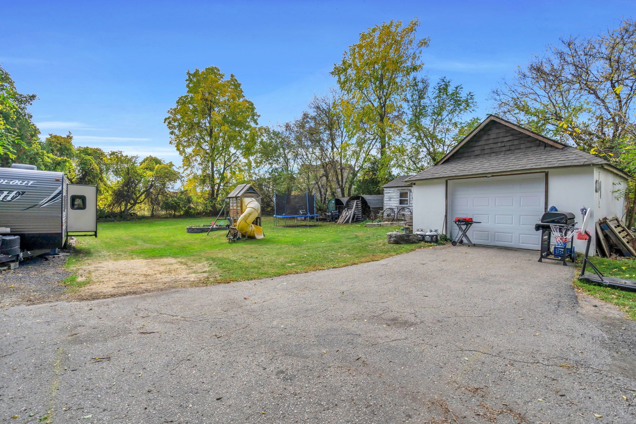 • Large driveway with detached garage and workshop for ample storage.