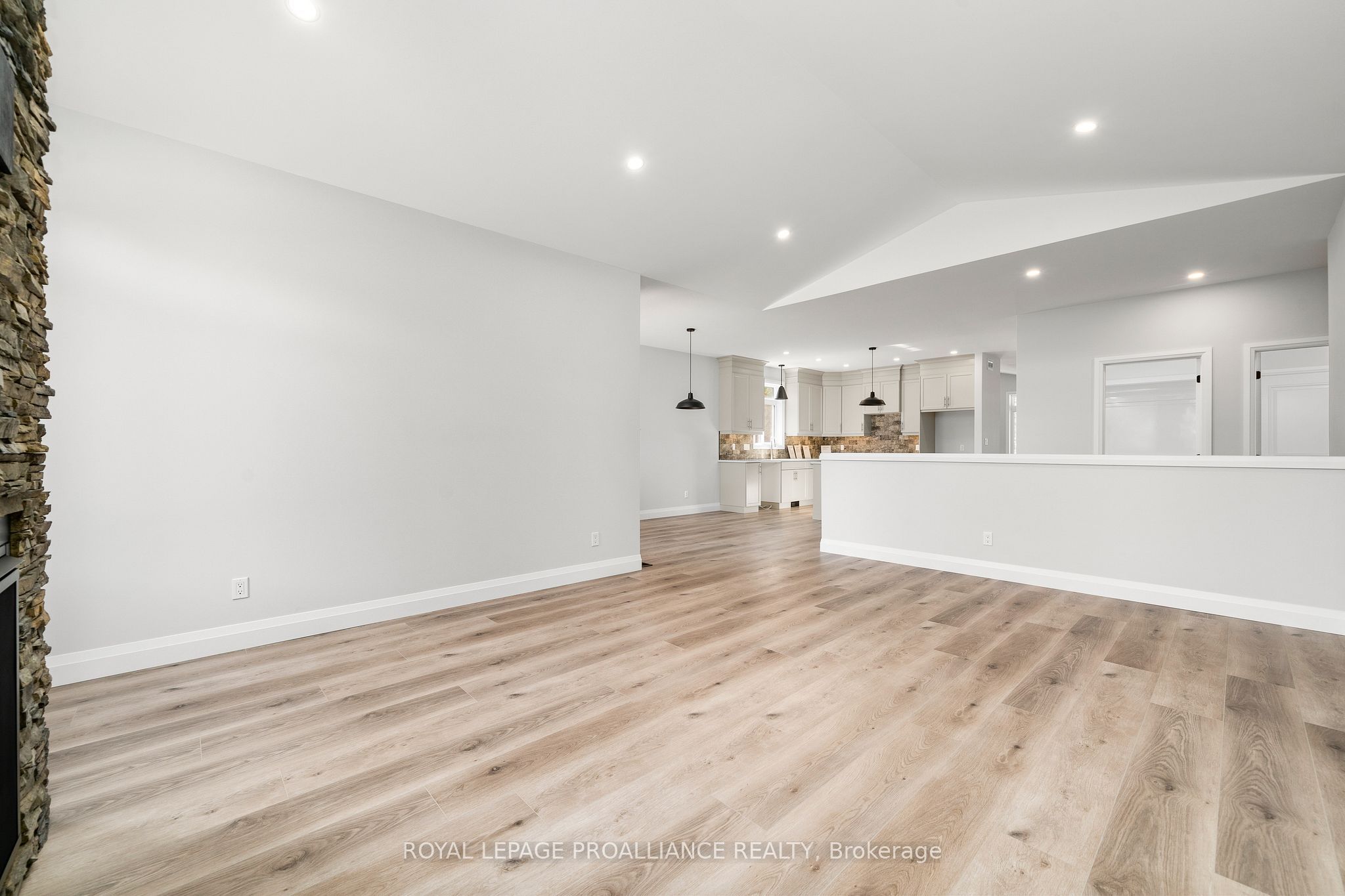 • Great room featuring a gas fireplace and vaulted ceiling.