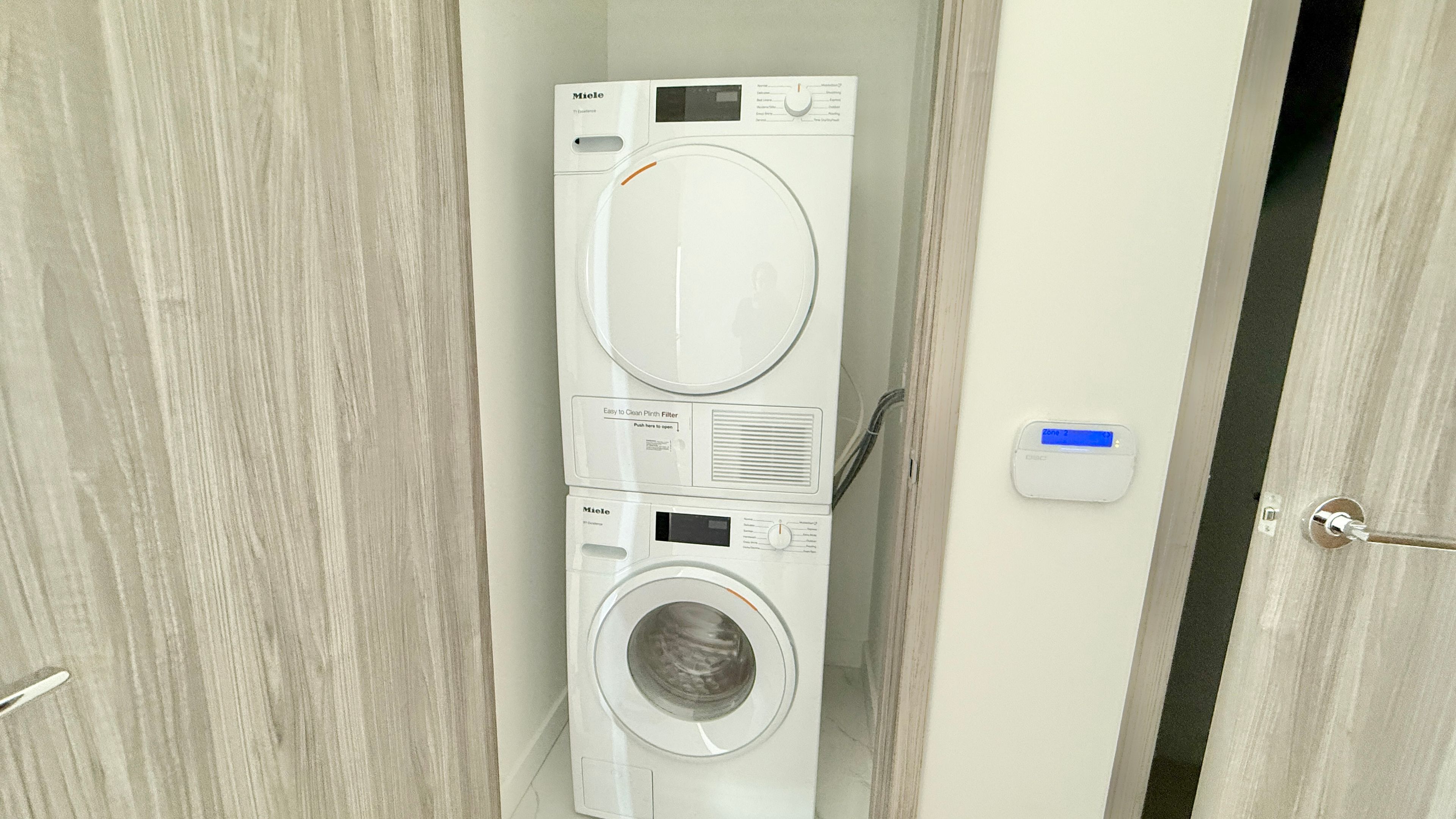 • High-end Miele appliances and floor-to-ceiling windows bring in natural light.