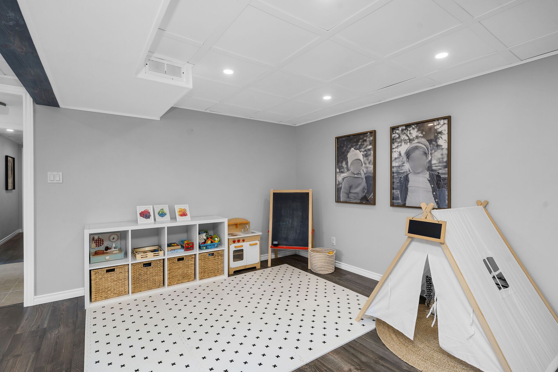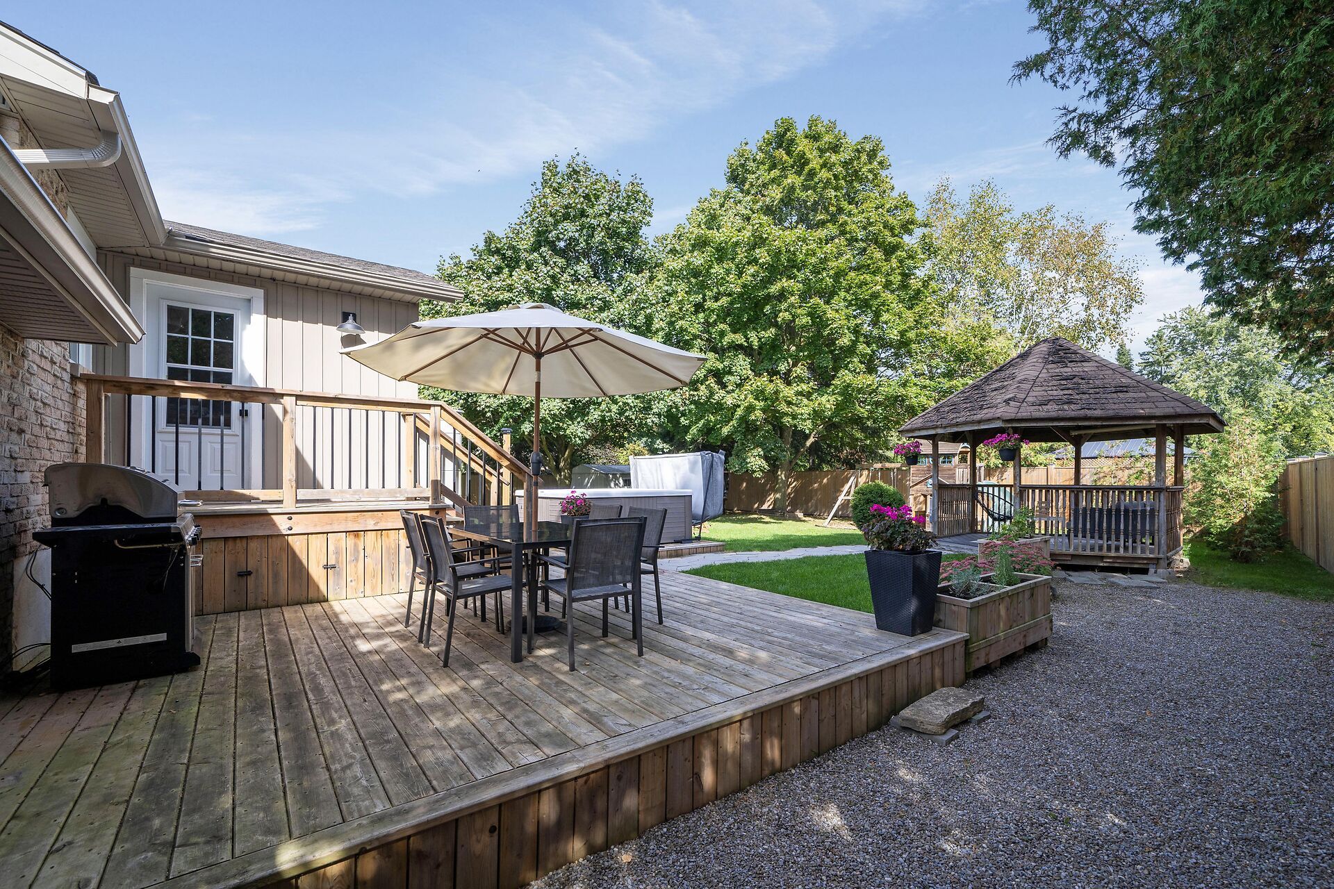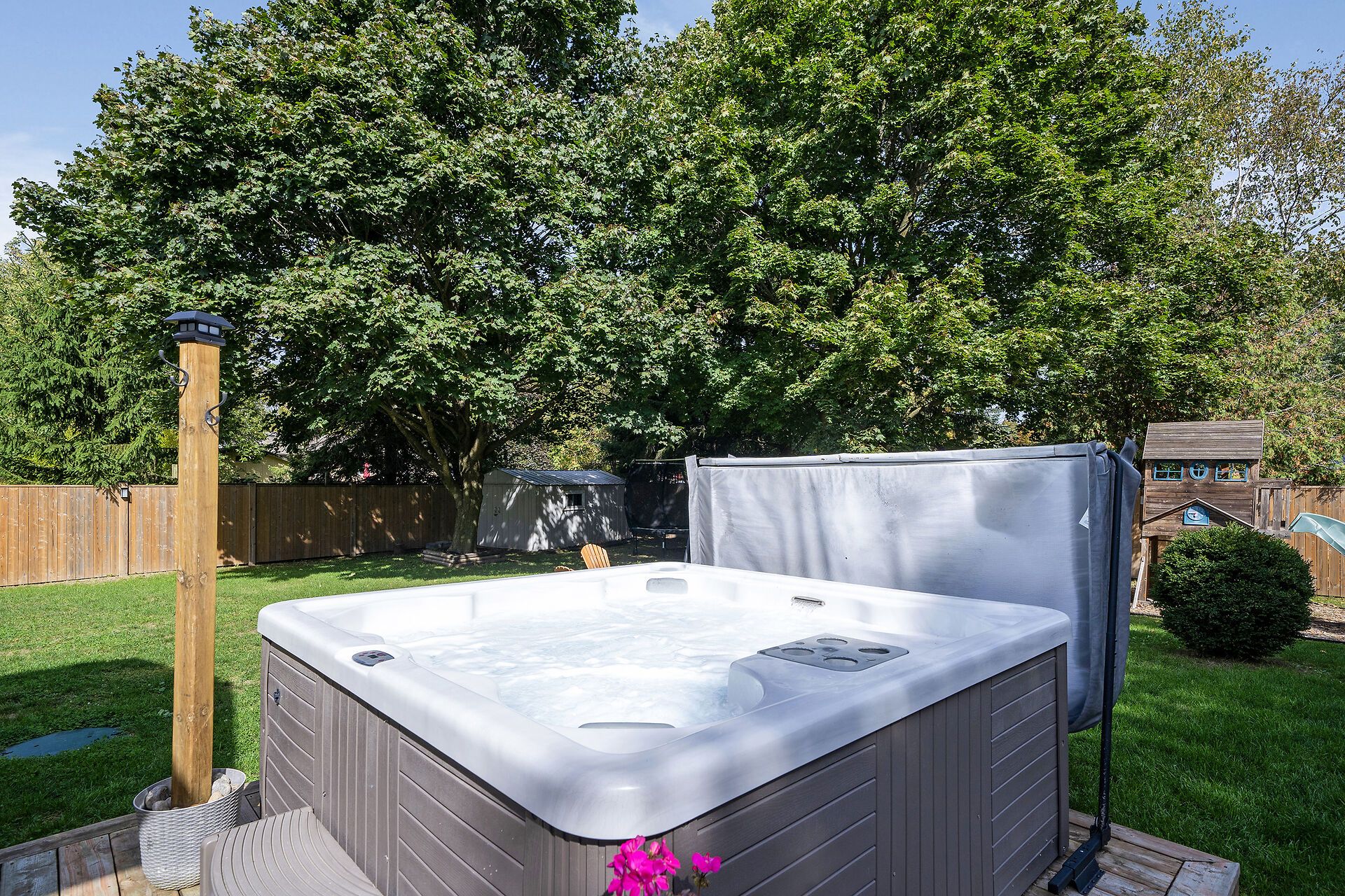 • Fully fenced backyard with a deck, gazebo, hot tub, and playhouse.