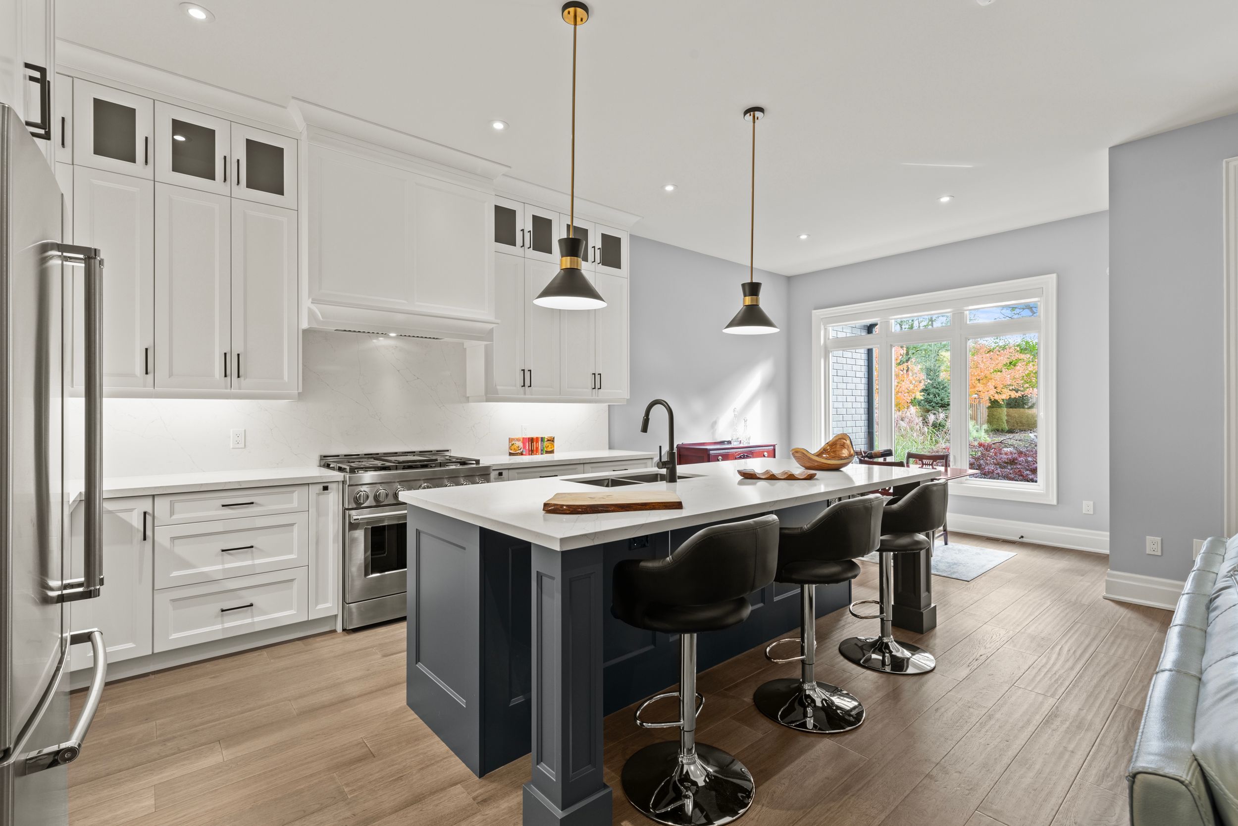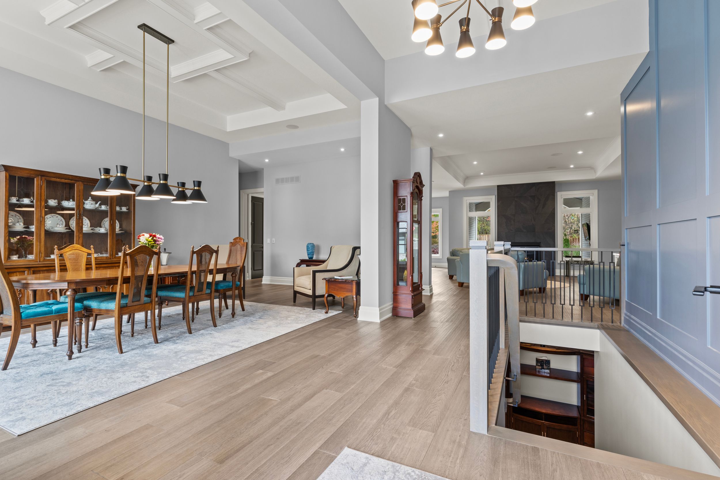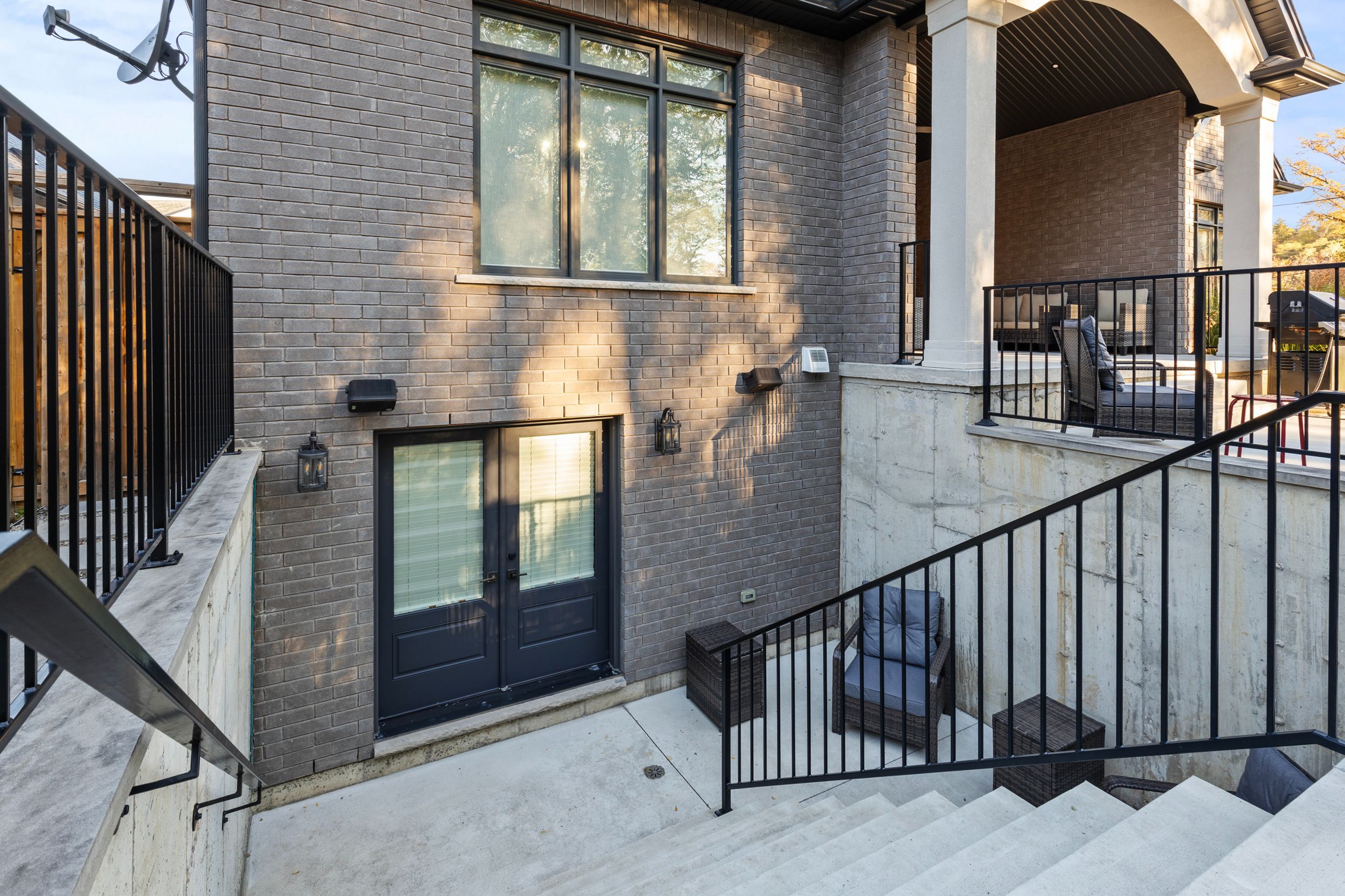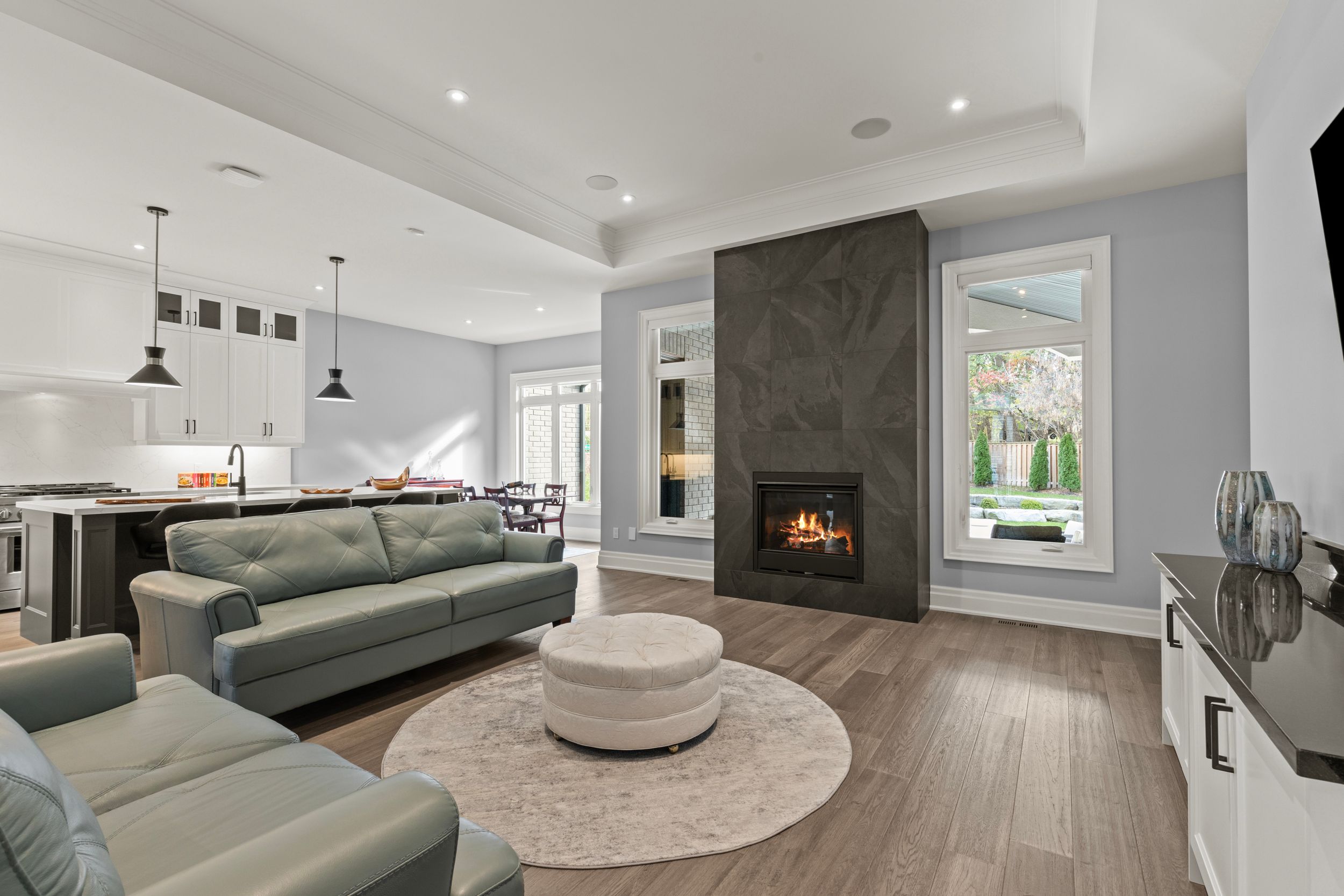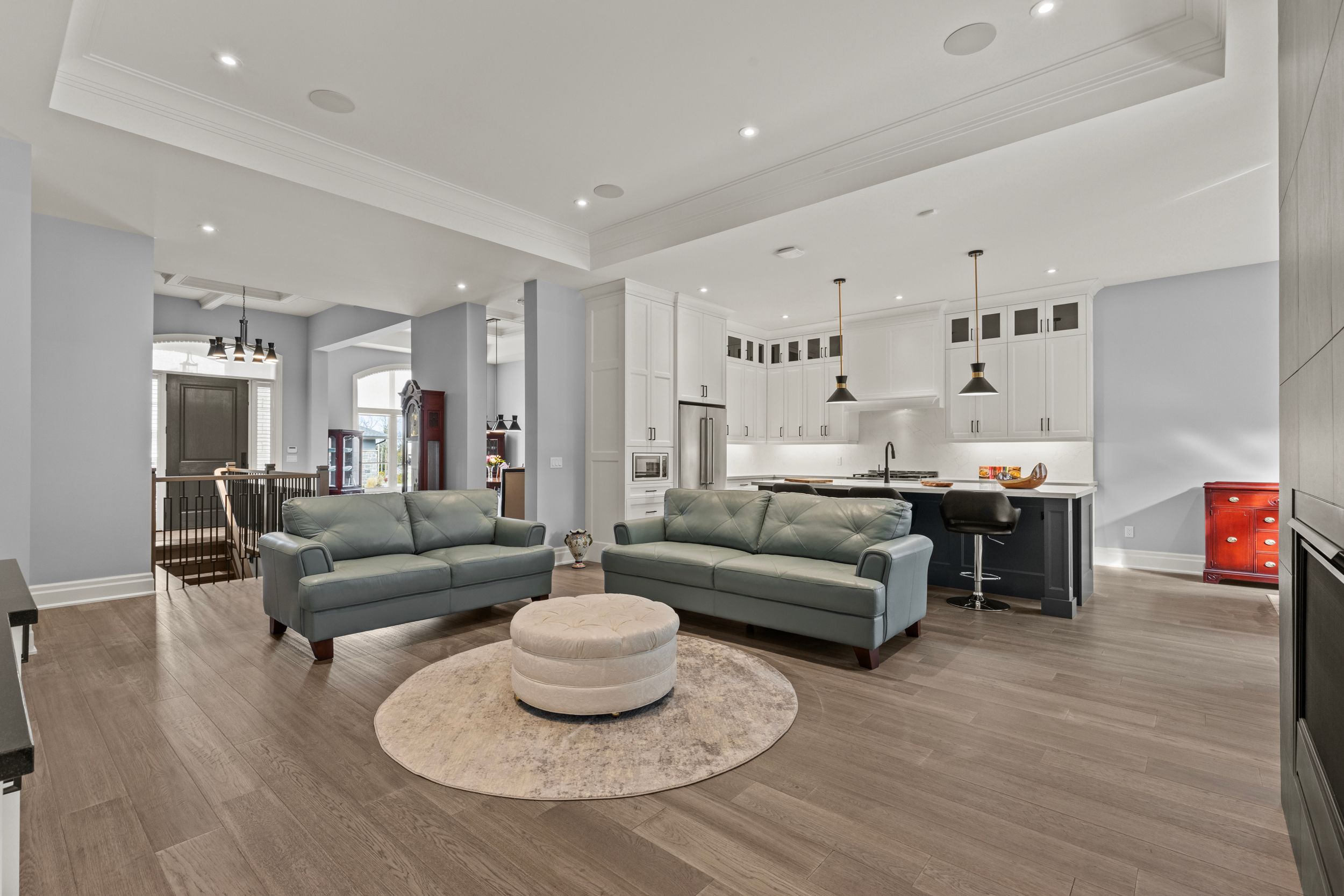This luxury custom-built 2580 sqft bungalow offers exceptional craftsmanship, elegant design, and highly functional multi-generational living spaces throughout. Fully finished basement makes it nearly 5000 sqft finished! Designed with versatility and comfort in mind, the home features three complete kitchens each finished with custom cabinetry, quartz countertops, premium appliances (two gas ranges and one electric), three refrigerators, three dishwashers, and built-in microwaves-perfect for hosting large gatherings or offering private, independent living for extended family members. The main level showcases 12-foot coffered ceilings, engineered hardwood flooring, custom roller blinds, and beautifully appointed living areas highlighted by two gas fireplaces. For added everyday comfort, the home includes heated tile floors in three bathrooms and the lower-level kitchen. A self-contained 1-bedroom granny suite with its own entrance and dedicated parking provides privacy and flexibility, while the fully finished lower level includes two additional bedrooms, a full bathroom, a walk-out, and a spacious walk-in fruit cellar. The property features two full laundry rooms, each equipped with washer, dryer, laundry tub, and storage. Additional upgrades include russound integrated sound and satellite wiring, a full security camera and alarm system with monitoring option, and an in-ground sprinkler system for effortless exterior upkeep. The home is fully fenced, professionally landscaped with thoughtful rock and garden design, and includes a covered outdoor porch to enjoy peaceful surroundings in every season. Every detail - from cabinetry to ceiling design to layout functionality - reflects the care put into creating a home that is both luxurious and deeply livable. This is a rare offering that combines elevated finishes, spacious design, and true multi-use living under one roof, providing comfort, privacy, and long-term value for its next owner.