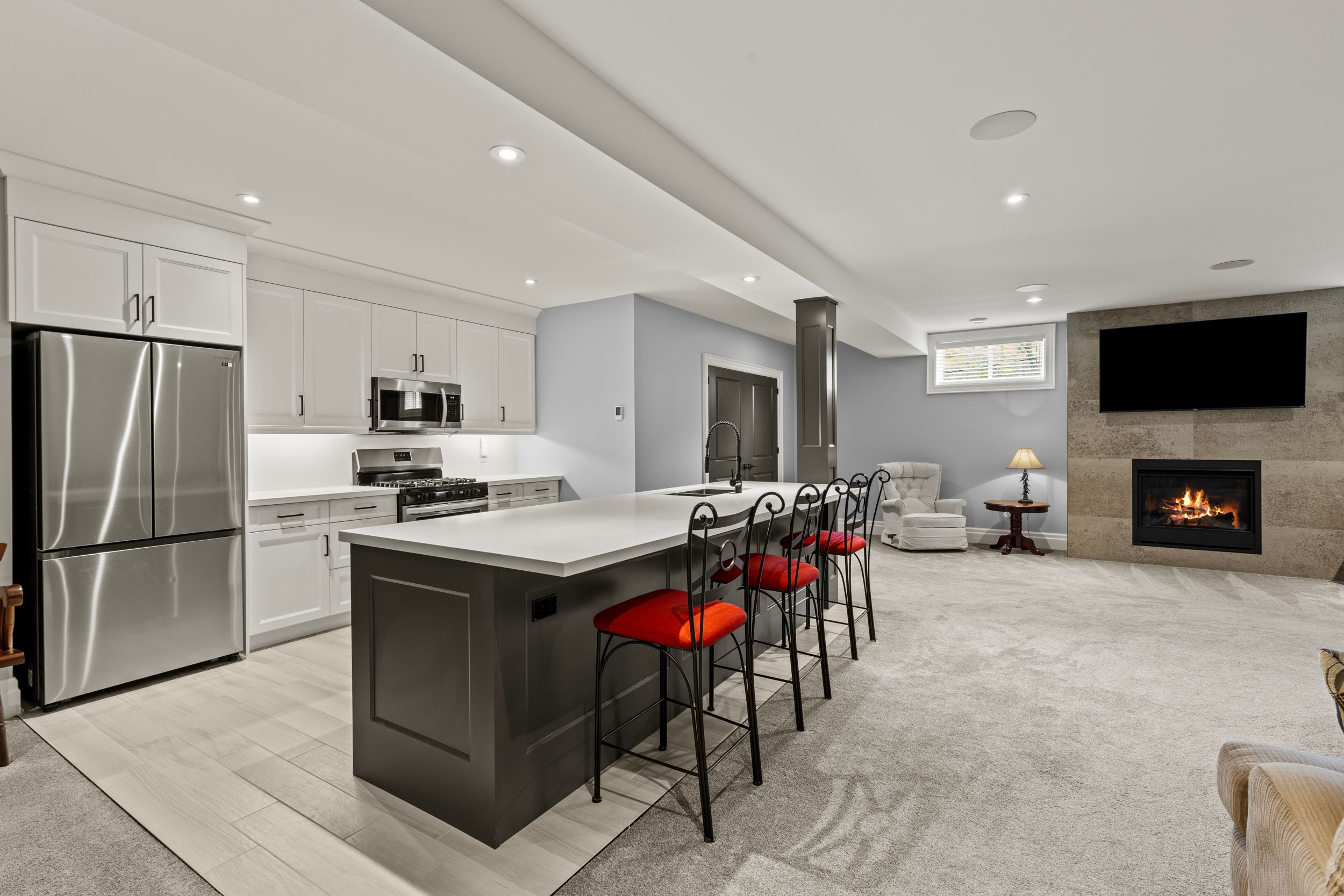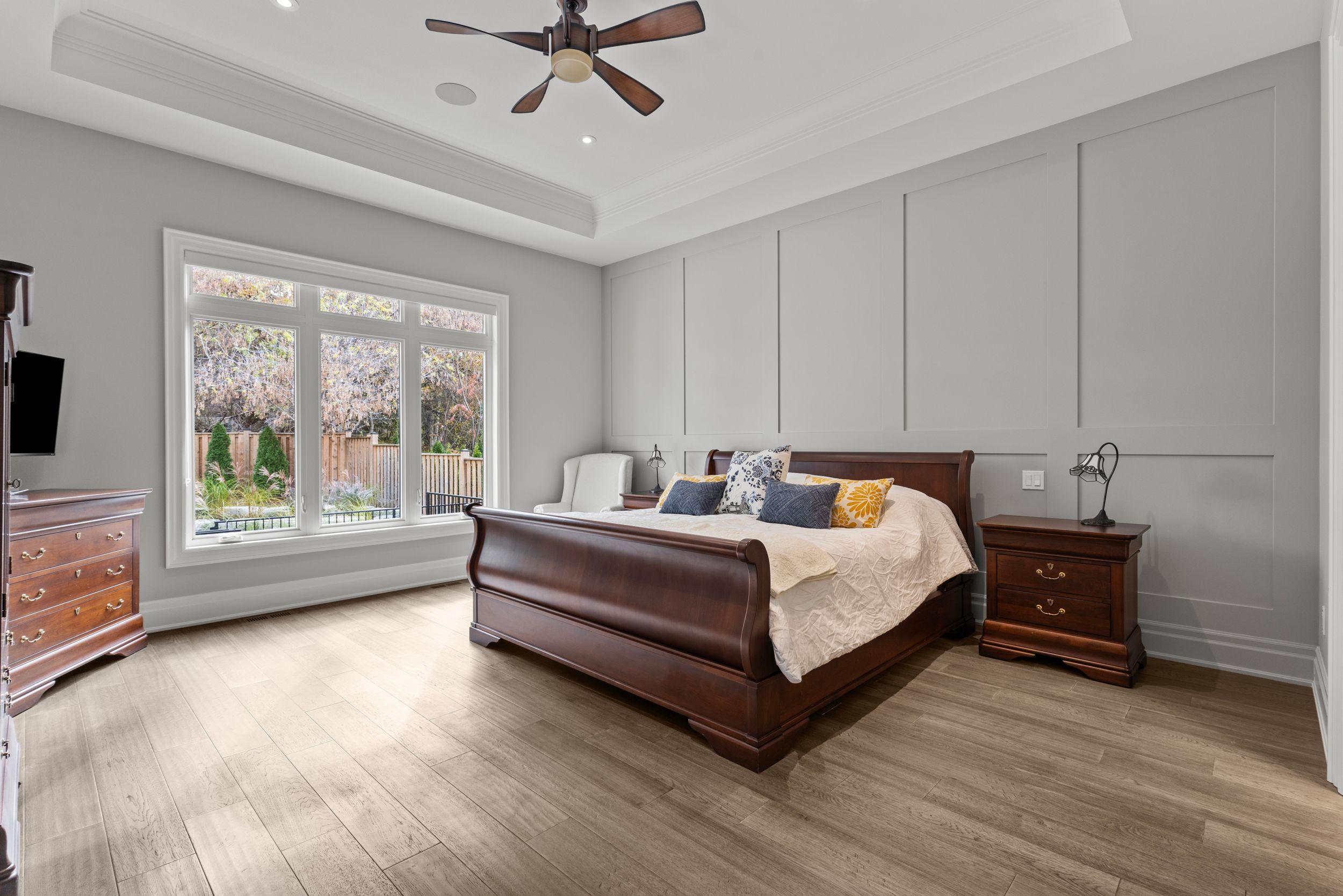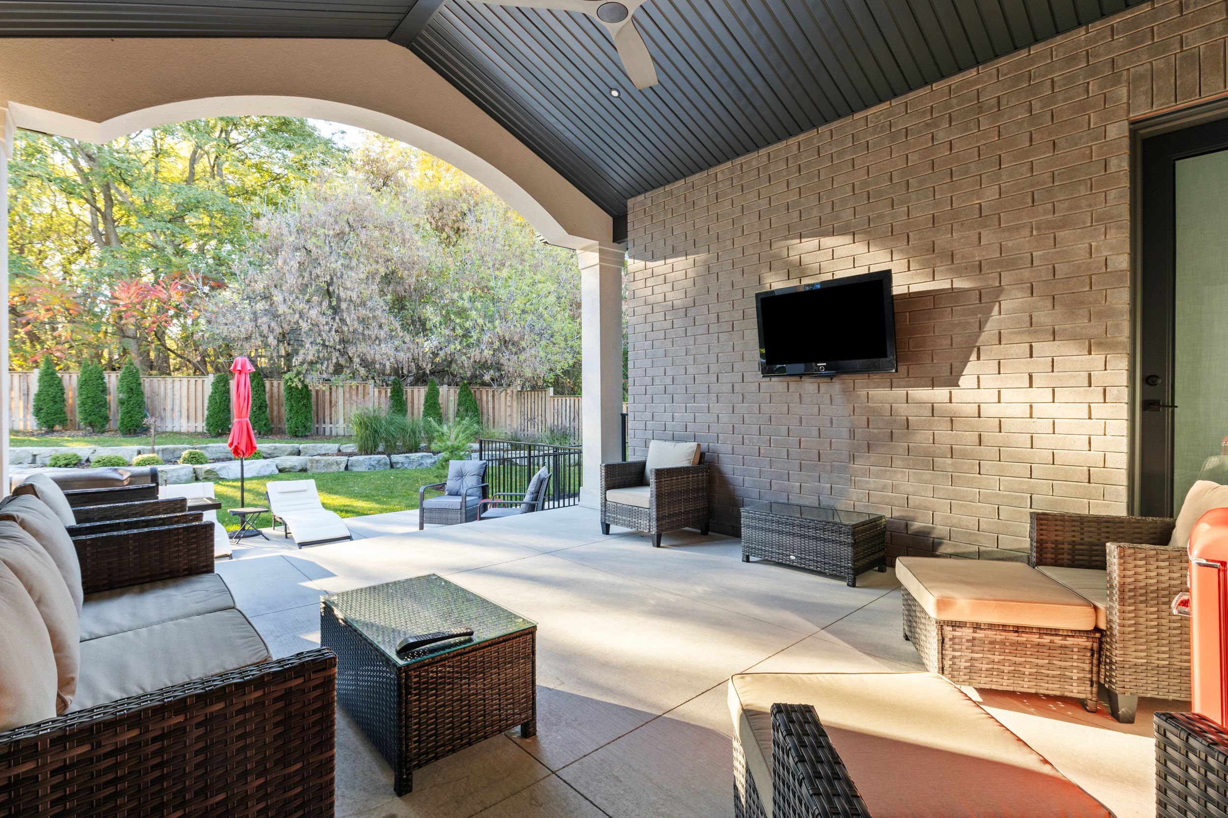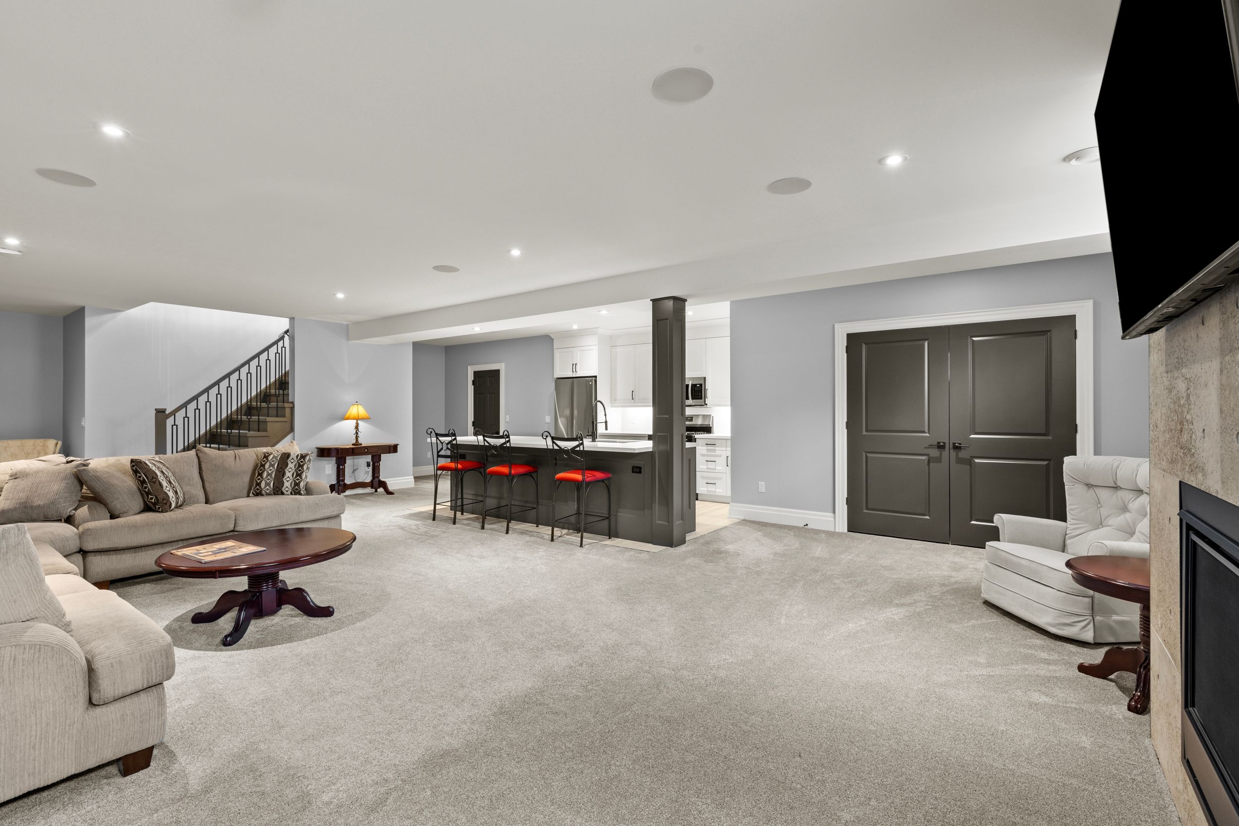 This luxury custom-built 2580 sqft bungalow offers exceptional craftsmanship, elegant design, and highly functional multi-generational living spaces throughout. Fully finished basement makes it nearly 5000 sqft finished! Designed with versatility and comfort in mind, the home features three complete kitchens each finished with custom cabinetry, quartz countertops, premium appliances (two gas ranges and one electric), three refrigerators, three dishwashers, and built-in microwaves-perfect for hosting large gatherings or offering private, independent living for extended family members. The main level showcases 12-foot coffered ceilings, engineered hardwood flooring, custom roller blinds, and beautifully appointed living areas highlighted by two gas fireplaces. For added everyday comfort, the home includes heated tile floors in three bathrooms and the lower-level kitchen. A self-contained 1-bedroom granny suite with its own entrance and dedicated parking provides privacy and flexibility, while the fully finished lower level includes two additional bedrooms, a full bathroom, a walk-out, and a spacious walk-in fruit cellar. The property features two full laundry rooms, each equipped with washer, dryer, laundry tub, and storage. Additional upgrades include russound integrated sound and satellite wiring, a full security camera and alarm system with monitoring option, and an in-ground sprinkler system for effortless exterior upkeep. The home is fully fenced, professionally landscaped with thoughtful rock and garden design, and includes a covered outdoor porch to enjoy peaceful surroundings in every season. Every detail - from cabinetry to ceiling design to layout functionality - reflects the care put into creating a home that is both luxurious and deeply livable. This is a rare offering that combines elevated finishes, spacious design, and true multi-use living under one roof, providing comfort, privacy, and long-term value for its next owner.