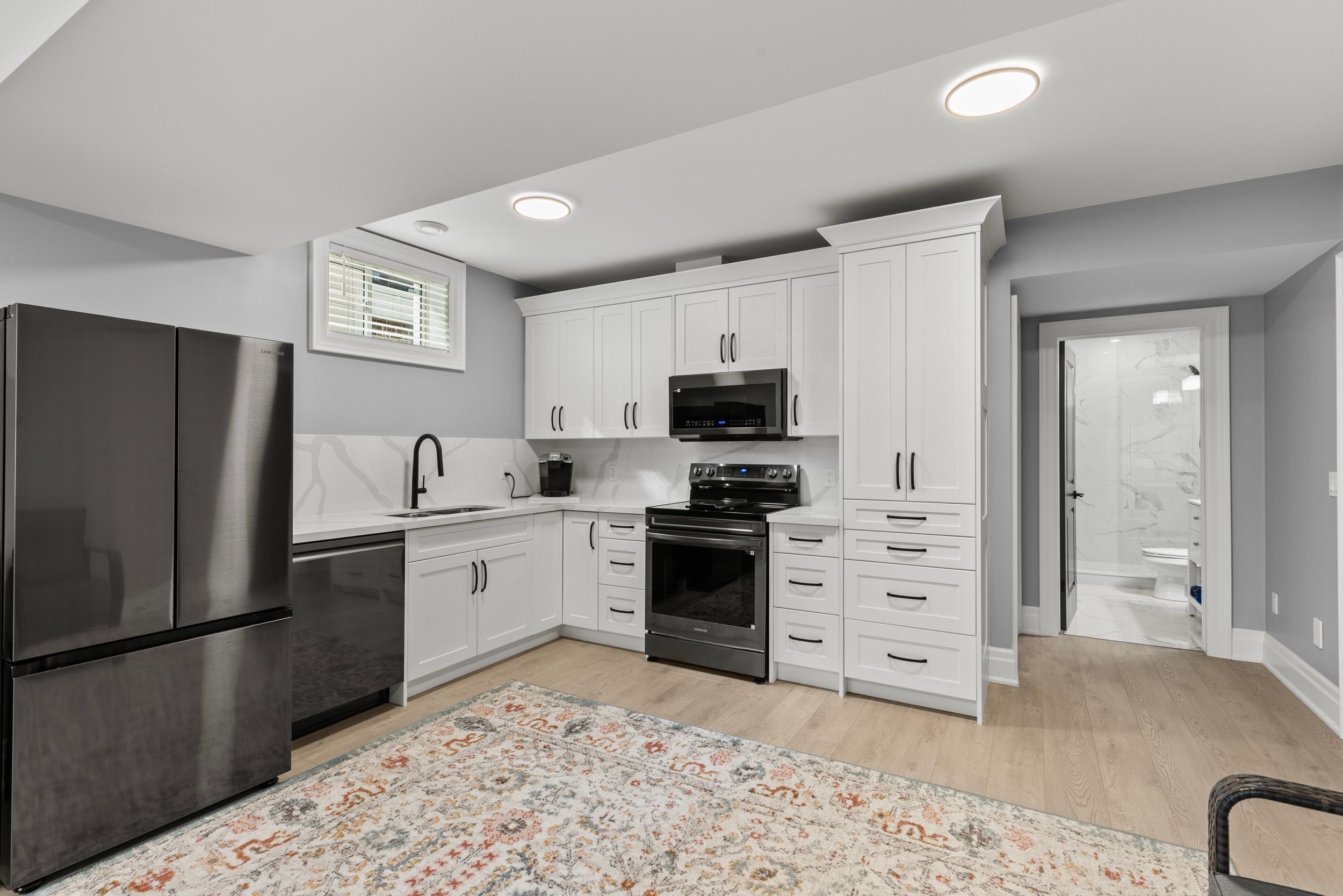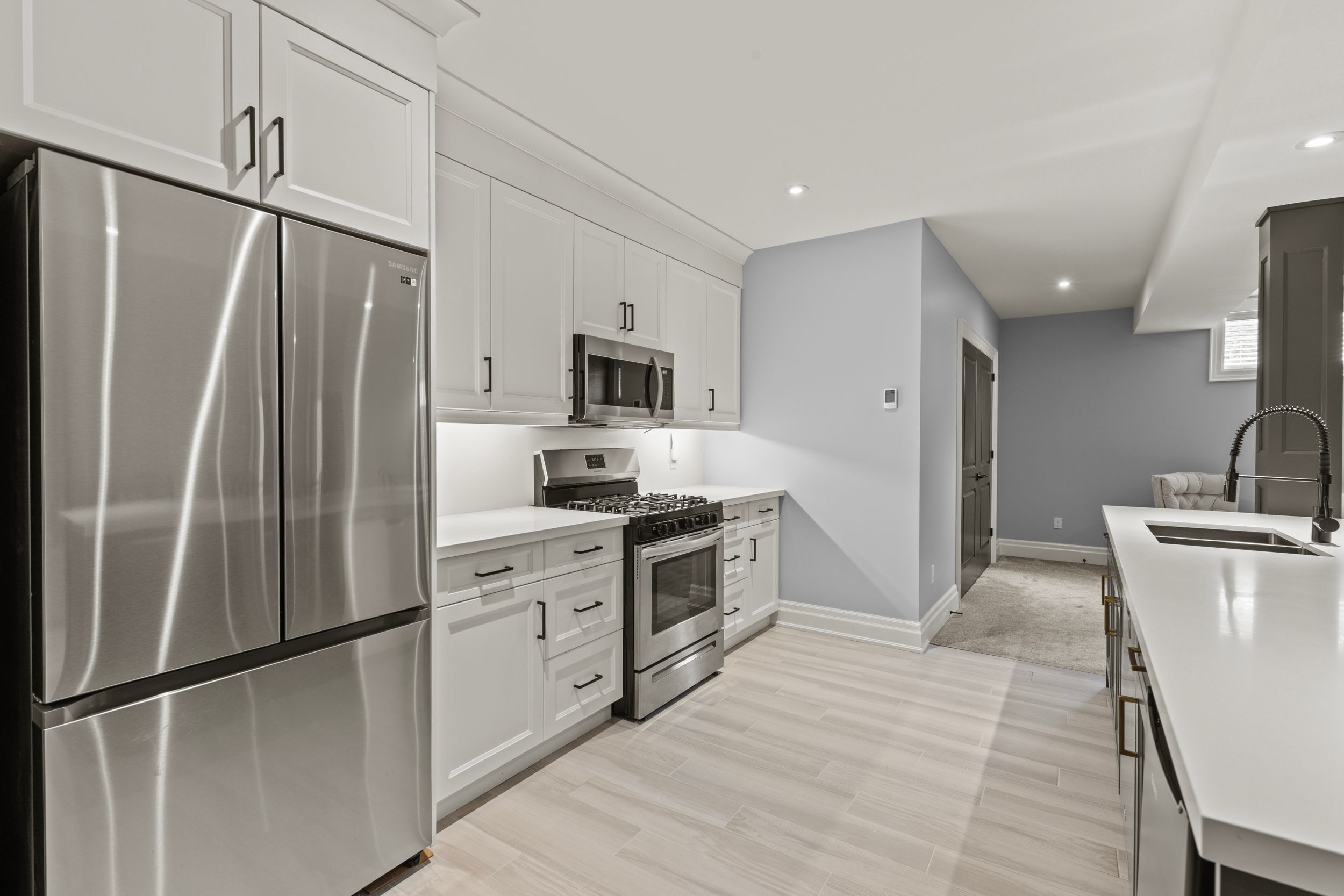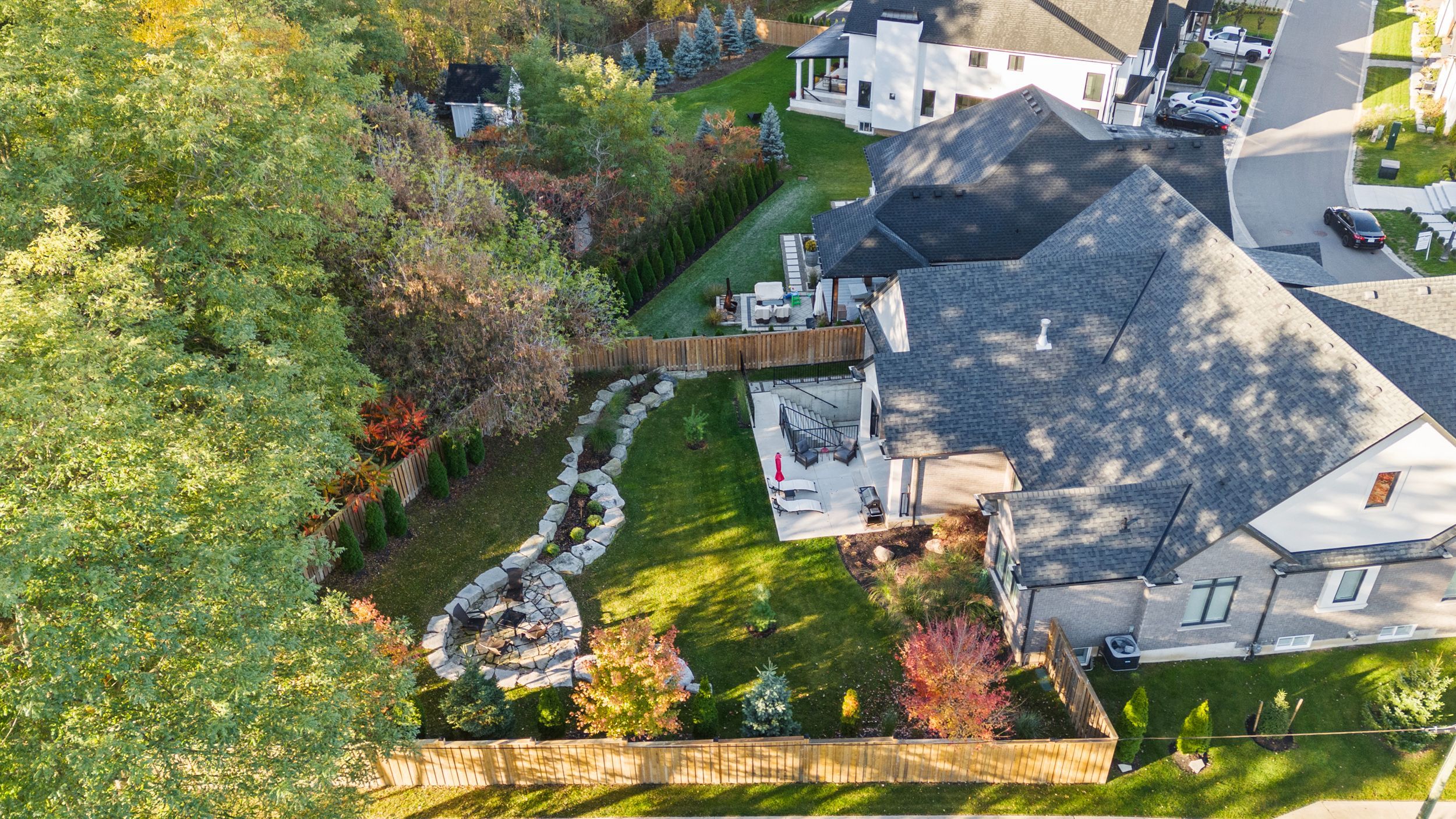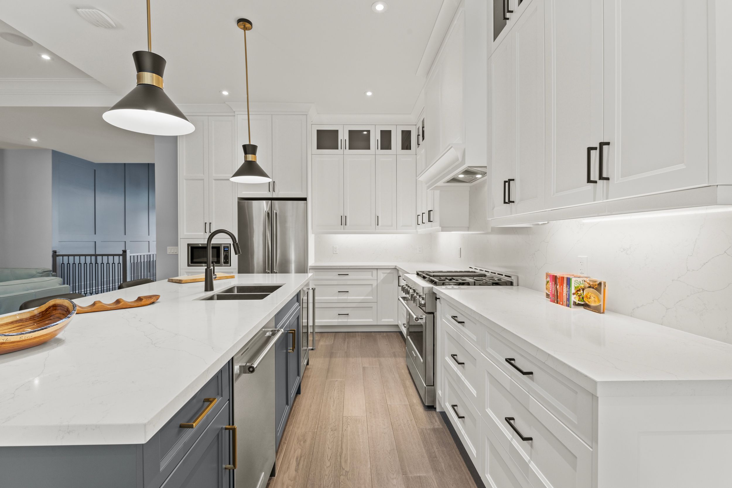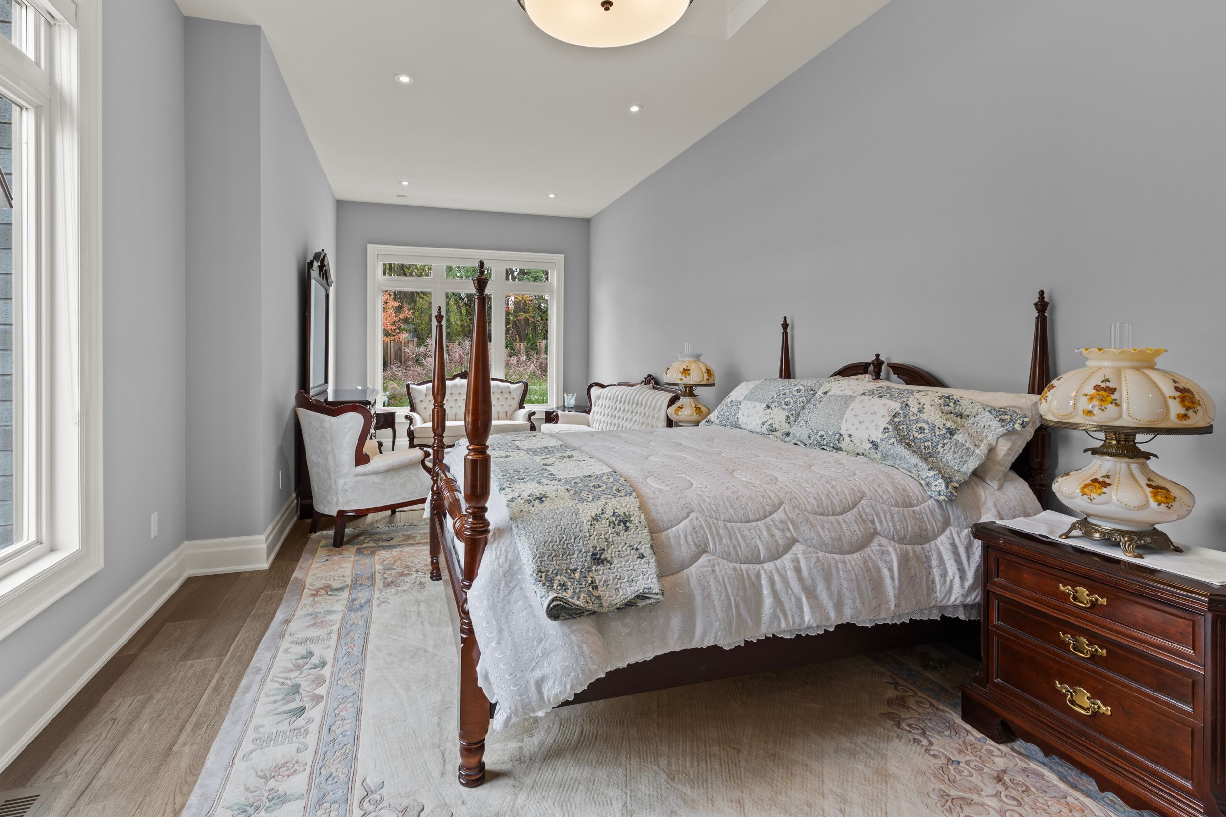 This luxury custom-built 2580 sqft bungalow offers exceptional craftsmanship, elegant design, and highly functional multi-generational living spaces throughout. Fully finished basement makes it nearly 5000 sqft finished! Designed with versatility and comfort in mind, the home features three complete kitchens each finished with custom cabinetry, quartz countertops, premium appliances (two gas ranges and one electric), three refrigerators, three dishwashers, and built-in microwaves-perfect for hosting large gatherings or offering private, independent living for extended family members. The main level showcases 12-foot coffered ceilings, engineered hardwood flooring, custom roller blinds, and beautifully appointed living areas highlighted by two gas fireplaces. For added everyday comfort, the home includes heated tile floors in three bathrooms and the lower-level kitchen. A self-contained 1-bedroom granny suite with its own entrance and dedicated parking provides privacy and flexibility, while the fully finished lower level includes two additional bedrooms, a full bathroom, a walk-out, and a spacious walk-in fruit cellar. The property features two full laundry rooms, each equipped with washer, dryer, laundry tub, and storage. Additional upgrades include russound integrated sound and satellite wiring, a full security camera and alarm system with monitoring option, and an in-ground sprinkler system for effortless exterior upkeep. The home is fully fenced, professionally landscaped with thoughtful rock and garden design, and includes a covered outdoor porch to enjoy peaceful surroundings in every season. Every detail - from cabinetry to ceiling design to layout functionality - reflects the care put into creating a home that is both luxurious and deeply livable. This is a rare offering that combines elevated finishes, spacious design, and true multi-use living under one roof, providing comfort, privacy, and long-term value for its next owner.