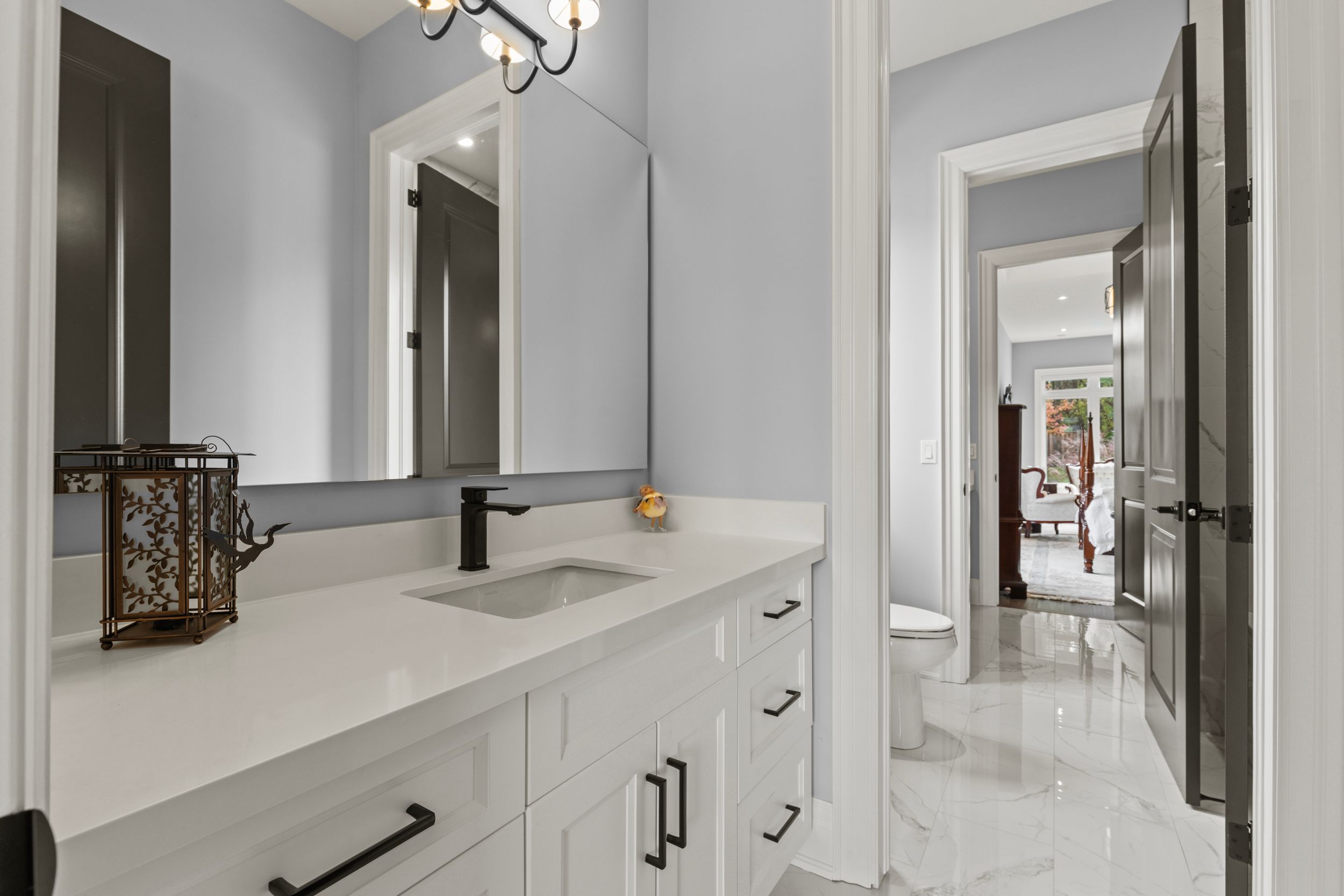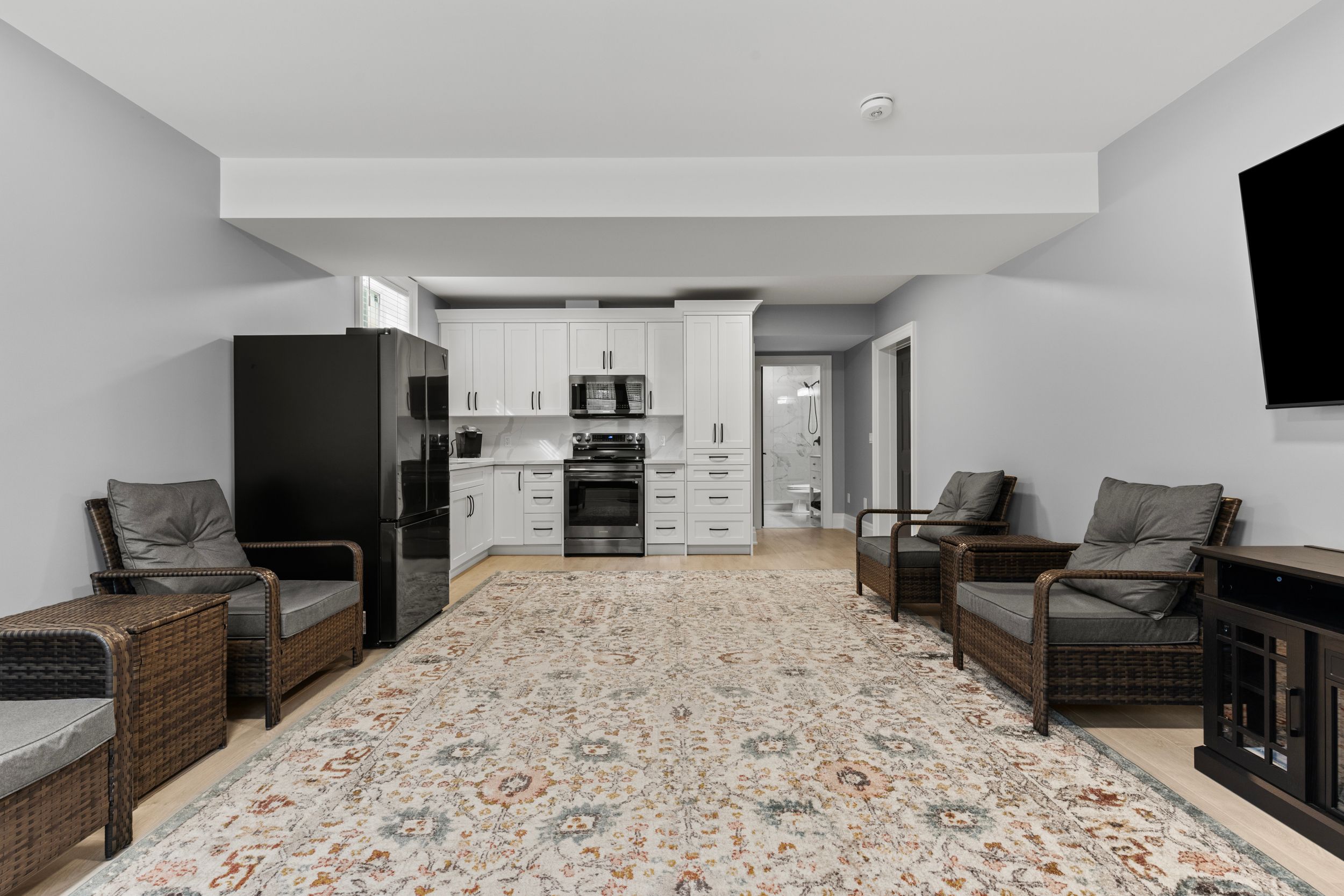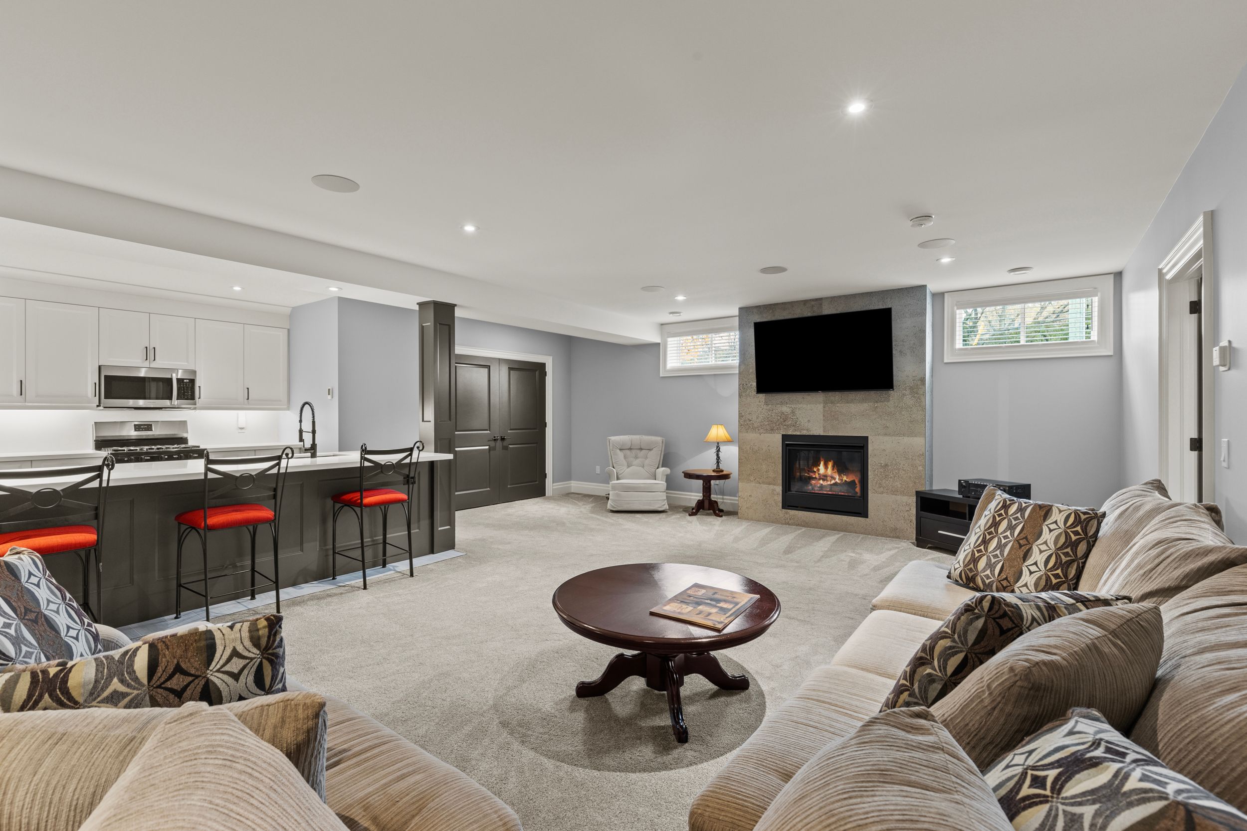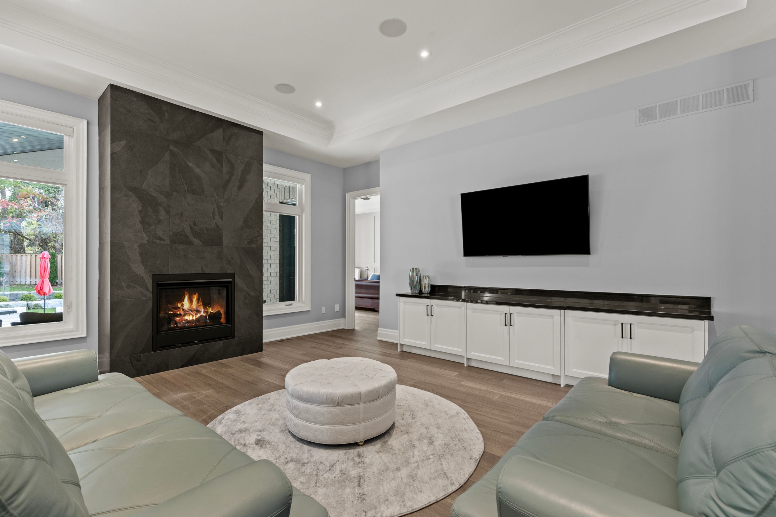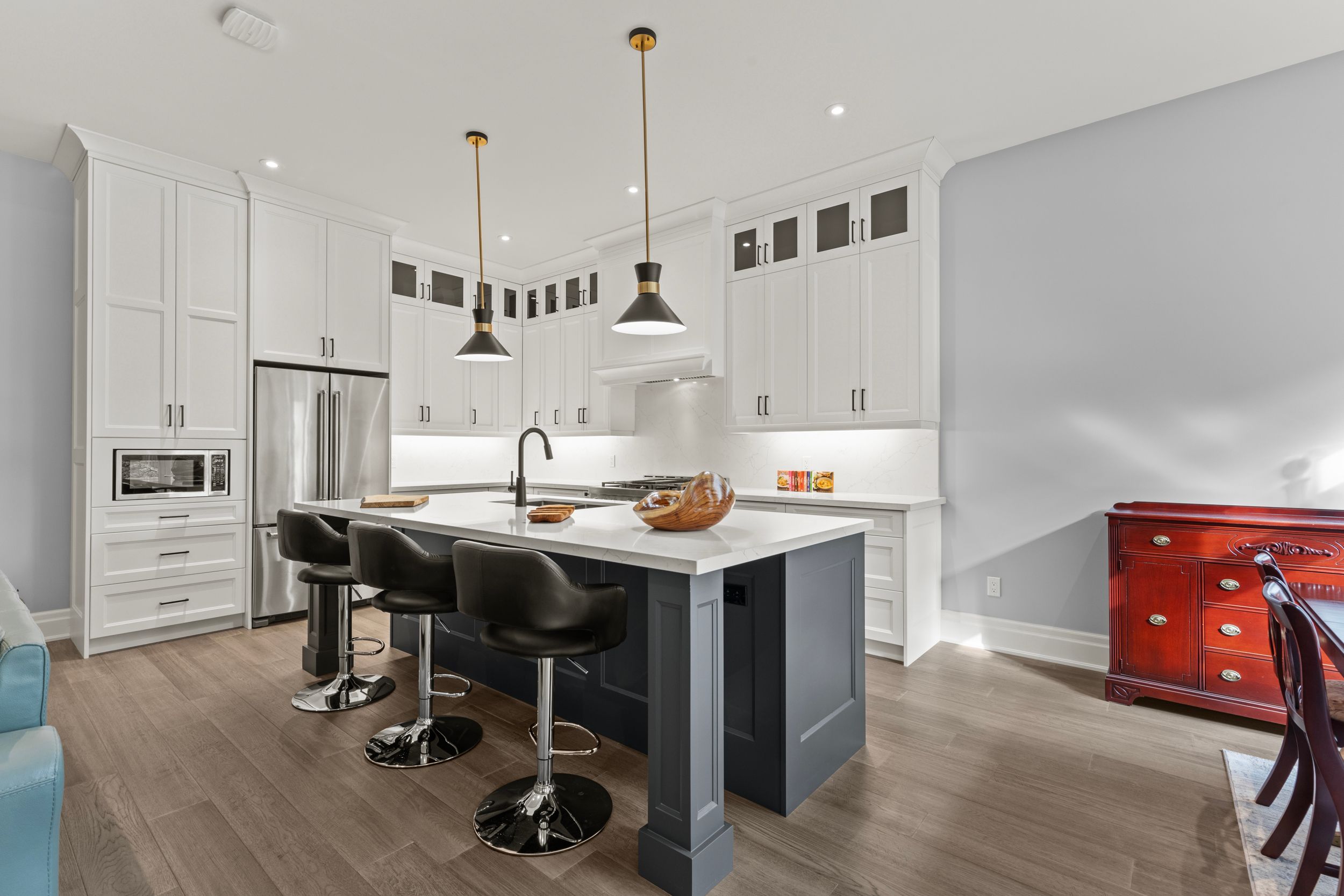 This luxury custom-built 2580 sqft bungalow offers exceptional craftsmanship, elegant design, and highly functional multi-generational living spaces throughout. Fully finished basement makes it nearly 5000 sqft finished! Designed with versatility and comfort in mind, the home features three complete kitchens each finished with custom cabinetry, quartz countertops, premium appliances (two gas ranges and one electric), three refrigerators, three dishwashers, and built-in microwaves-perfect for hosting large gatherings or offering private, independent living for extended family members. The main level showcases 12-foot coffered ceilings, engineered hardwood flooring, custom roller blinds, and beautifully appointed living areas highlighted by two gas fireplaces. For added everyday comfort, the home includes heated tile floors in three bathrooms and the lower-level kitchen. A self-contained 1-bedroom granny suite with its own entrance and dedicated parking provides privacy and flexibility, while the fully finished lower level includes two additional bedrooms, a full bathroom, a walk-out, and a spacious walk-in fruit cellar. The property features two full laundry rooms, each equipped with washer, dryer, laundry tub, and storage. Additional upgrades include russound integrated sound and satellite wiring, a full security camera and alarm system with monitoring option, and an in-ground sprinkler system for effortless exterior upkeep. The home is fully fenced, professionally landscaped with thoughtful rock and garden design, and includes a covered outdoor porch to enjoy peaceful surroundings in every season. Every detail - from cabinetry to ceiling design to layout functionality - reflects the care put into creating a home that is both luxurious and deeply livable. This is a rare offering that combines elevated finishes, spacious design, and true multi-use living under one roof, providing comfort, privacy, and long-term value for its next owner.
