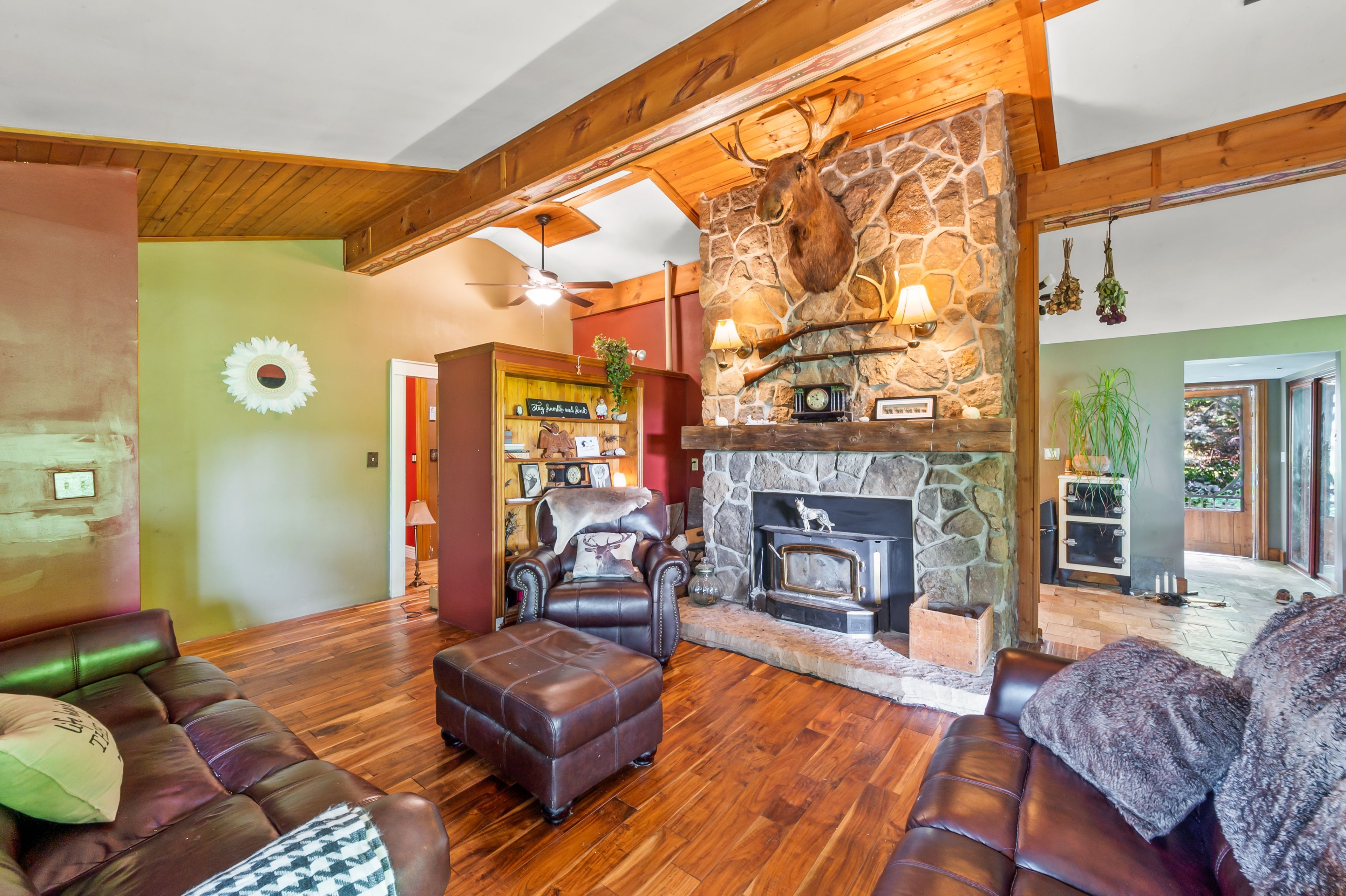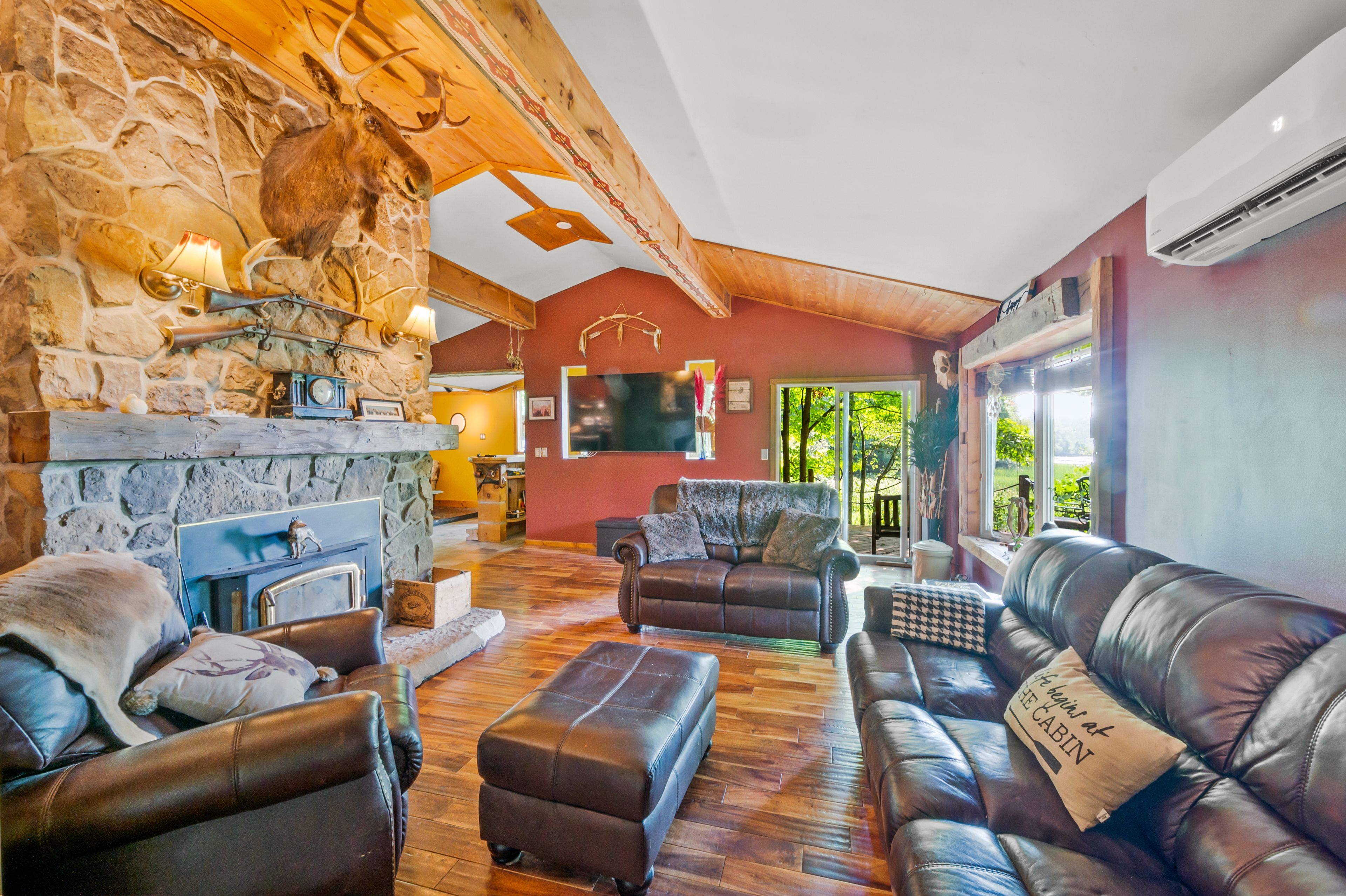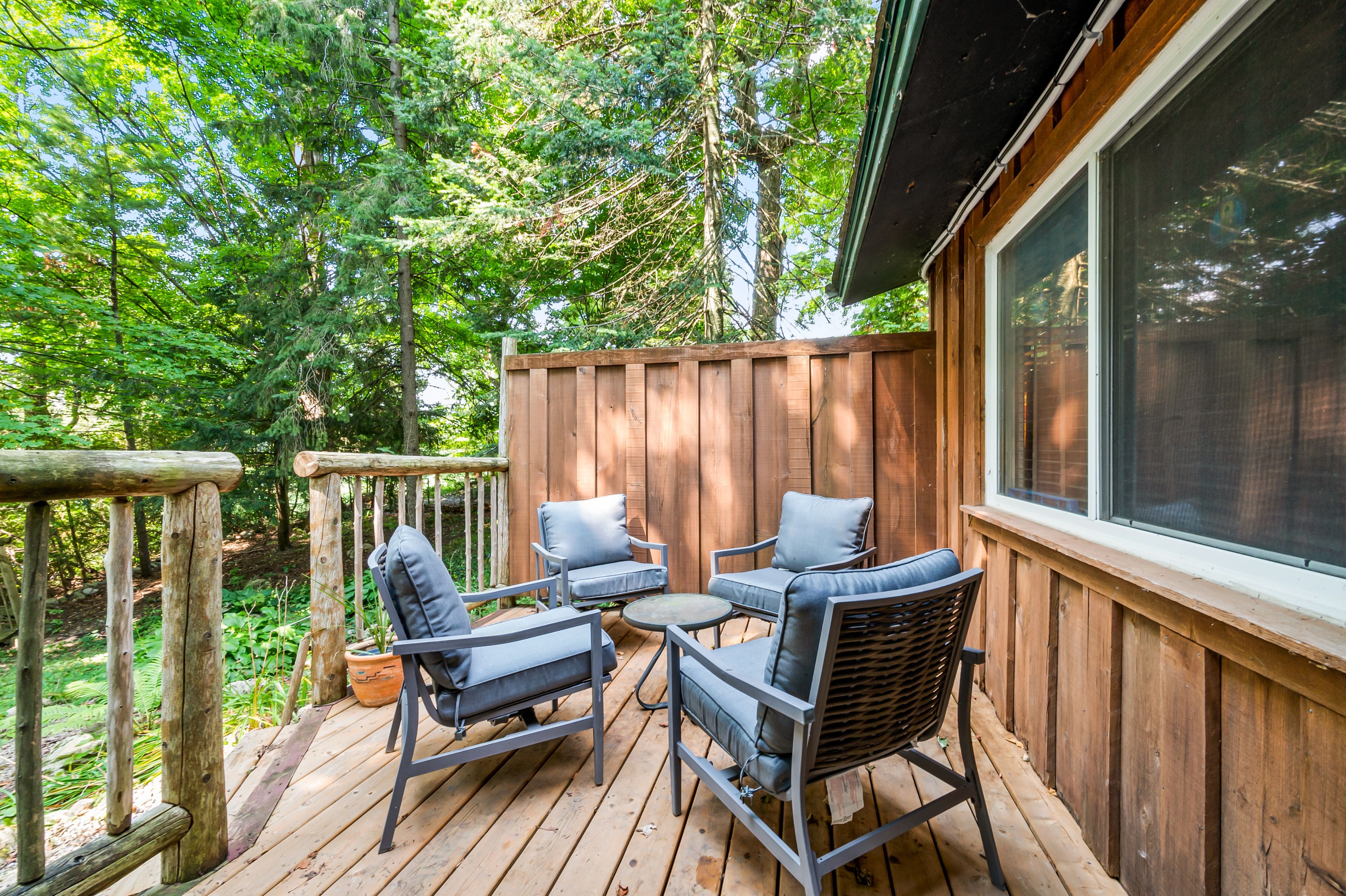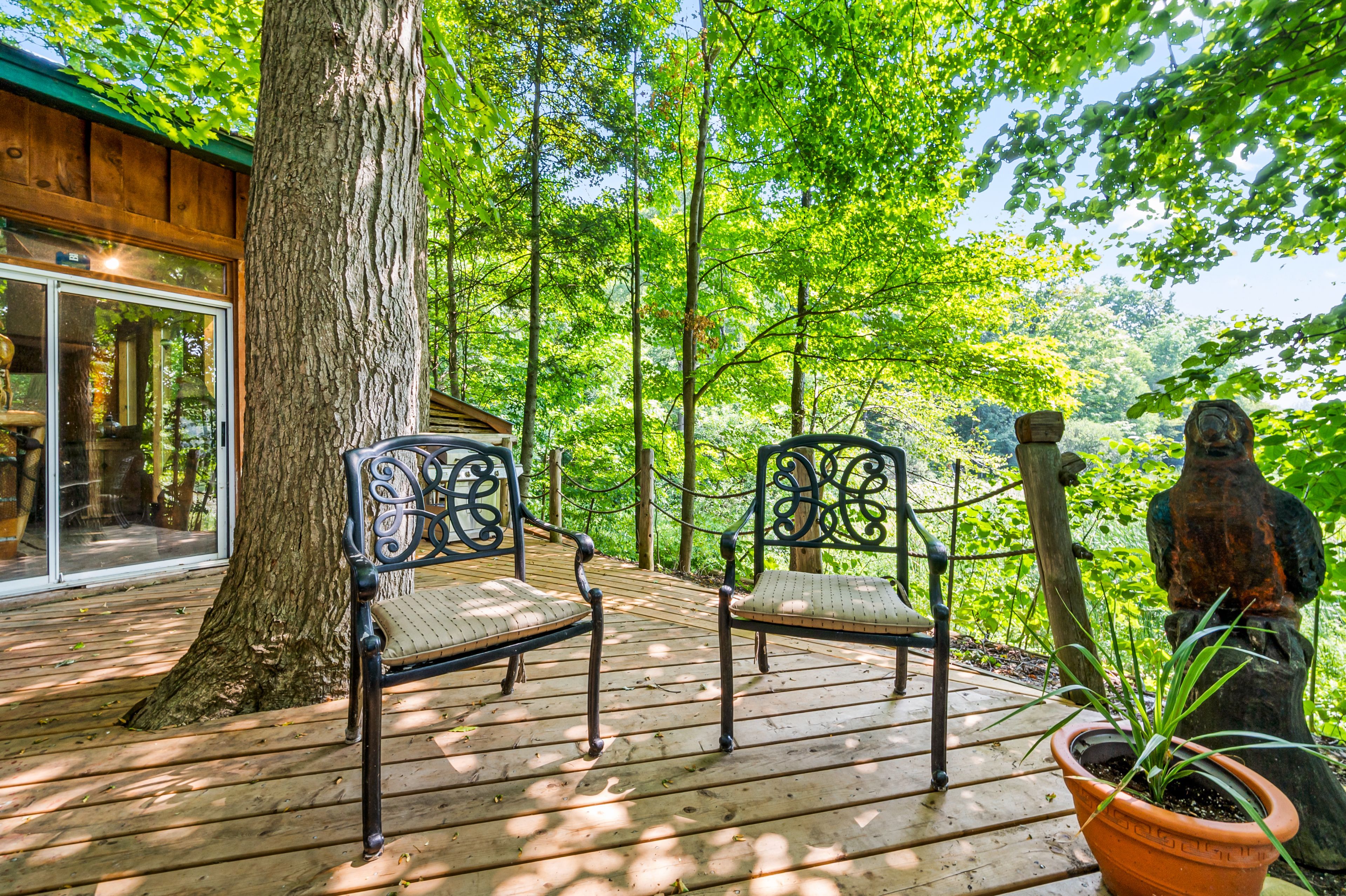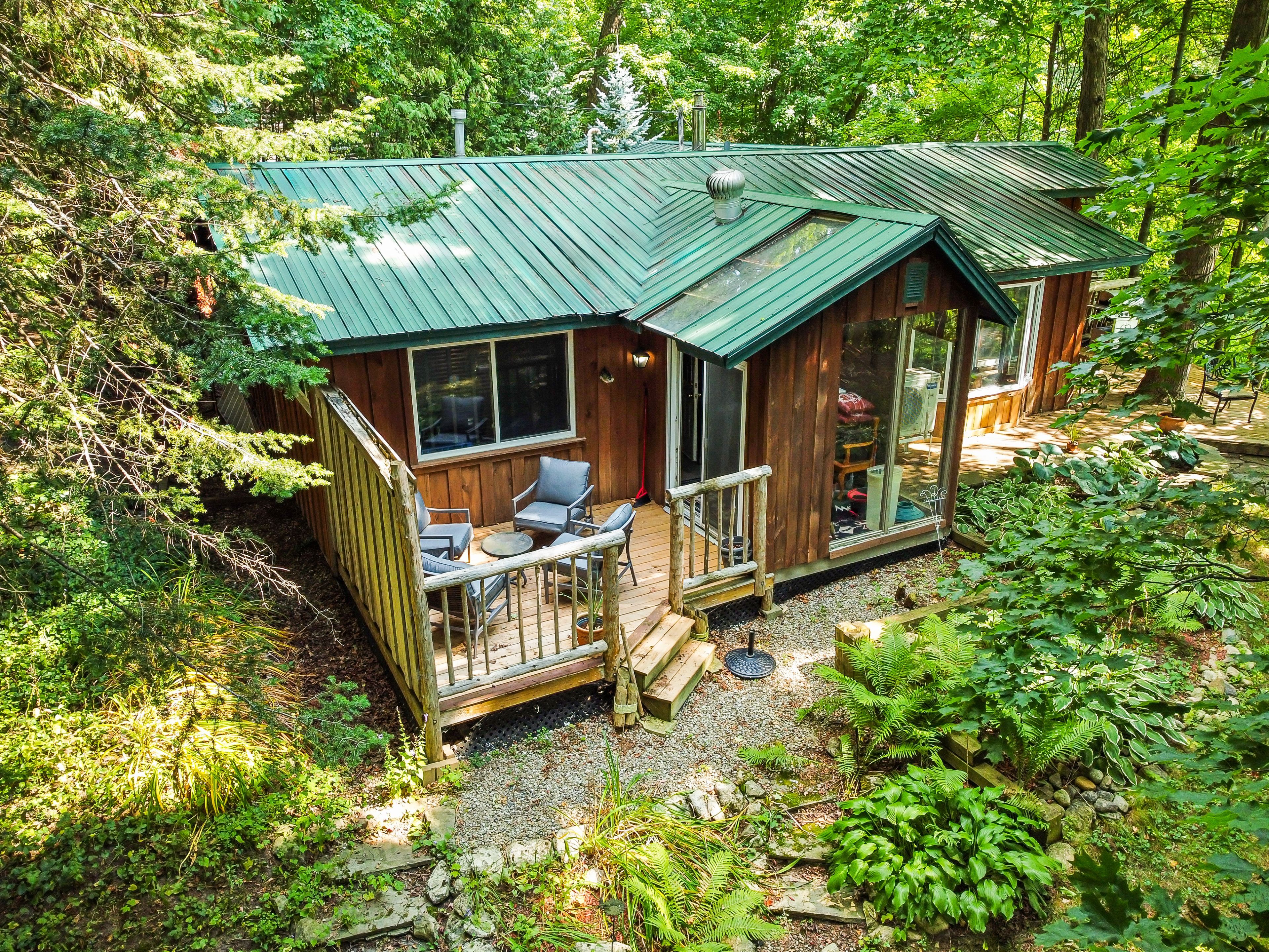 Tucked away in the coveted roman lake community, this rustic yet refined bungalow offers the ultimate private escape. Whether you're searching for a peaceful weekend hideaway or a place to call home year-round, it's a setting that soothes the soul. Wake to serene lake vistas framed by mature trees, where deer, birds, and other wildlife create a living backdrop. Inside, you're welcomed with soaring vaulted ceilings, an updated kitchen, and an inviting blend of hardwood and slate underfoot. A built-in bar area takes full advantage of sweeping views, making every coffee or cocktail feel special. In the spa-inspired bathroom, heated floors add a touch of indulgence, while a corner jacuzzi-style tub and sleek glass walk-in shower promise relaxation at the end of the day or a refreshing start in the morning. Keep cozy with two fireplaces or rely on the efficiency of a forced air furnace when the seasons shift. Multiple windows let in generous natural light, accenting the warm wood finishes throughout. Step outside and the magic continues. Expansive decks, a private patio, and a charming detached log cabin with hydro provide endless opportunities for hosting, lounging, or simply enjoying the calm. One of the practical perks of the home is the hookup for a backup generator. Situated just minutes from the village of hillsburgh, which offers small-town charm with welcoming shops, local eateries, and a friendly, walkable main street. For commuters, the location is just a short drive to erin, orangeville, and guelph, with easy access to georgetown, milton, and brampton, making it a comfortable commute to the gta.