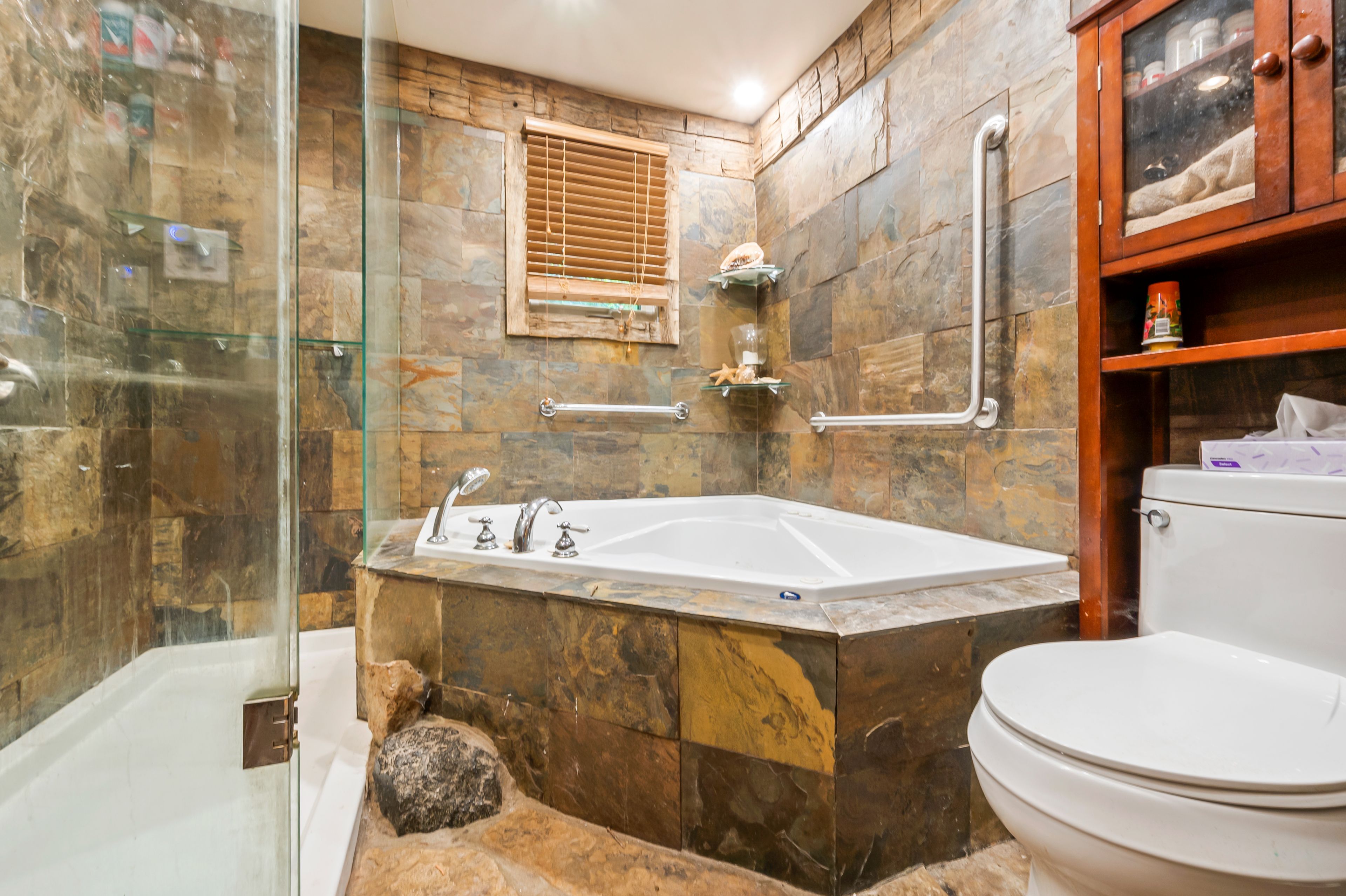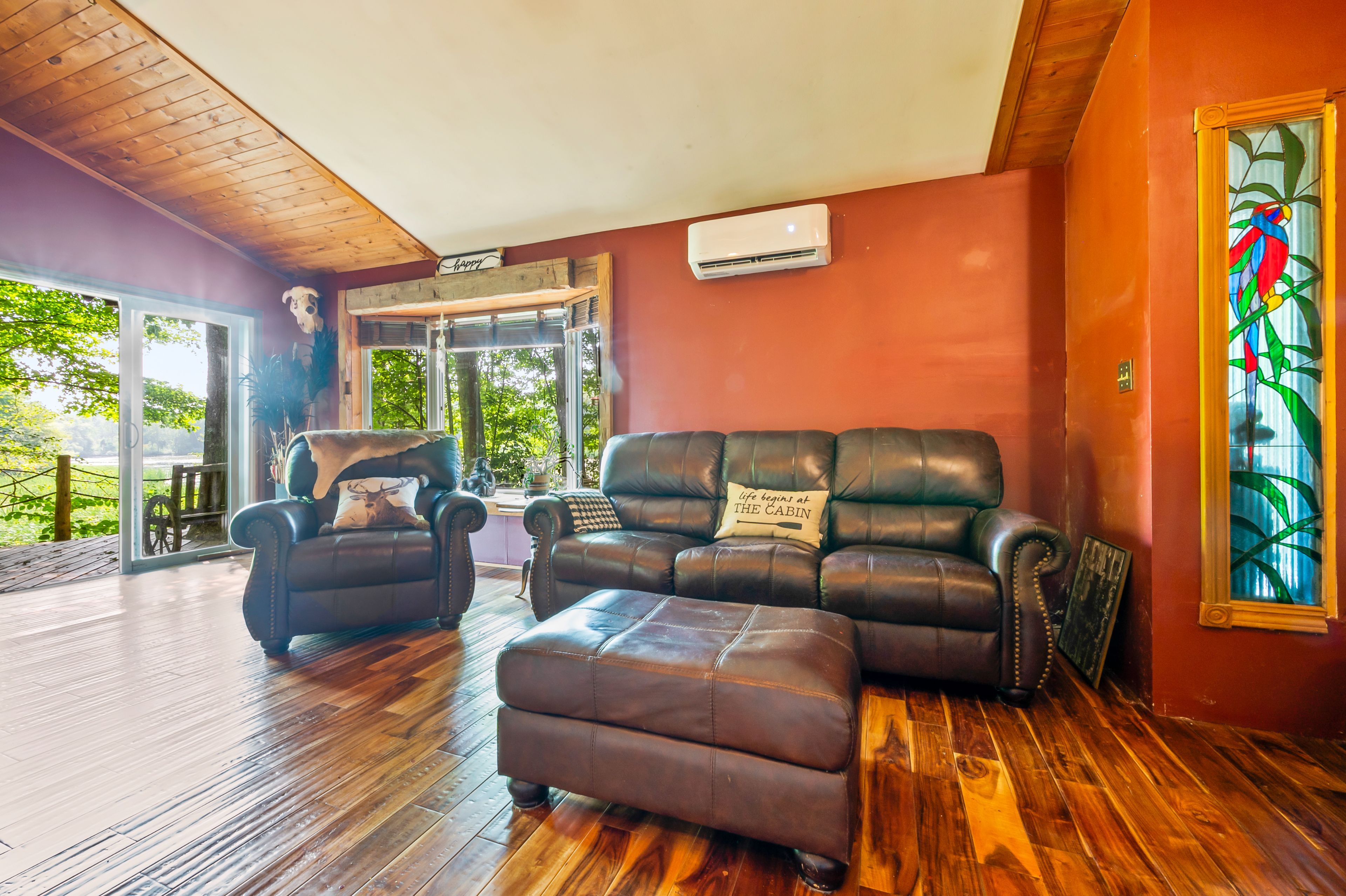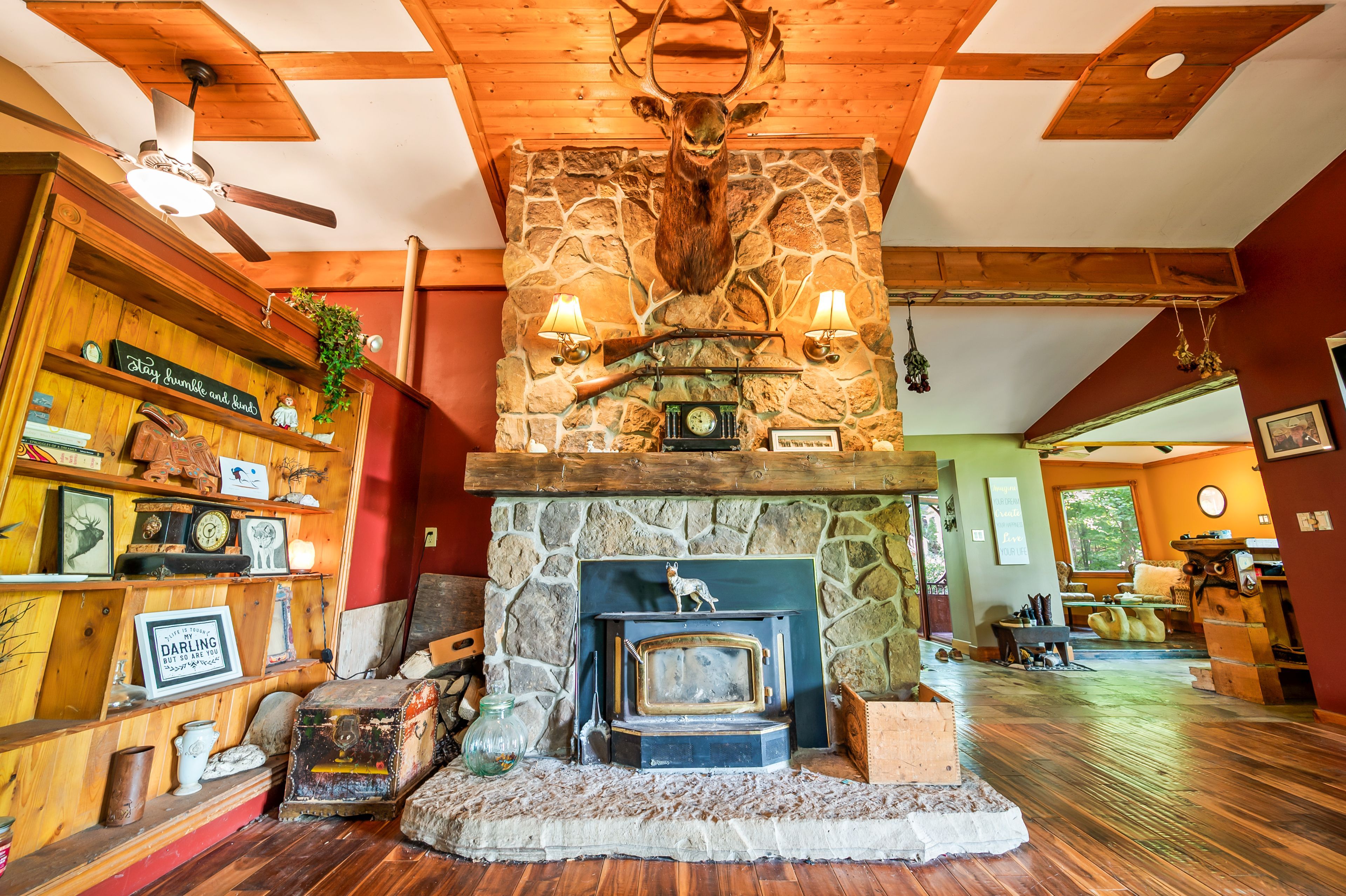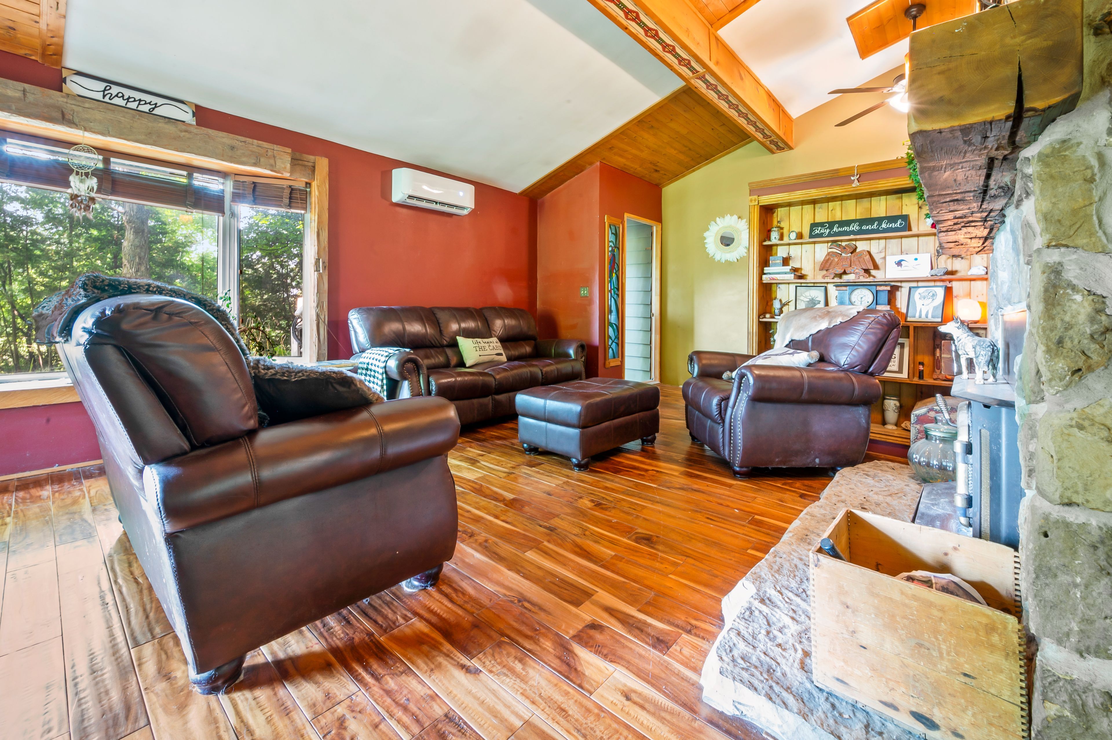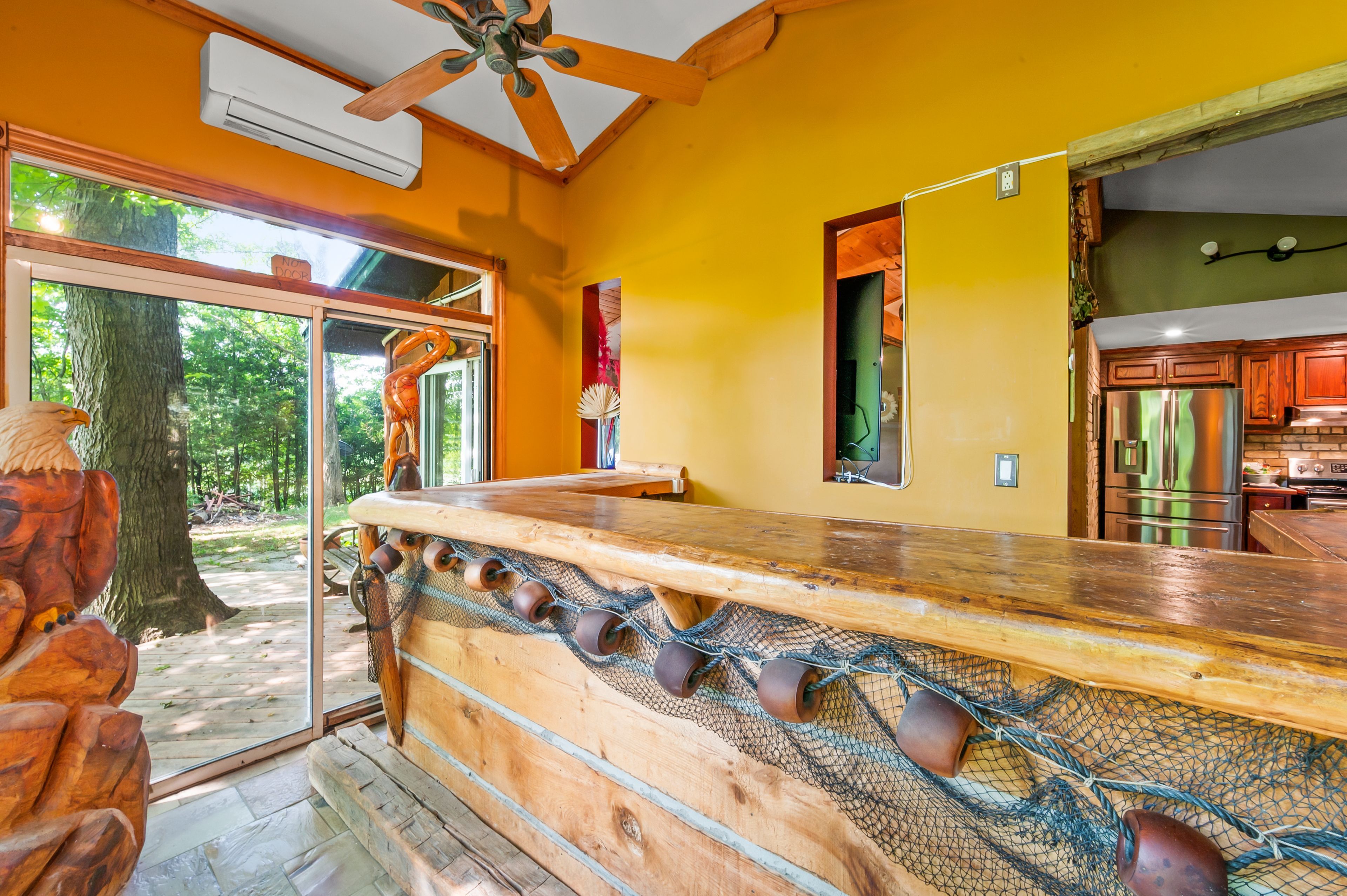 Tucked away in the coveted roman lake community, this rustic yet refined bungalow offers the ultimate private escape. Whether you're searching for a peaceful weekend hideaway or a place to call home year-round, it's a setting that soothes the soul. Wake to serene lake vistas framed by mature trees, where deer, birds, and other wildlife create a living backdrop. Inside, you're welcomed with soaring vaulted ceilings, an updated kitchen, and an inviting blend of hardwood and slate underfoot. A built-in bar area takes full advantage of sweeping views, making every coffee or cocktail feel special. In the spa-inspired bathroom, heated floors add a touch of indulgence, while a corner jacuzzi-style tub and sleek glass walk-in shower promise relaxation at the end of the day or a refreshing start in the morning. Keep cozy with two fireplaces or rely on the efficiency of a forced air furnace when the seasons shift. Multiple windows let in generous natural light, accenting the warm wood finishes throughout. Step outside and the magic continues. Expansive decks, a private patio, and a charming detached log cabin with hydro provide endless opportunities for hosting, lounging, or simply enjoying the calm. One of the practical perks of the home is the hookup for a backup generator. Situated just minutes from the village of hillsburgh, which offers small-town charm with welcoming shops, local eateries, and a friendly, walkable main street. For commuters, the location is just a short drive to erin, orangeville, and guelph, with easy access to georgetown, milton, and brampton, making it a comfortable commute to the gta.