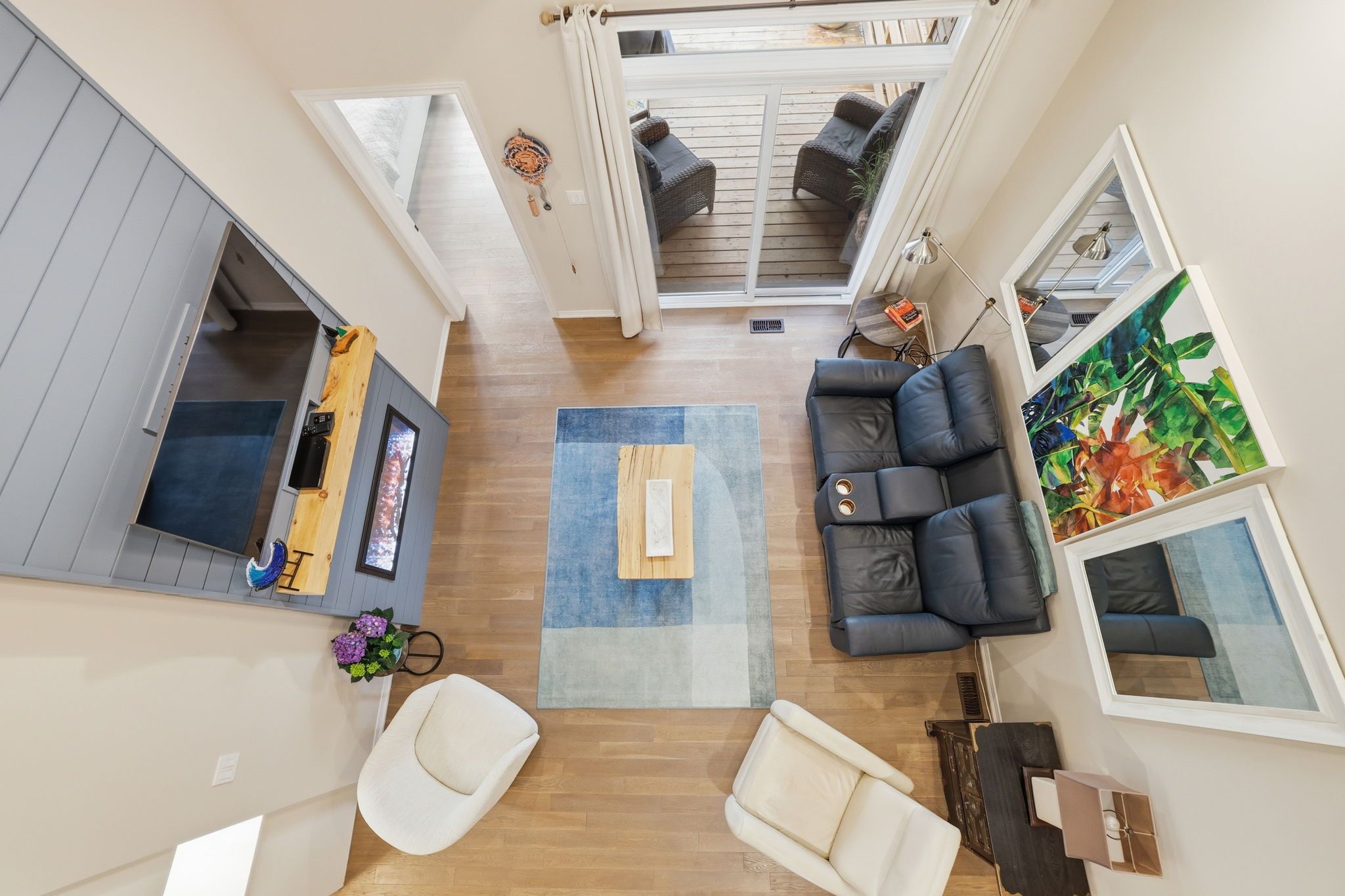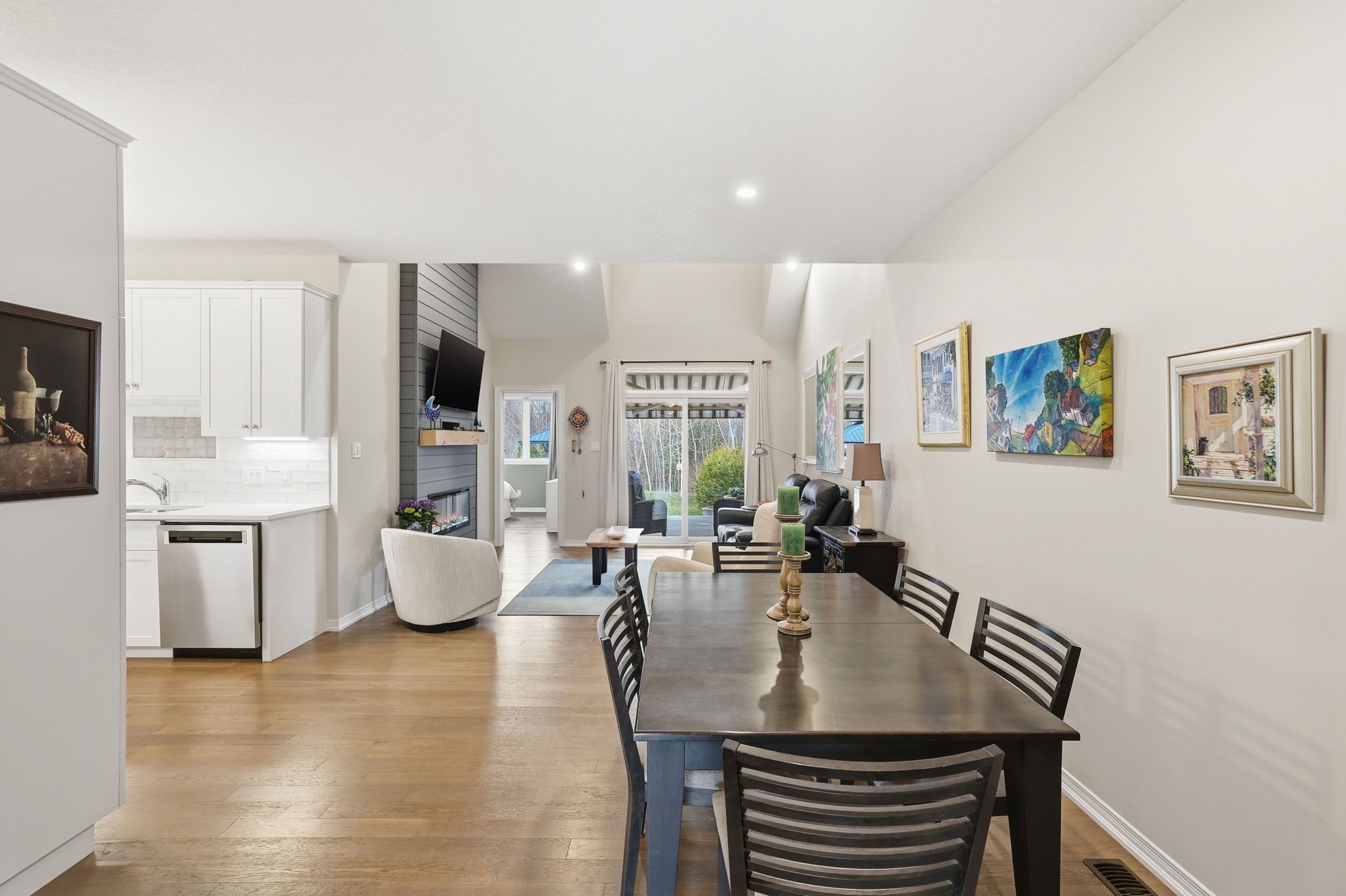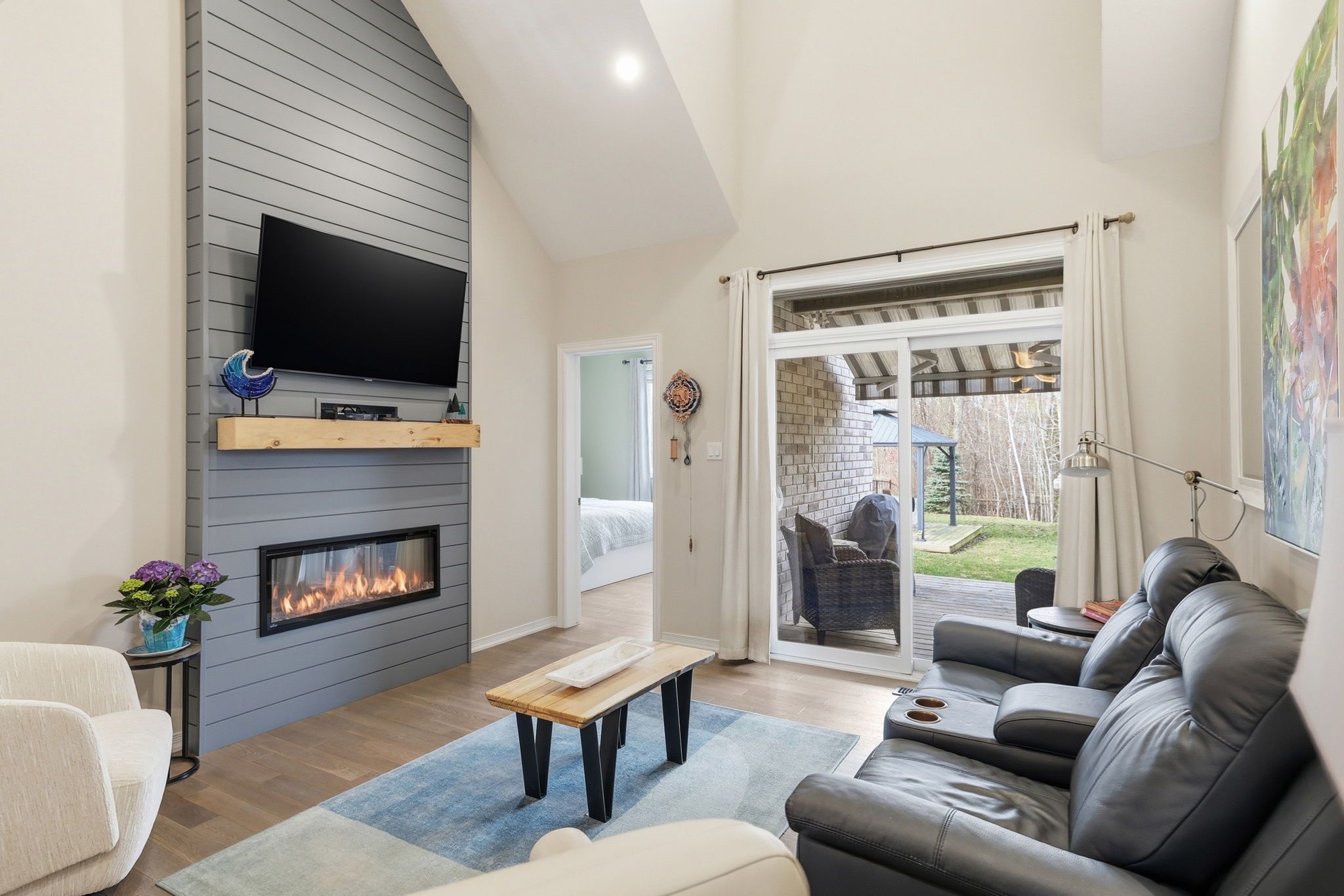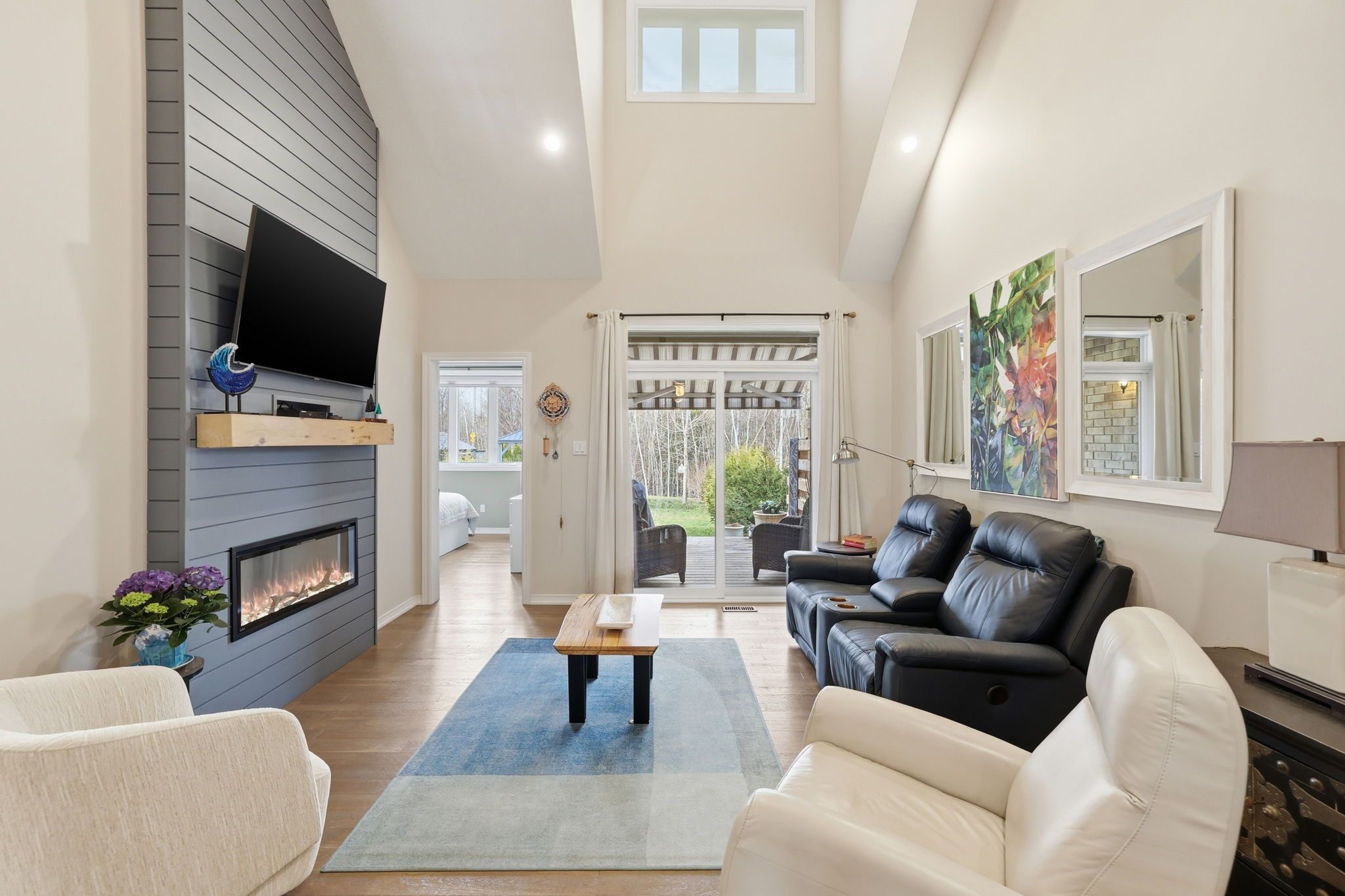 • Bright open-concept living space with soaring vaulted ceilings and oak hardwood.