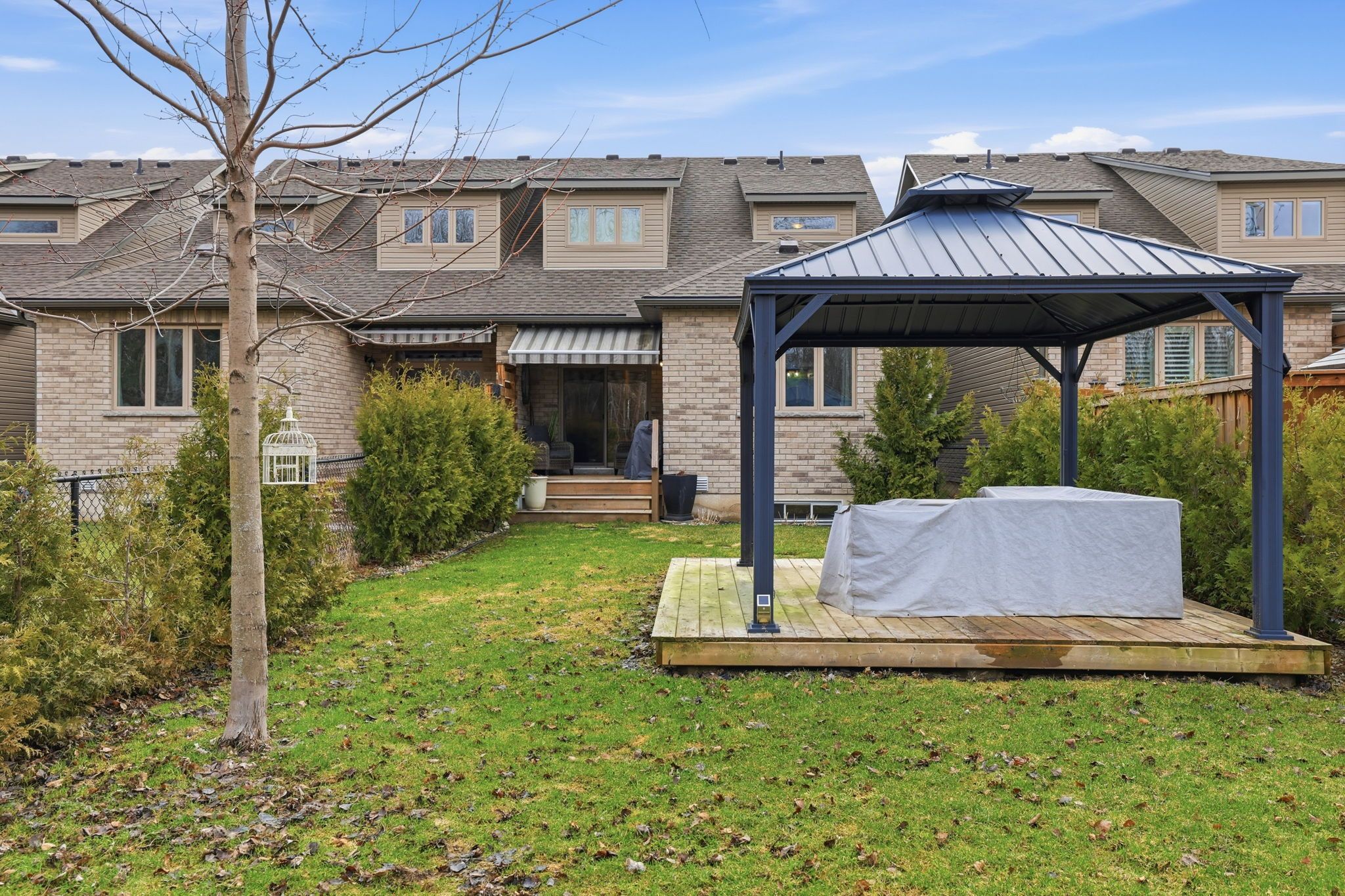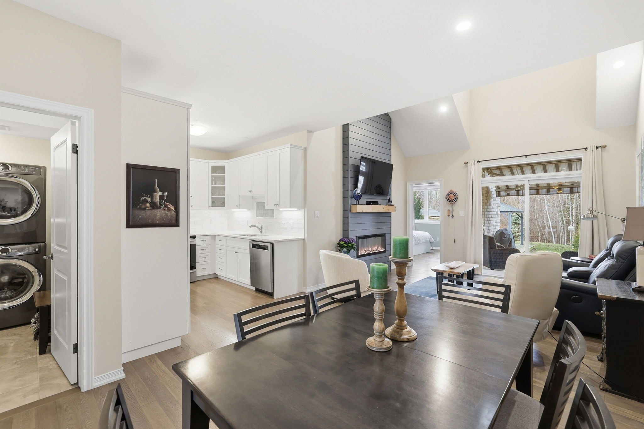 Stunning sunvale bungaloft townhome set on an extra-deep premium lot backing onto the scenic railway trail and a serene forested area. Designed for effortless main-floor living, this home features a bright open-concept kitchen, dining, and living space highlighted by a soaring vaulted ceiling, oak hardwood flooring and a beautiful fireplace as the focal point. The living area seamlessly extends to a covered porch-perfect for relaxing or entertaining-while a separate deck overlooks the beautifully landscaped, expansive backyard. The main-floor primary suite offers a walk-in closet, a 4-piece ensuite, and peaceful views of the lush rear yard. Upstairs, a lofted space open to below creates an airy feel and is complemented by a dedicated office, two additional bedrooms, and a 4-piece bathroom-ideal for family or guests. Additional features include a 1. 5 car garage with inside entry, parking for two vehicles in the driveway, main floor laundry and a full unfinished basement ready for your customization. Ideally located close to downtown collingwood, local schools, and an abundance of trails, this home offers the perfect blend of comfort, style, and convenience.