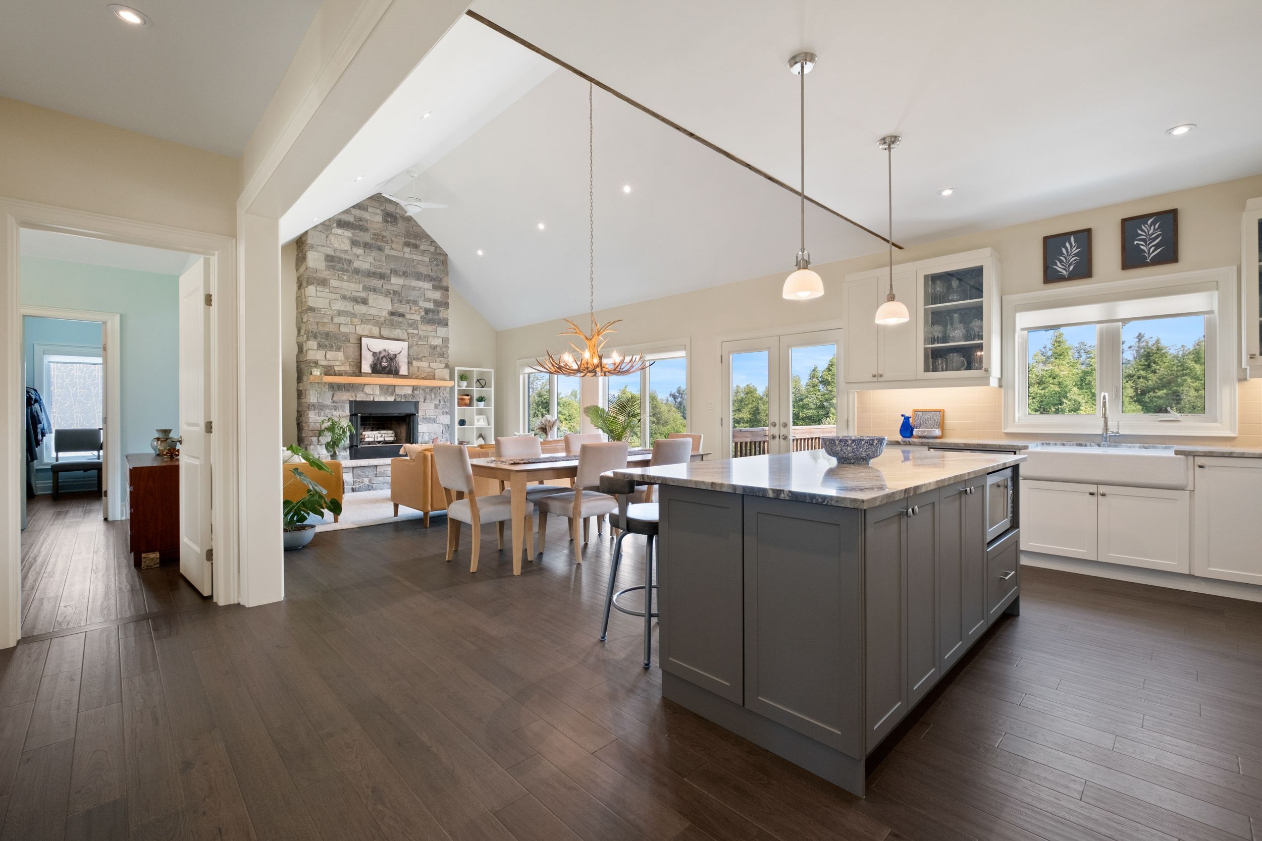 • Great room features vaulted ceilings and a stone wood-burning fireplace.