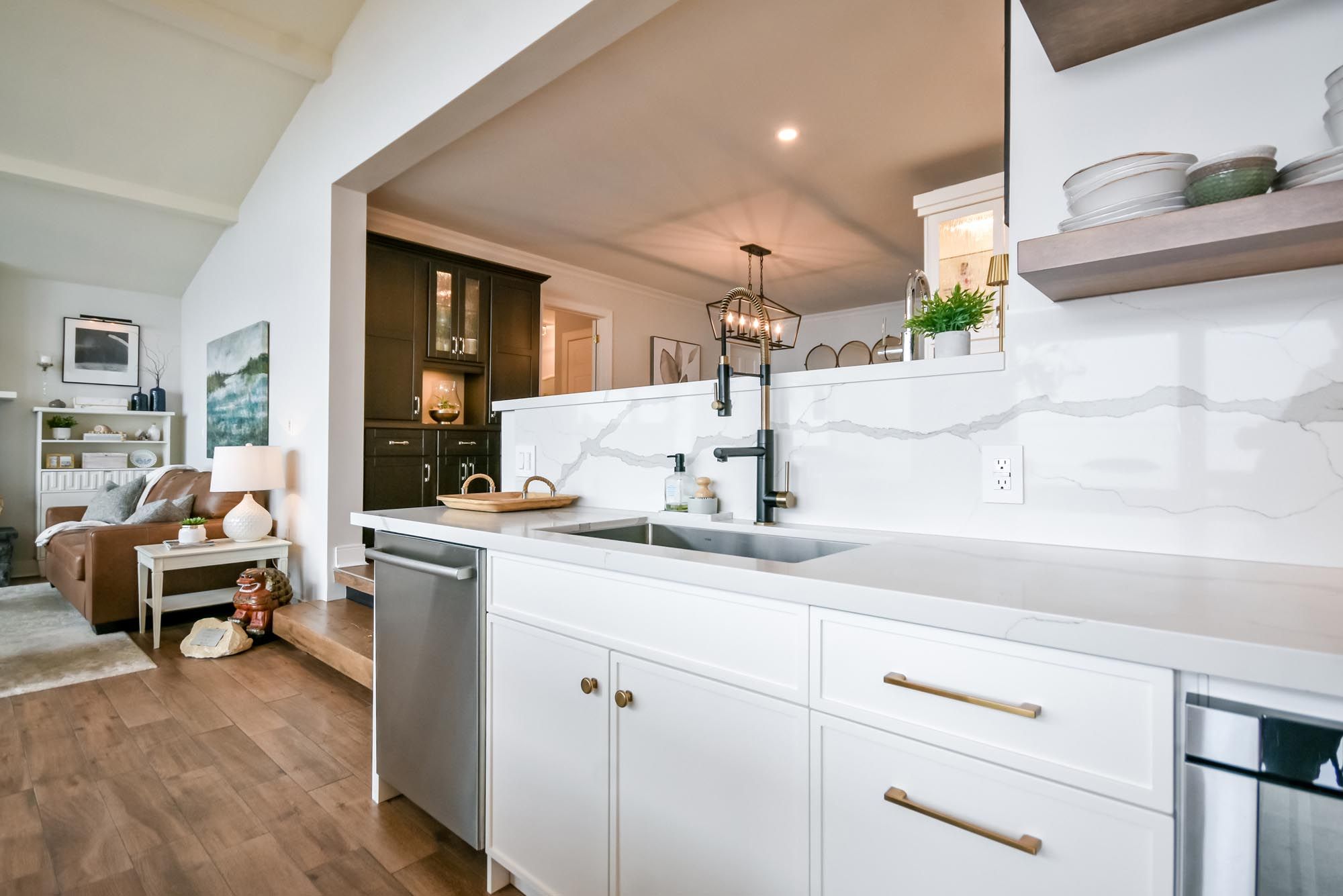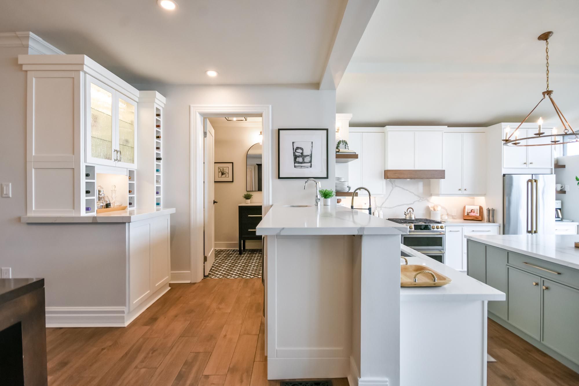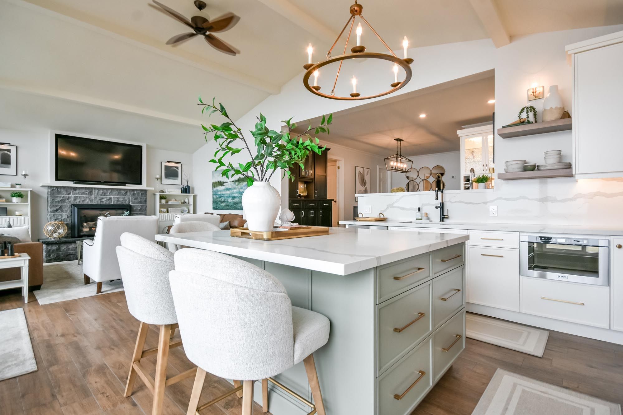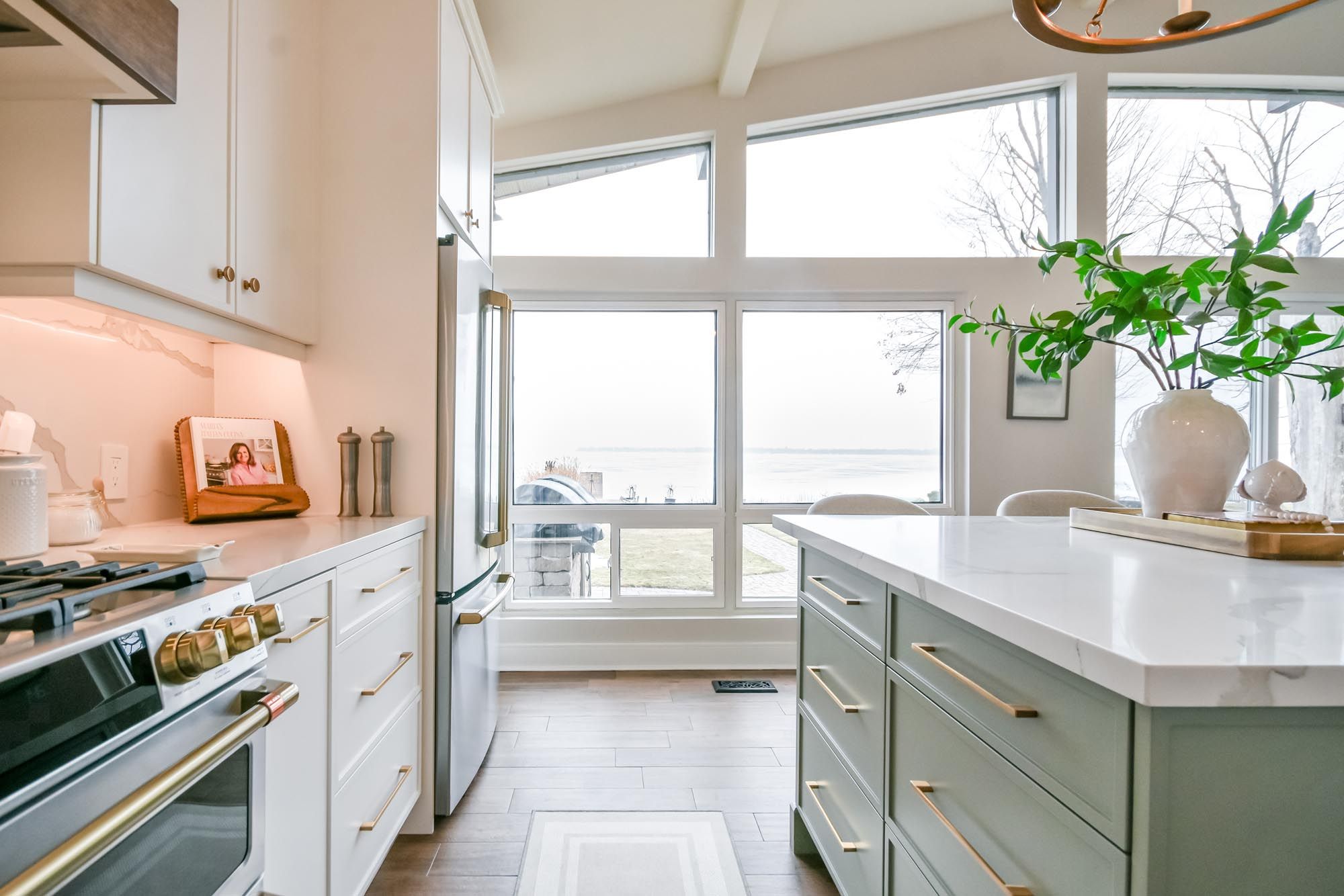 • Bright kitchen with quartz counters, island, and premium appliances.