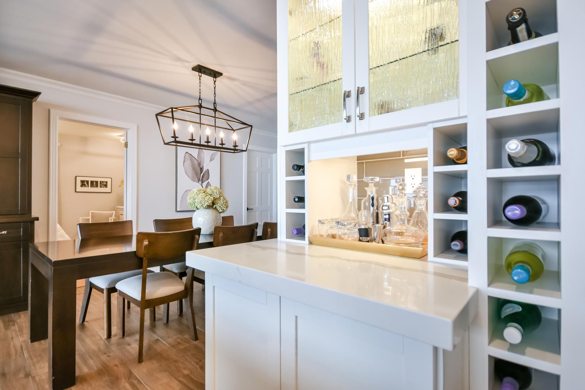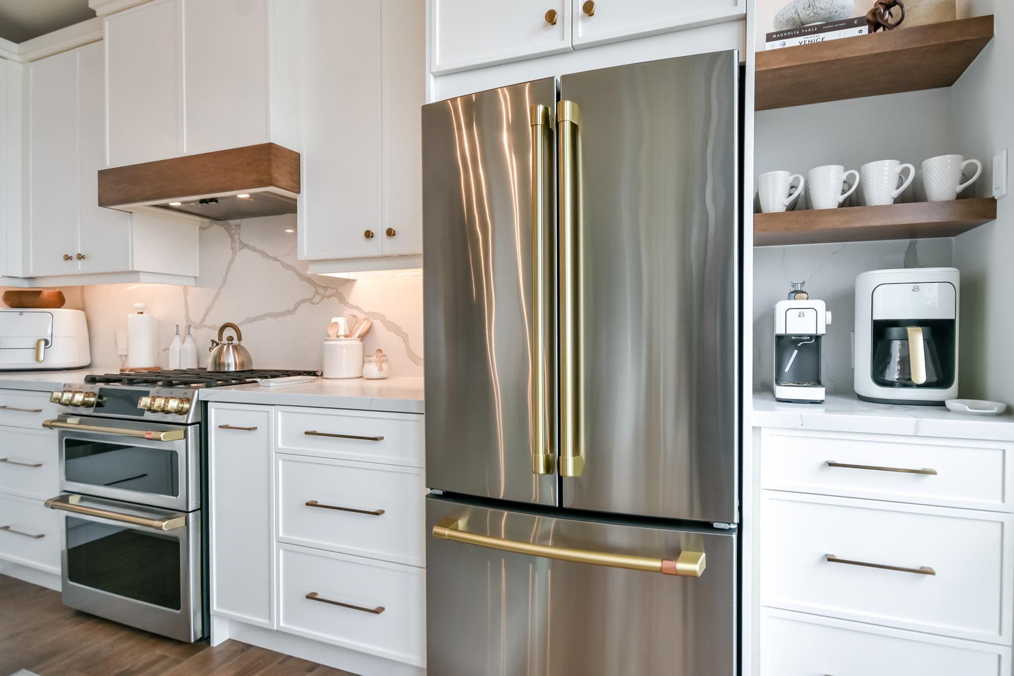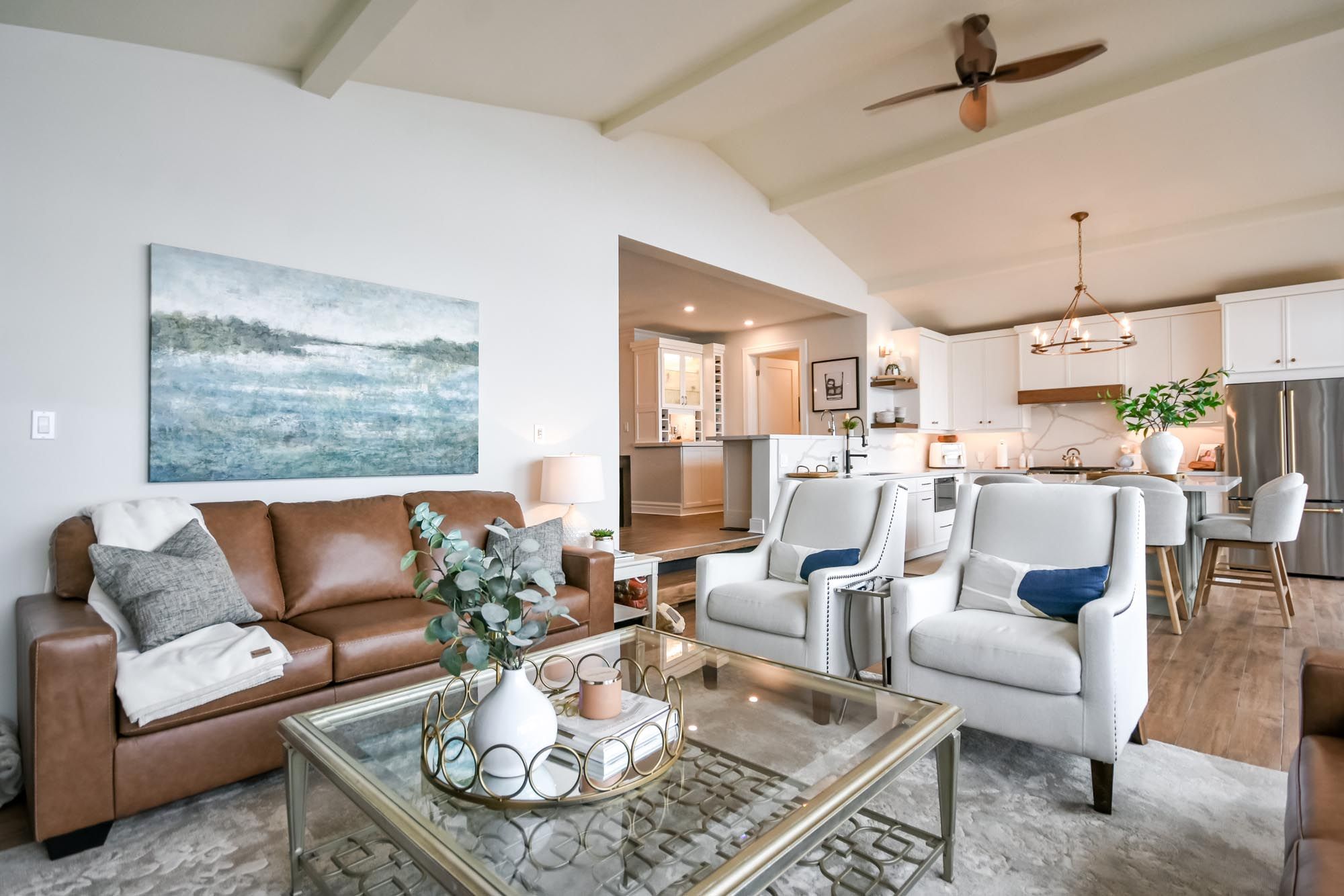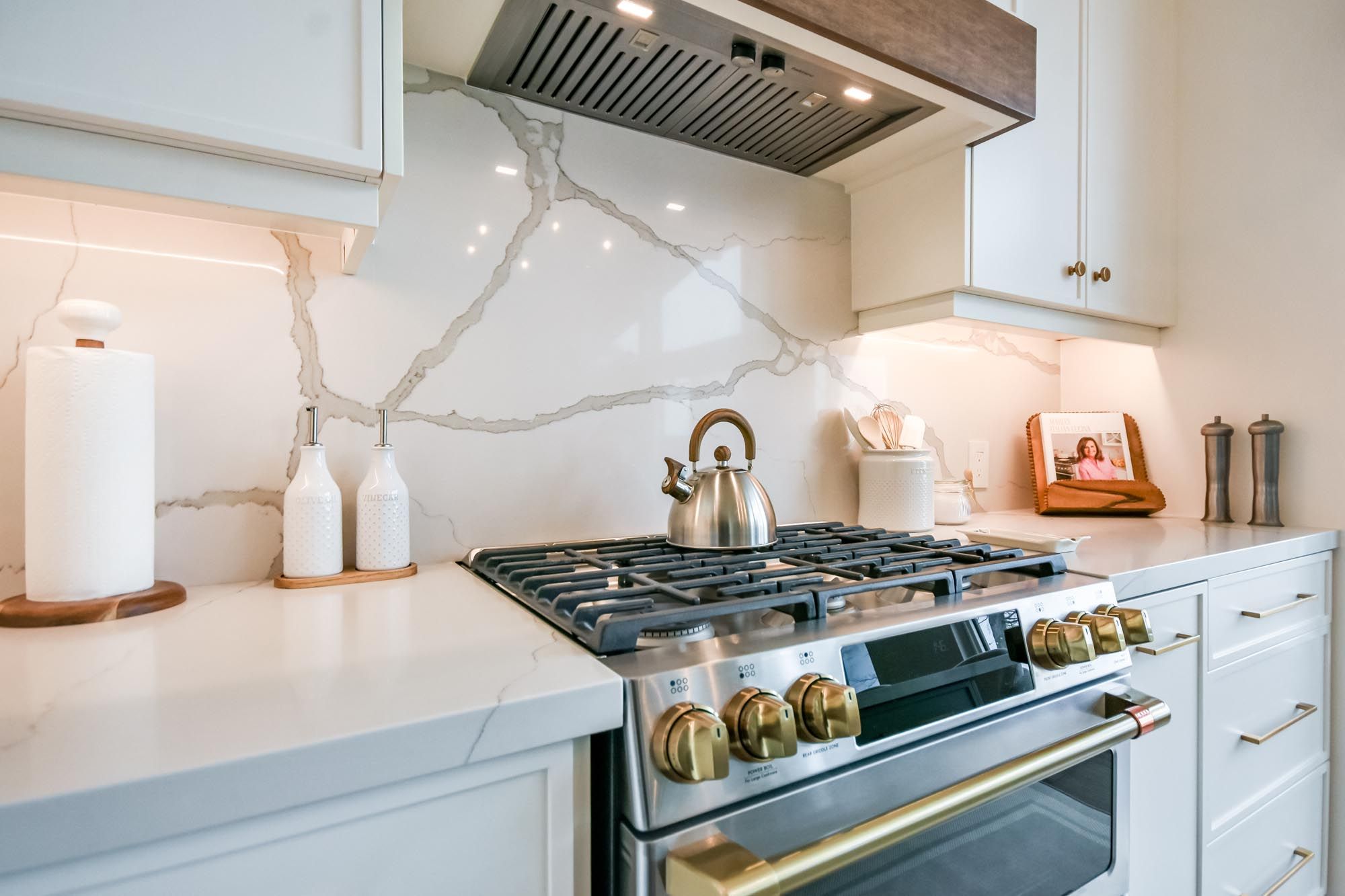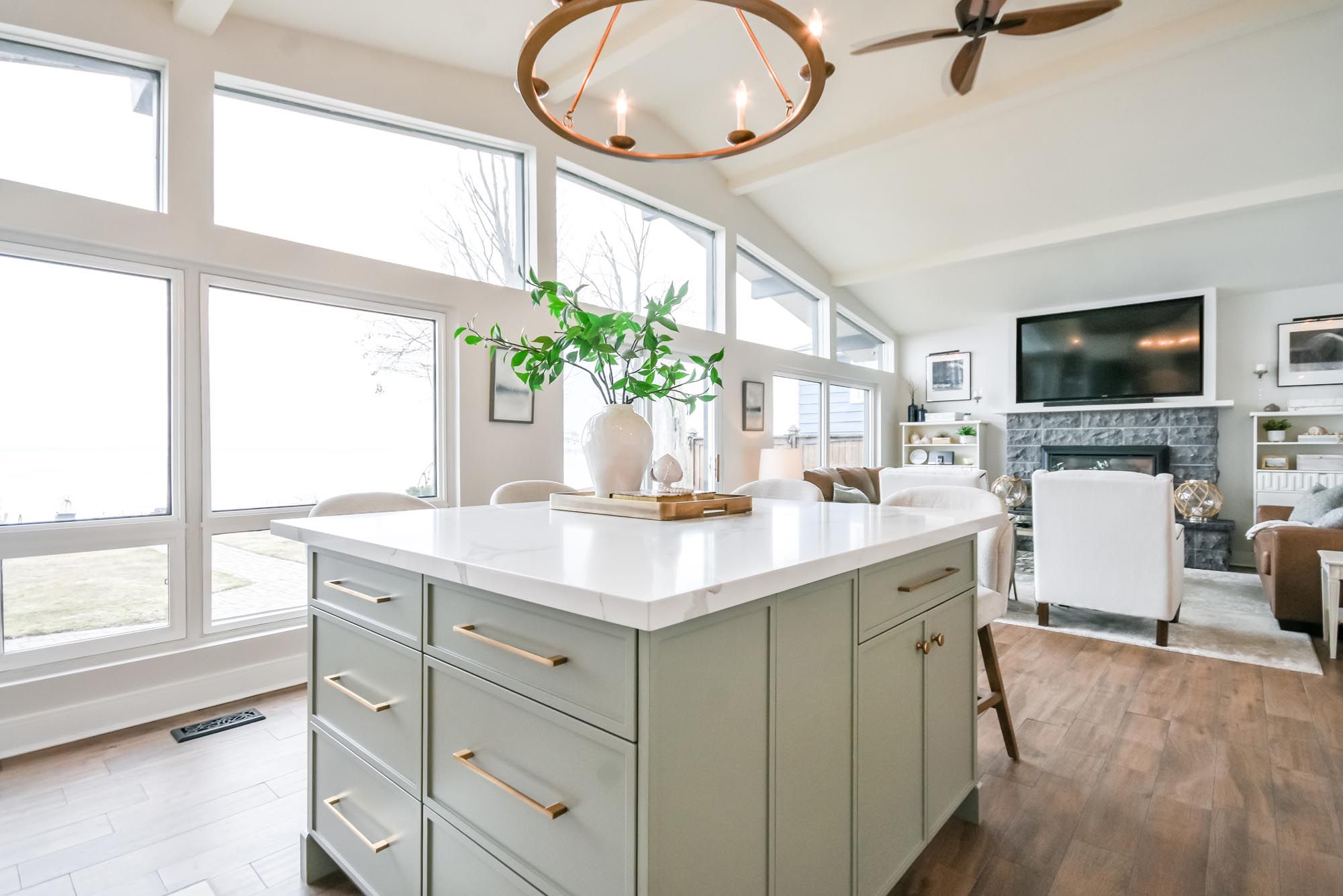 • Bright kitchen with quartz counters, island, and premium appliances.