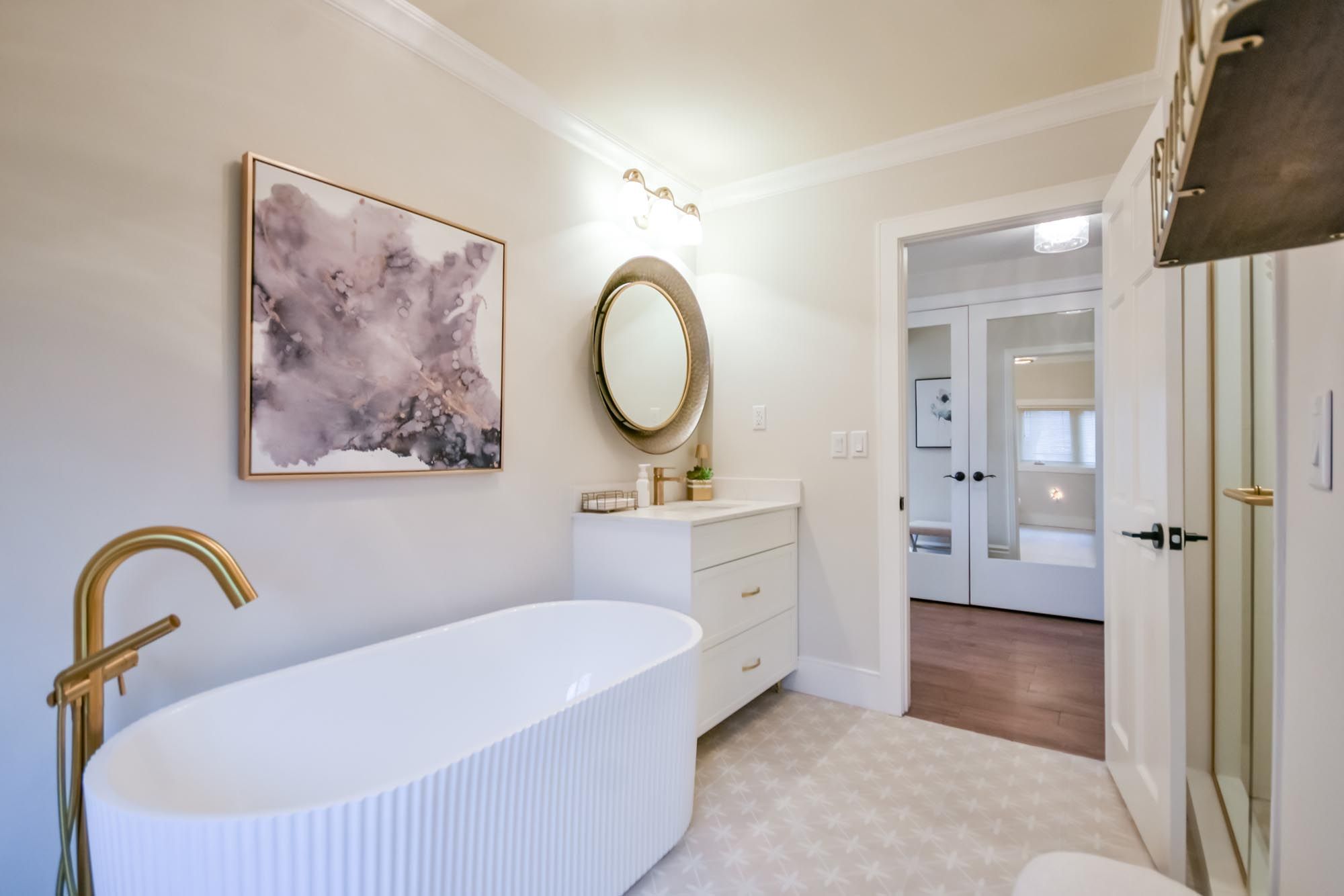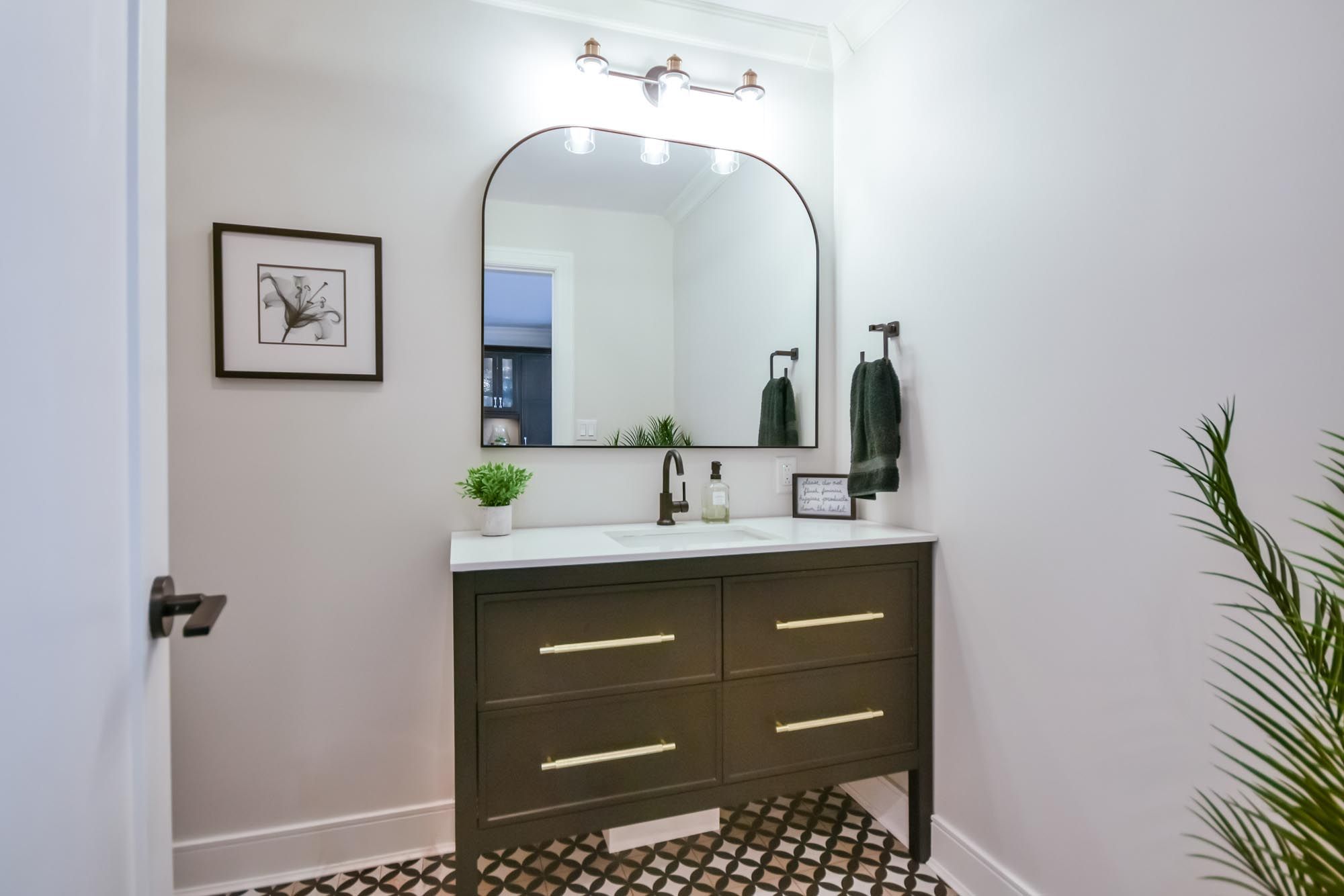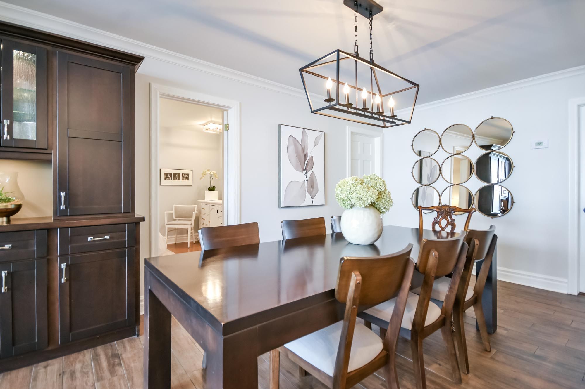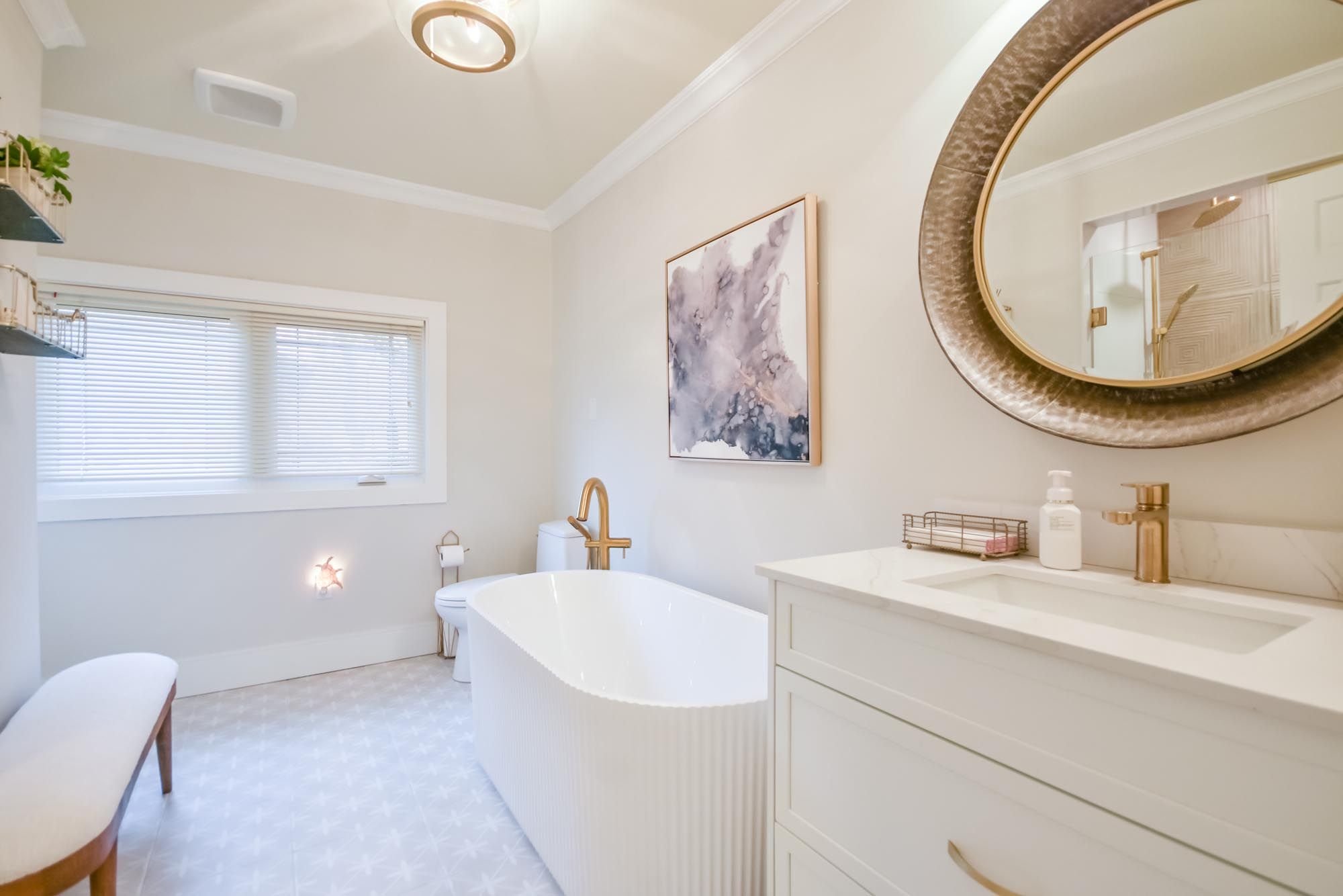 • Bright kitchen with quartz counters, island, and premium appliances.