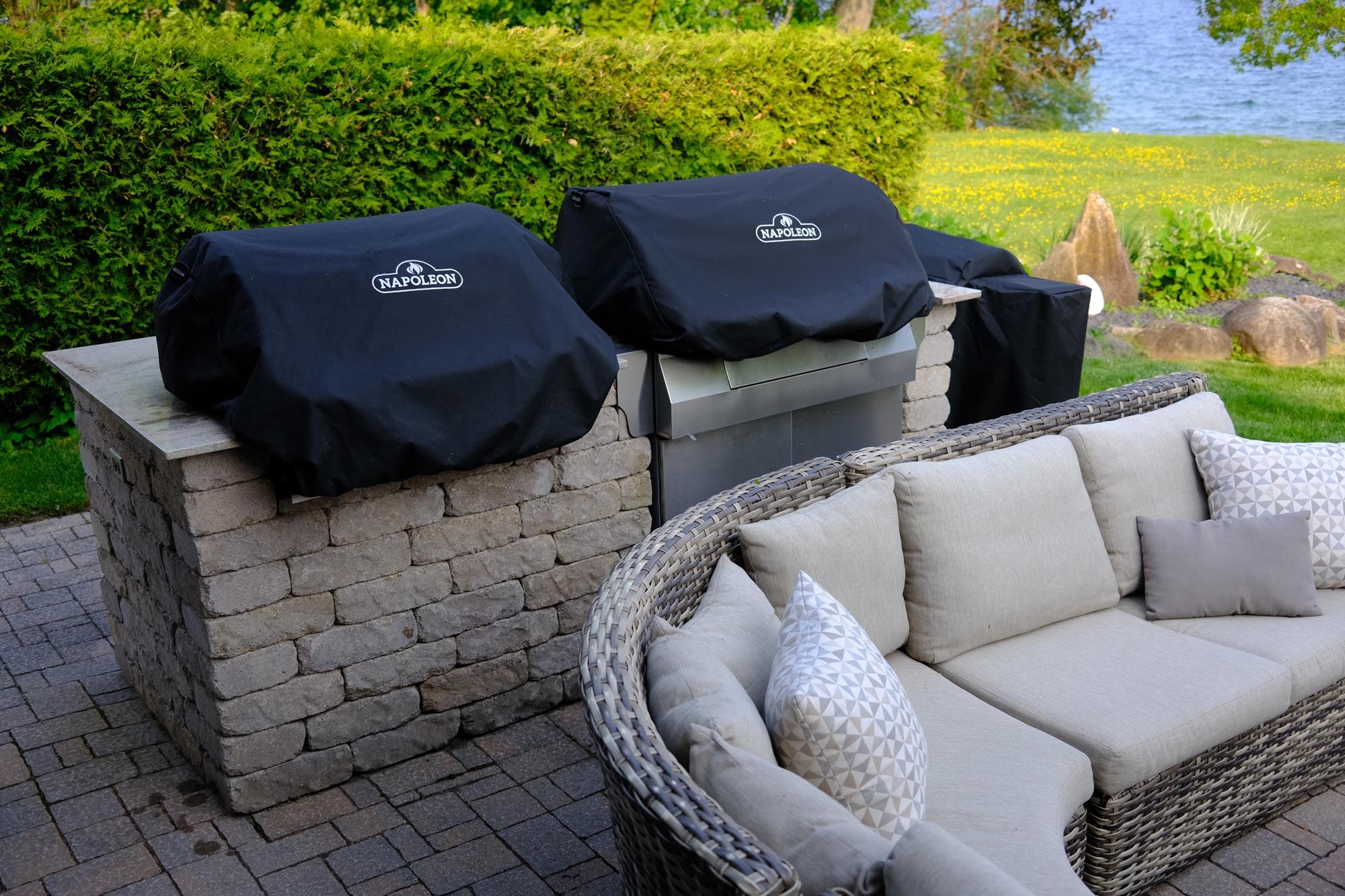 • Private waterfront oasis features outdoor kitchen, pier, and landscaped patios.
