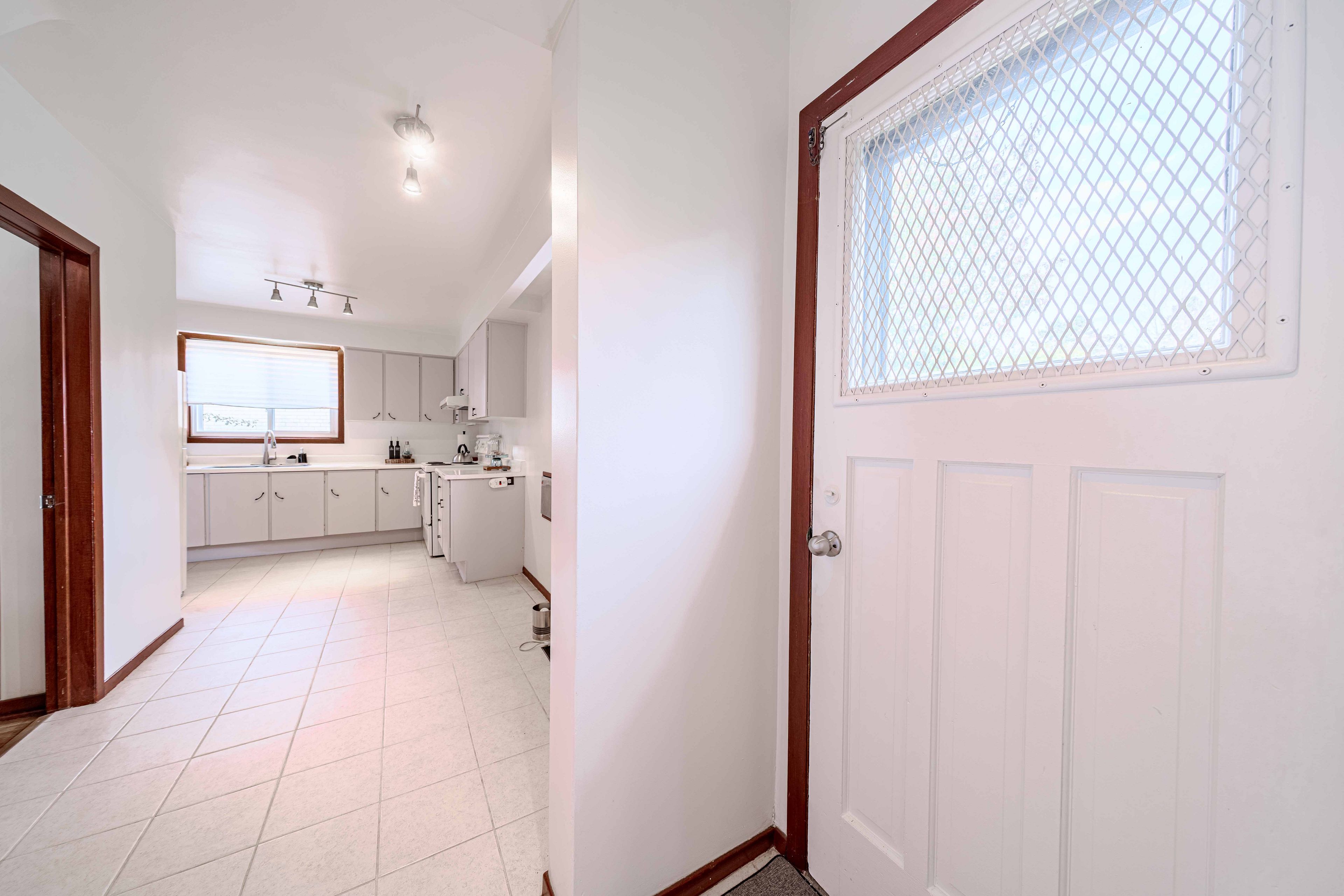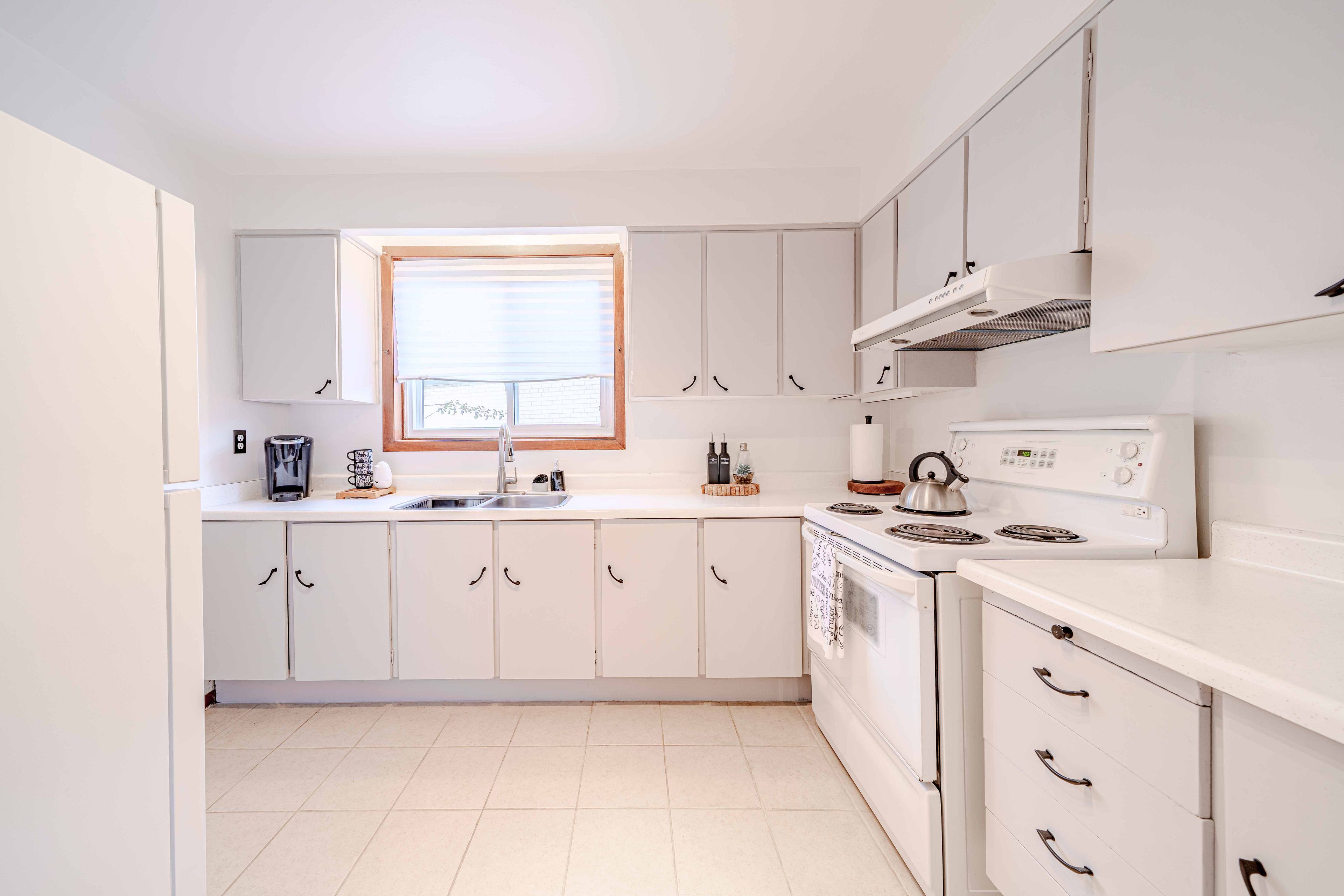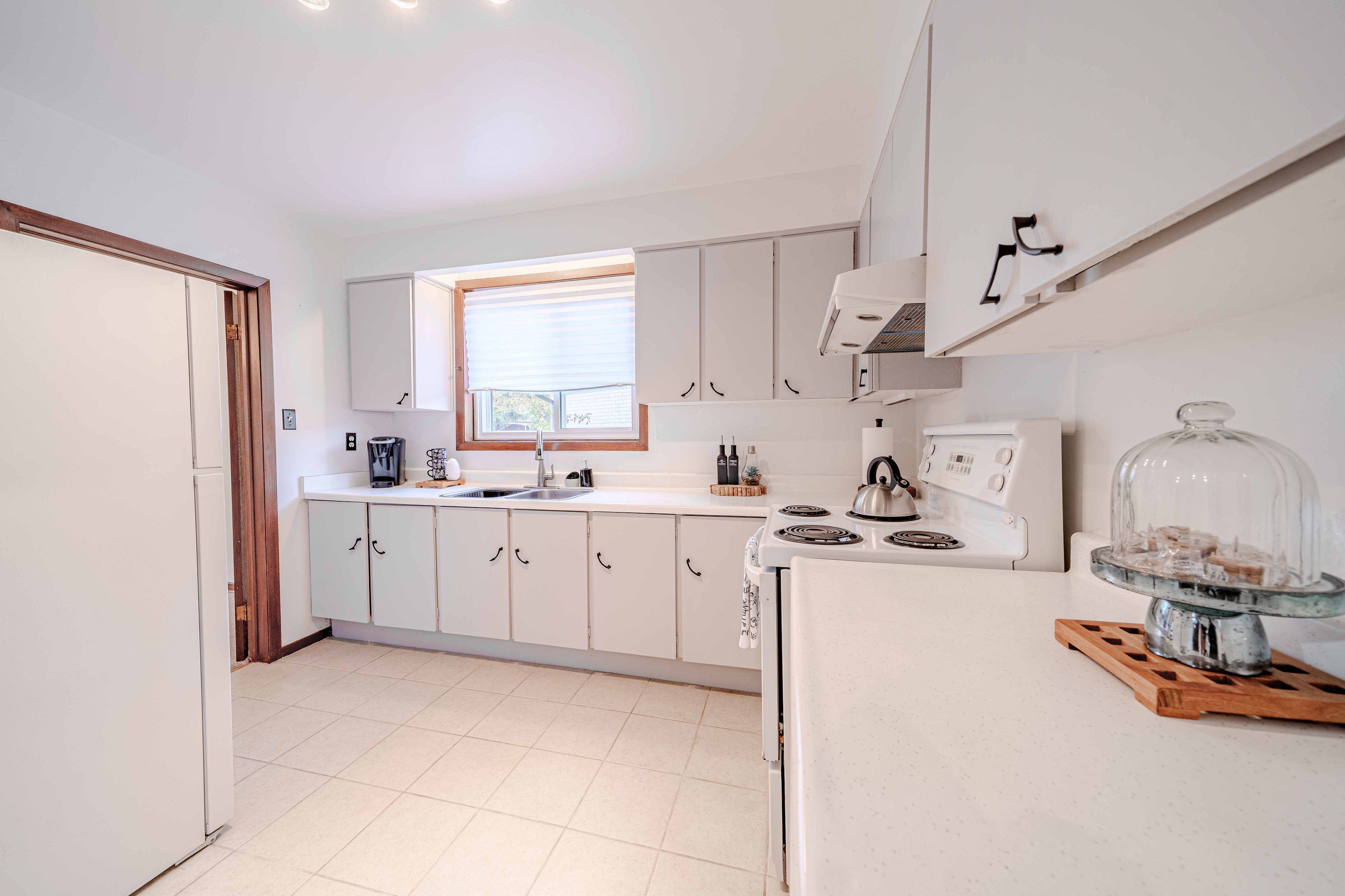 • Bright kitchen with repainted cabinets and ample workspace.