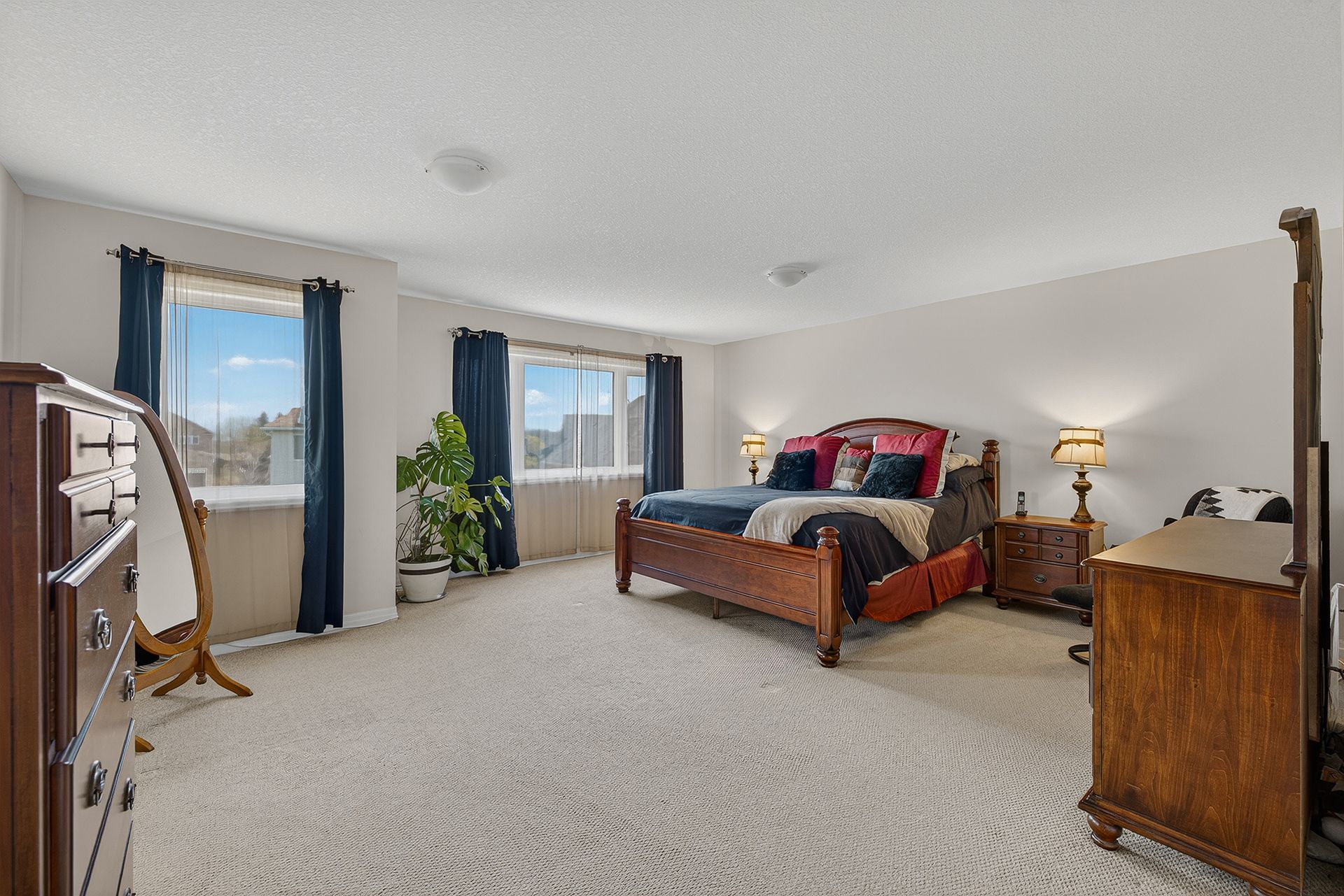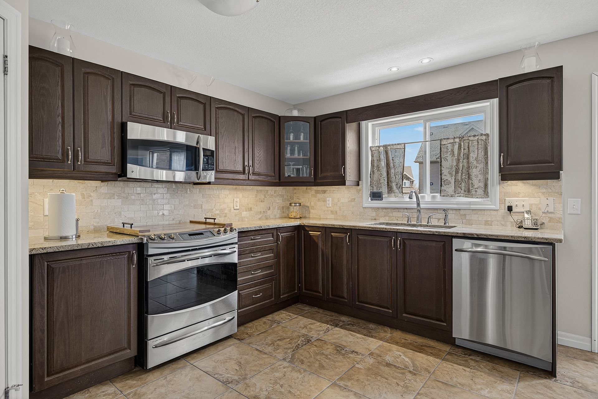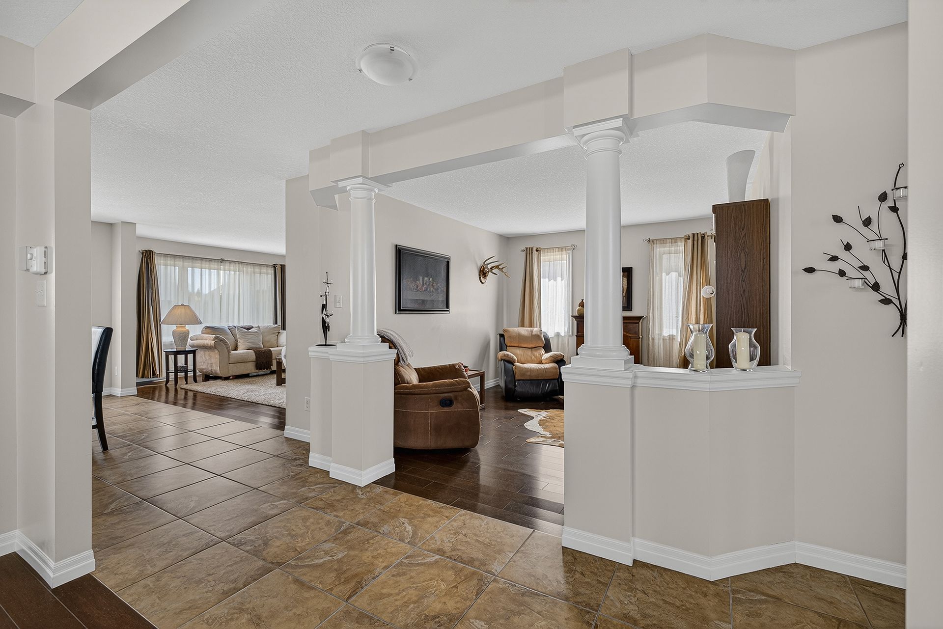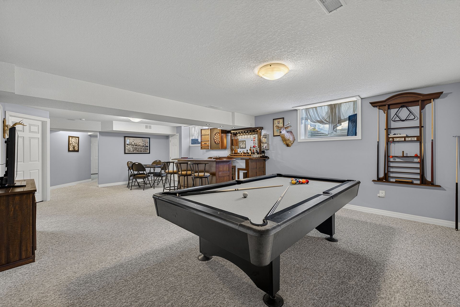Stunning corner-lot showpiece in cambridge's sought-after west galt community! This beautiful 5 bedroom, 3. 5 bath two-storey home offers over 3,500 sq ft of finished living space with triple-wide garage and one of the largest lots in the neighbourhood. The soaring two-storey foyer with curved espresso staircase and balusters, and grand palladian-style windows sets the tone for this exceptional home. Rich dark hardwood floors flow through the main level, anchored by a chef's kitchen, featuring dark espresso cabinetry, granite countertops, stainless steel appliances, and a large island with bar seating. Entertain effortlessly with a formal dining room, two family living areas, a cozy electric fireplace, and a stunning open-concept layout. Upstairs, the oversized primary suite is a true retreat with a spa-inspired 5-piece ensuite boasting a frameless walk-in shower, corner soaker tub, double vanity, water closet along with a large walk-in closet. Three additional generous bedrooms, a 4-piece bath, and a dedicated upper-level laundry complete the second floor. The fully finished basement is an entertainer's dream featuring a bar, pool table, games area, rec room, full bedroom, and 4-piece bath. Impeccable curb appeal with stunning twilight presence, and proximity to parks, trails, and all amenities. A rare opportunity - don't miss this one!