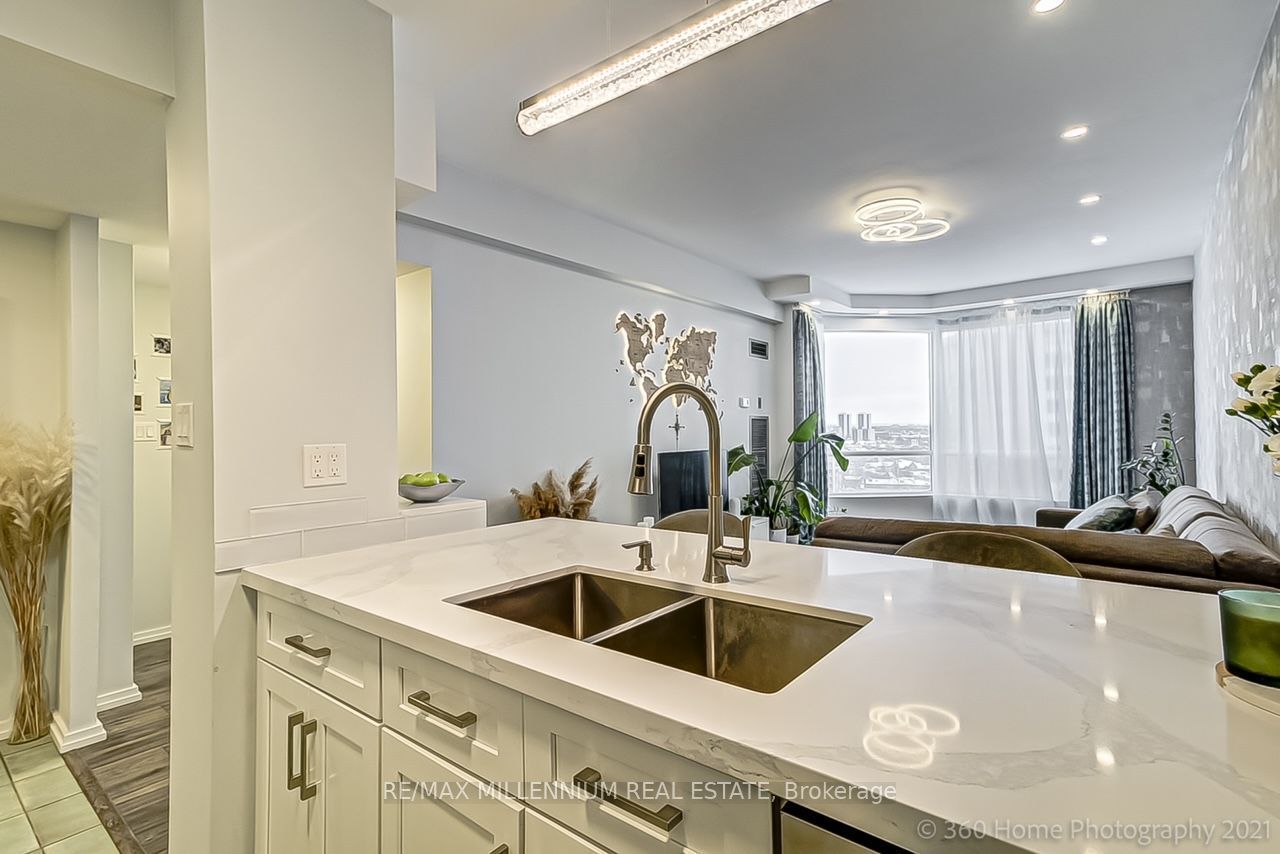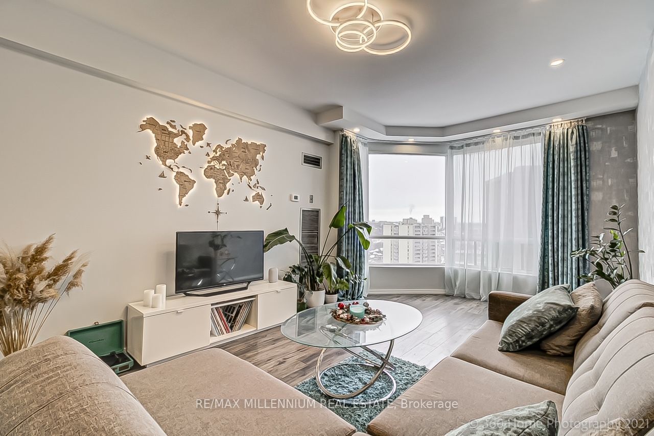 Renovated open-concept penthouse with breathtaking views of the humber river trails. Ideally located near highway 401 and go station, with easy access to grocery stores, restaurants, shopping, and everyday conveniences. Stunning modern kitchen featuring a large island and refined finishes-perfect for entertaining. Spacious one-bedroom layout with open-concept solarium offering abundant natural light. Includes all utilities, cable tv, parking and a locker for added value and convenience.