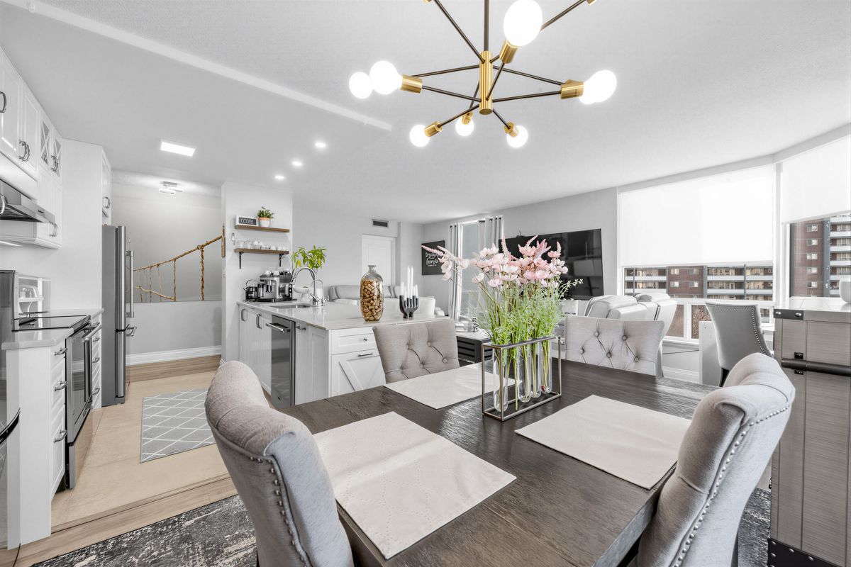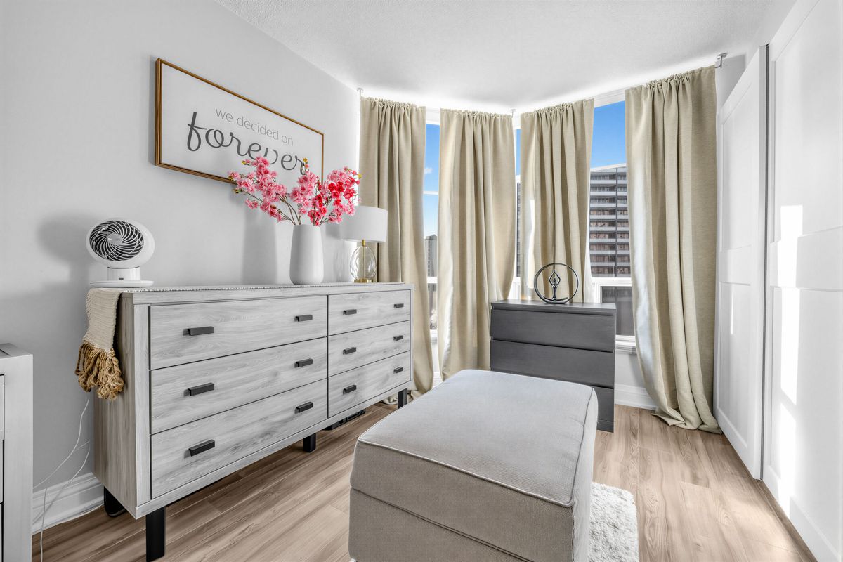 Ideally located near the 401 and within convenient reach of the union pearson express and go weston stations, this thoroughly updated, spacious corner condo offers 2 bedrooms plus a den and 2 full baths across 1,223 square feet. The open-plan layout provides ample storage and large windows for bright, airy living spaces. An in-suite laundry setup is included. Although advertised as 2+1 bedrooms, the primary suite was originally configured with a partition to create a sunroom/third bedroom by the window. That partition has been removed to enlarge the primary suite, and can be reinstalled if a smaller third bedroom is desired. Monthly condo fees are $1,026. 68, covering most essentials, including heat, electricity, water, building insurance, parking, condo amenities, and even cable. The grounds feature well-maintained landscaping, and residents enjoy access to amenities such as a lobby/mailroom, party room, study room, pool, hot tub, sauna, and gym. Heated underground parking with a carwash bay, plus 24/7 concierge and security, enhances convenience and peace of mind.