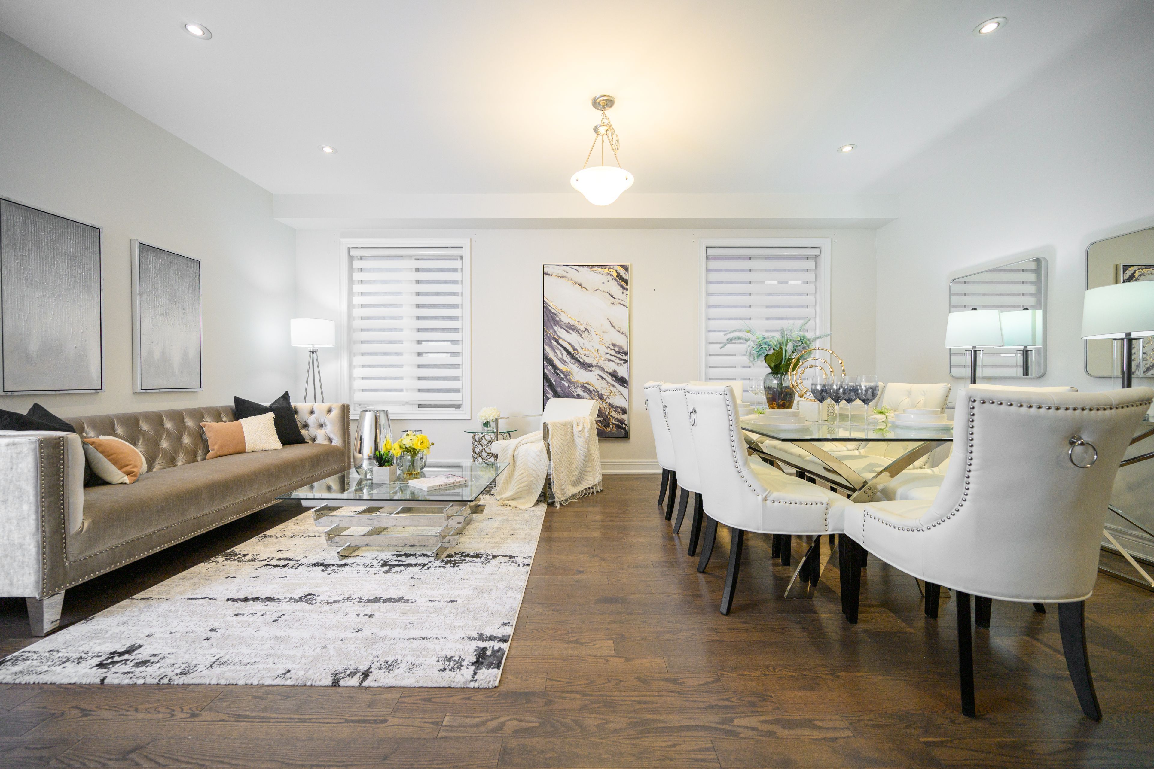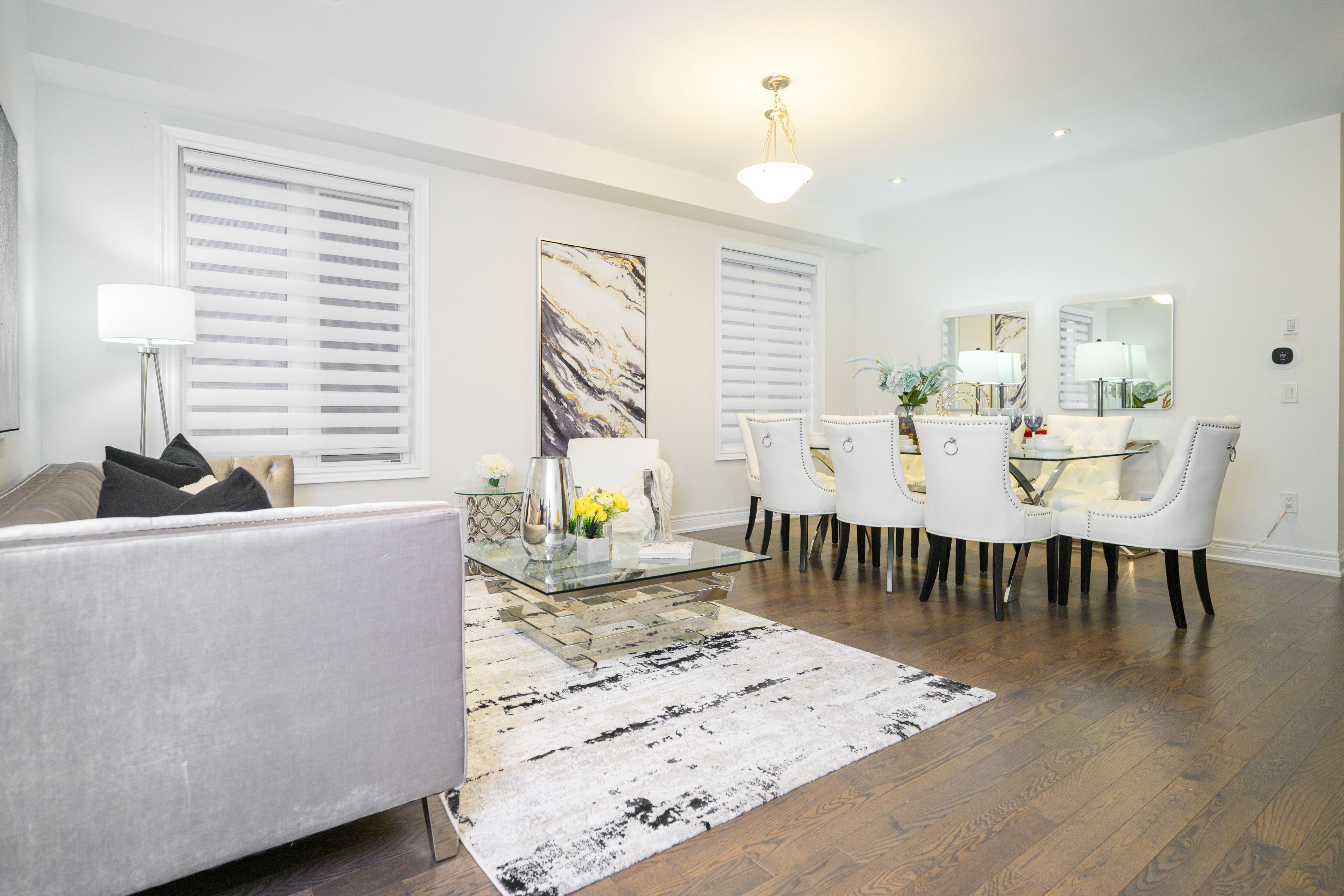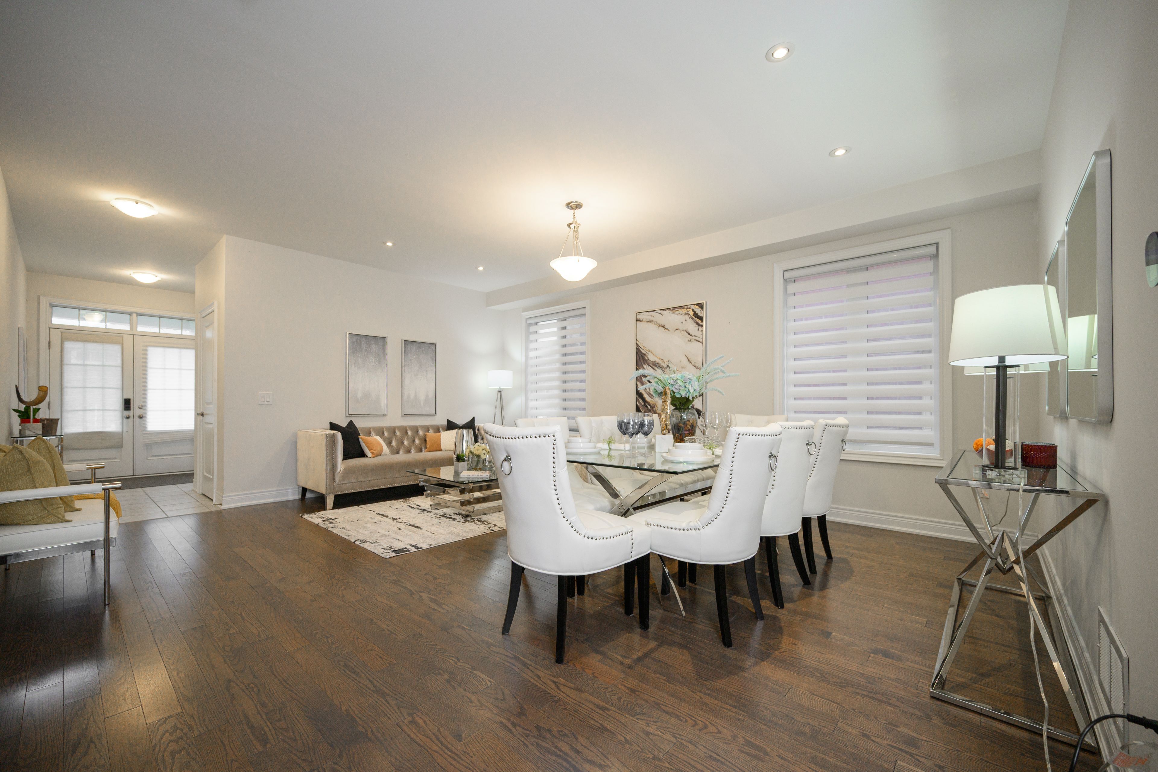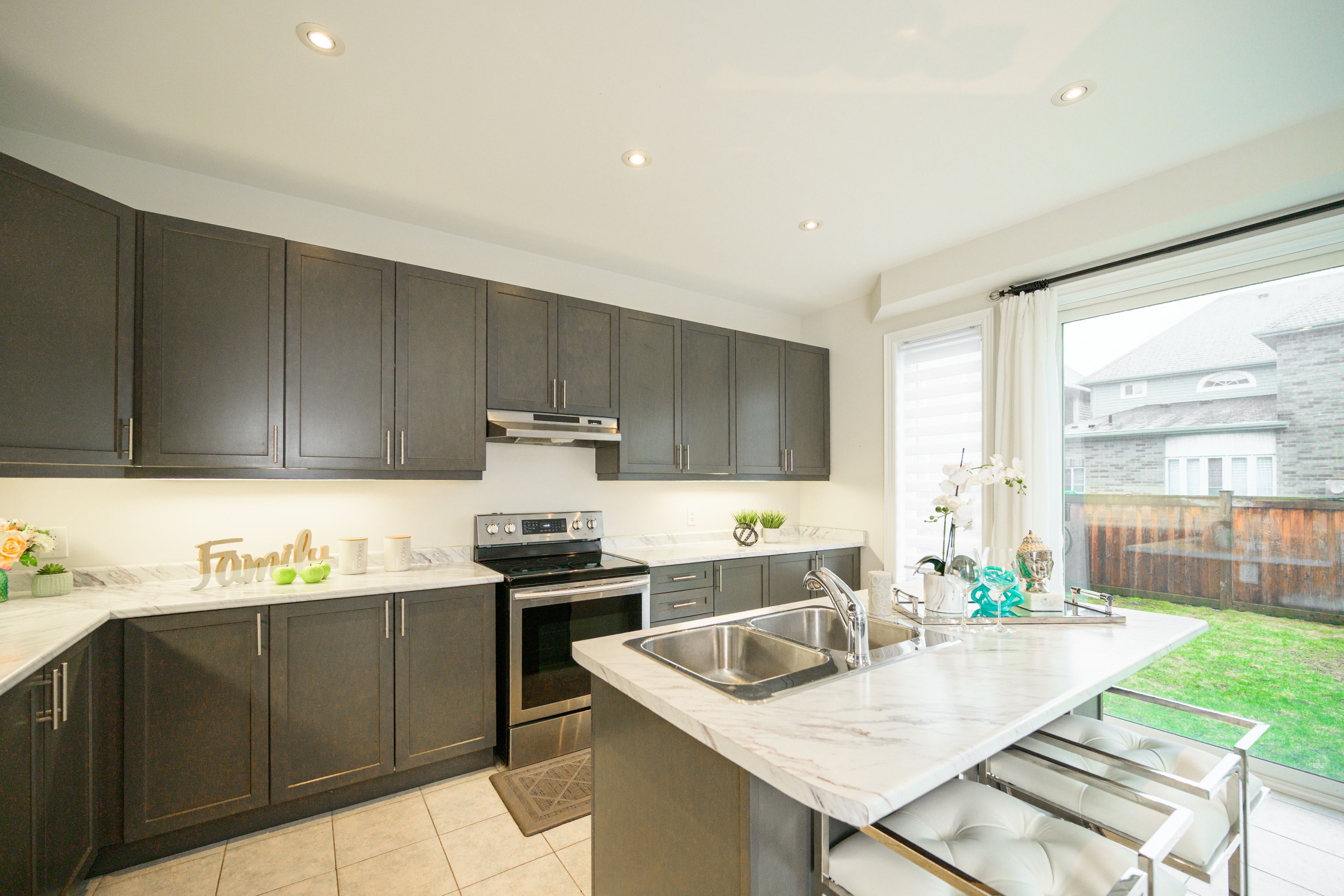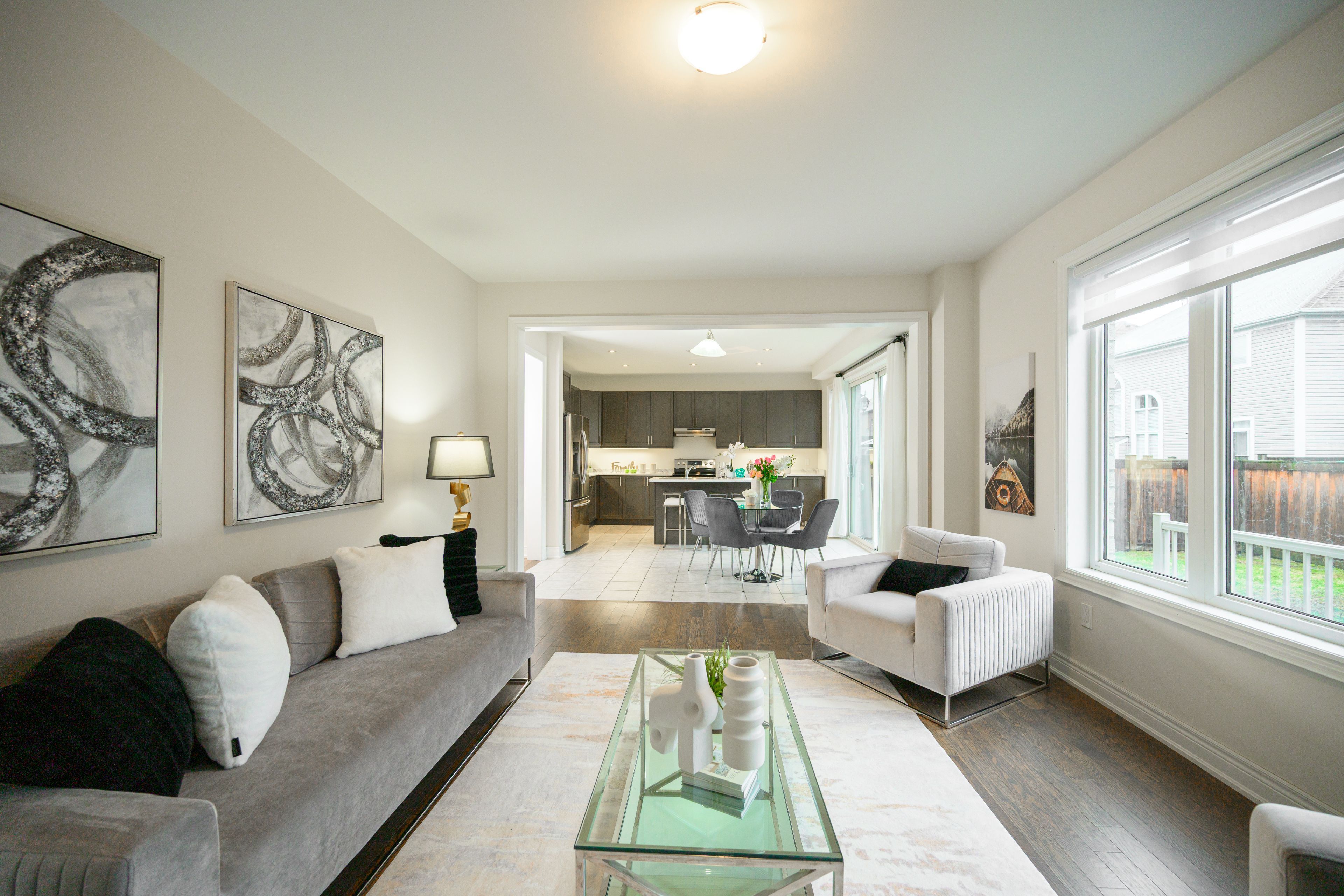 • Modern open concept layout with 9-foot ceilings and oak flooring.