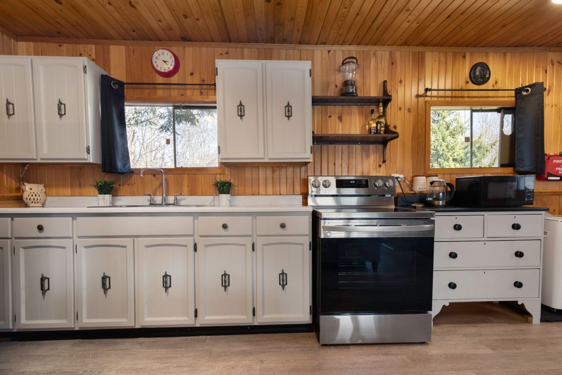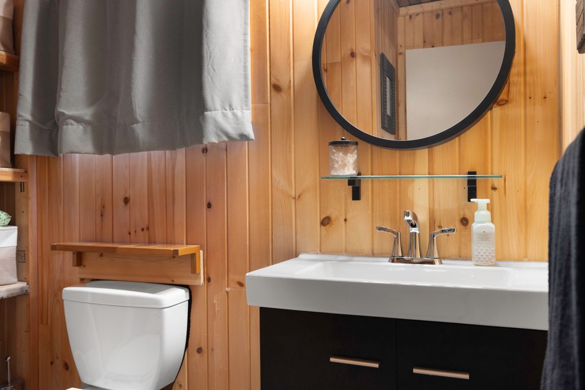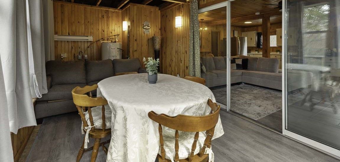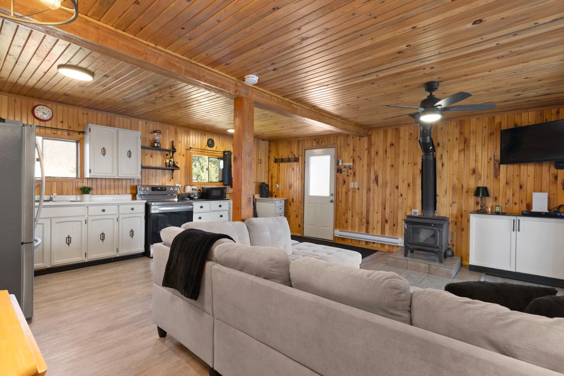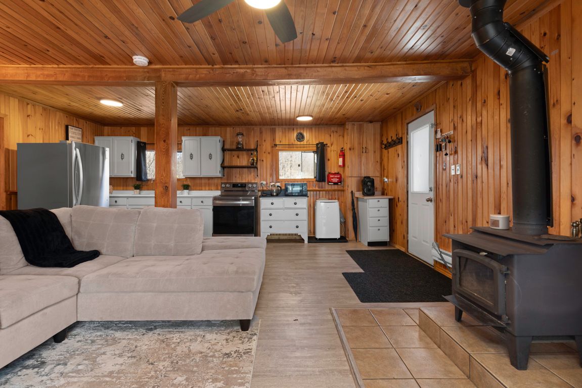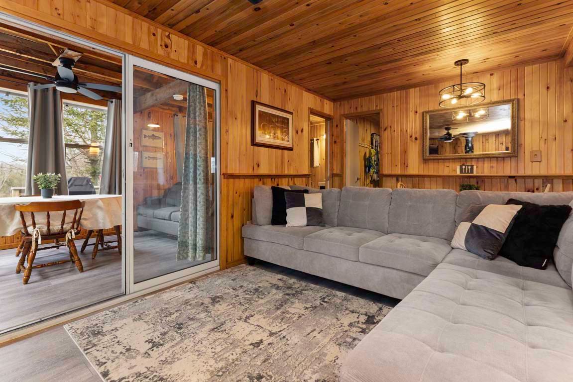 • Open-concept living area with a warm pine interior.