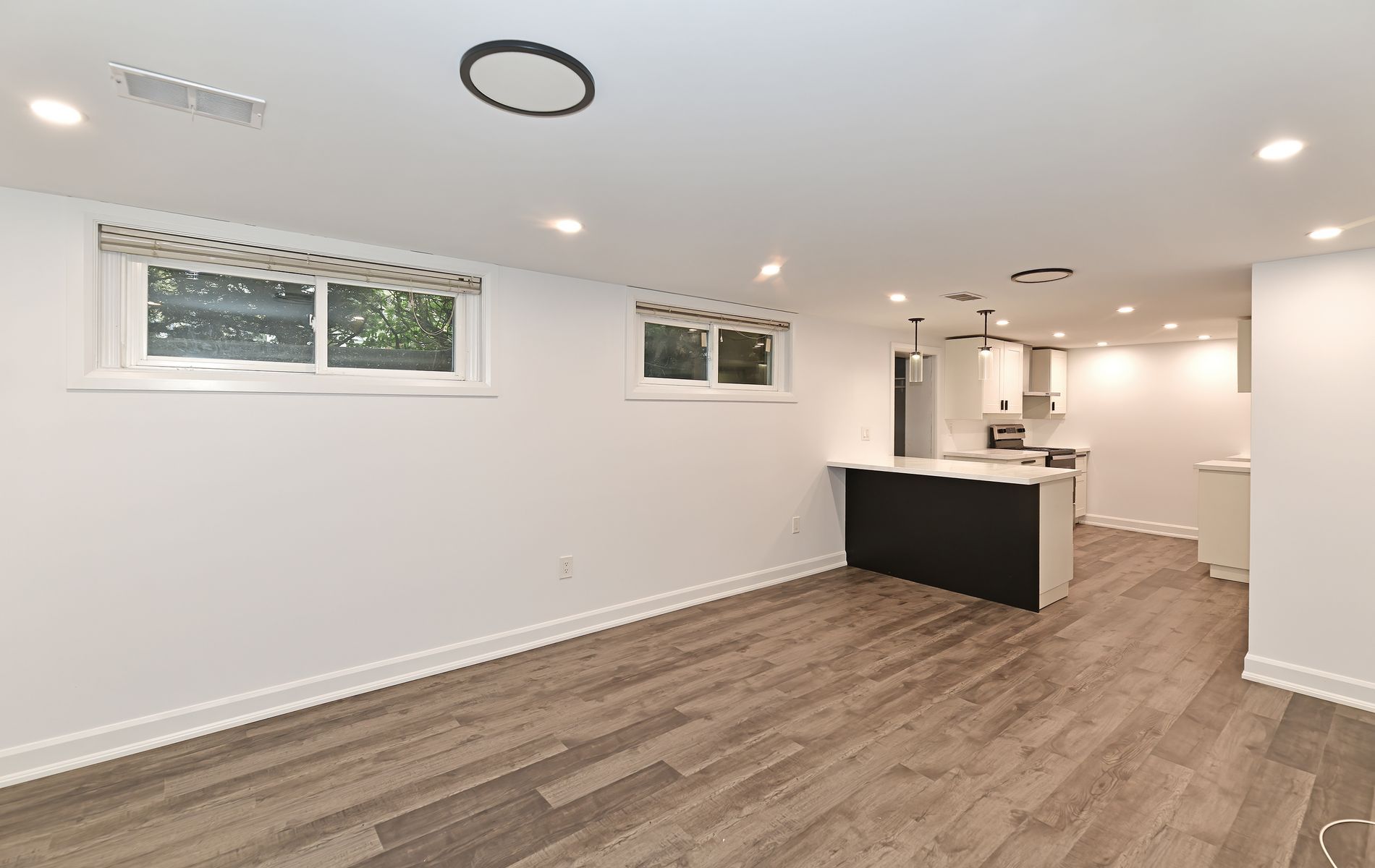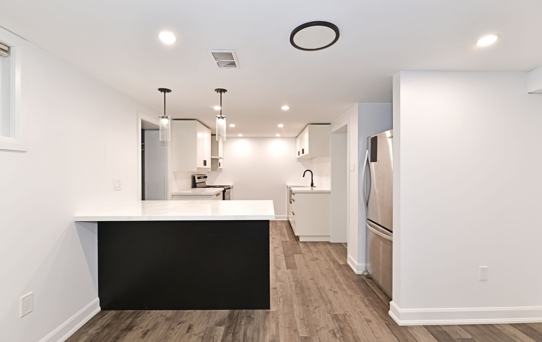 • Modern kitchen with stainless steel appliances and breakfast bar.