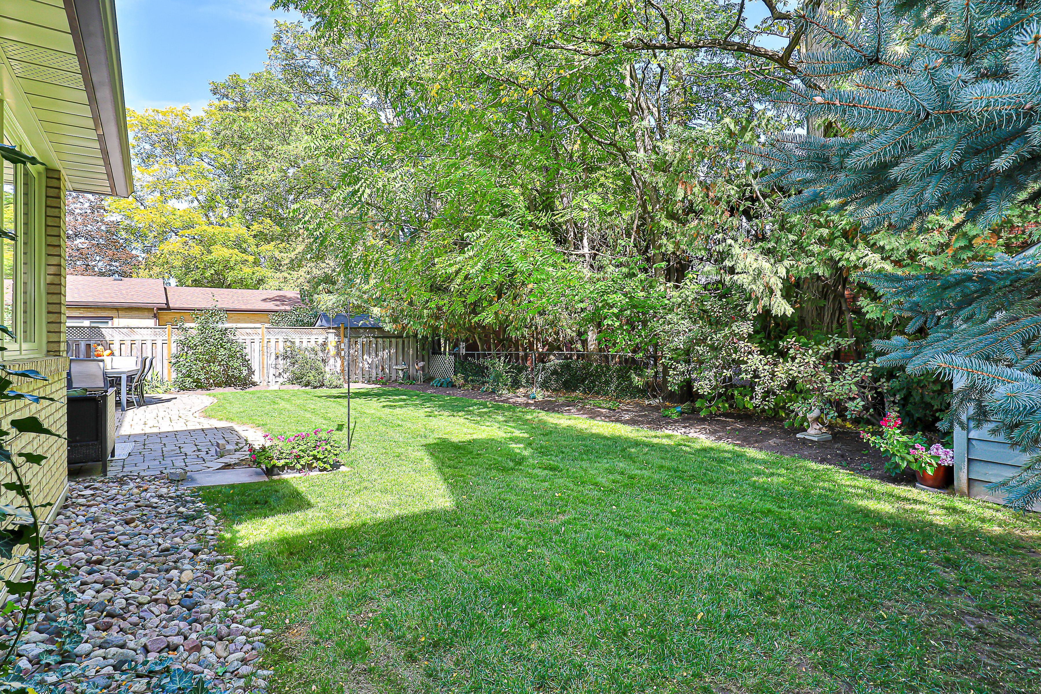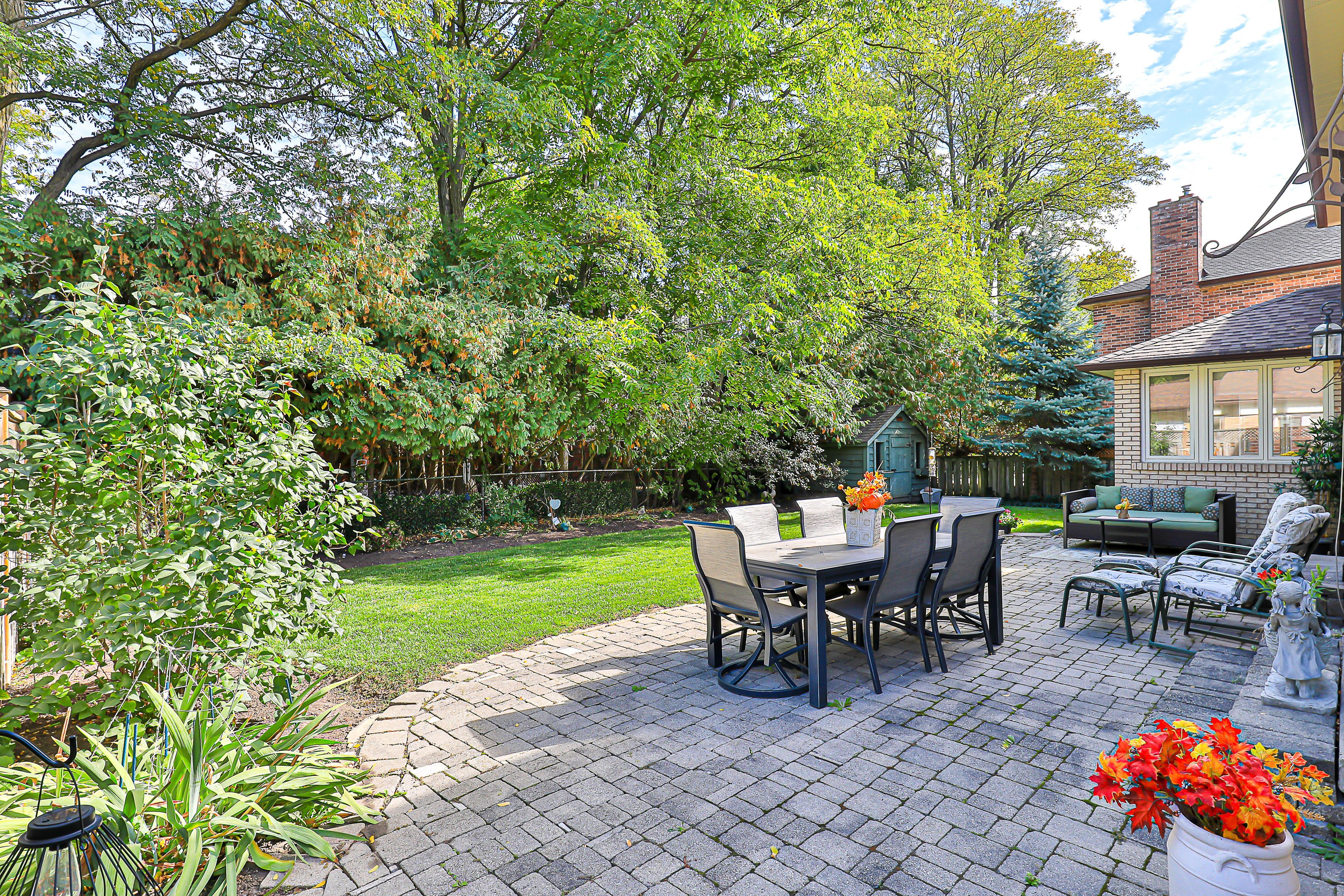 • Private backyard oasis with mature trees, gardens, and a large interlocking patio.