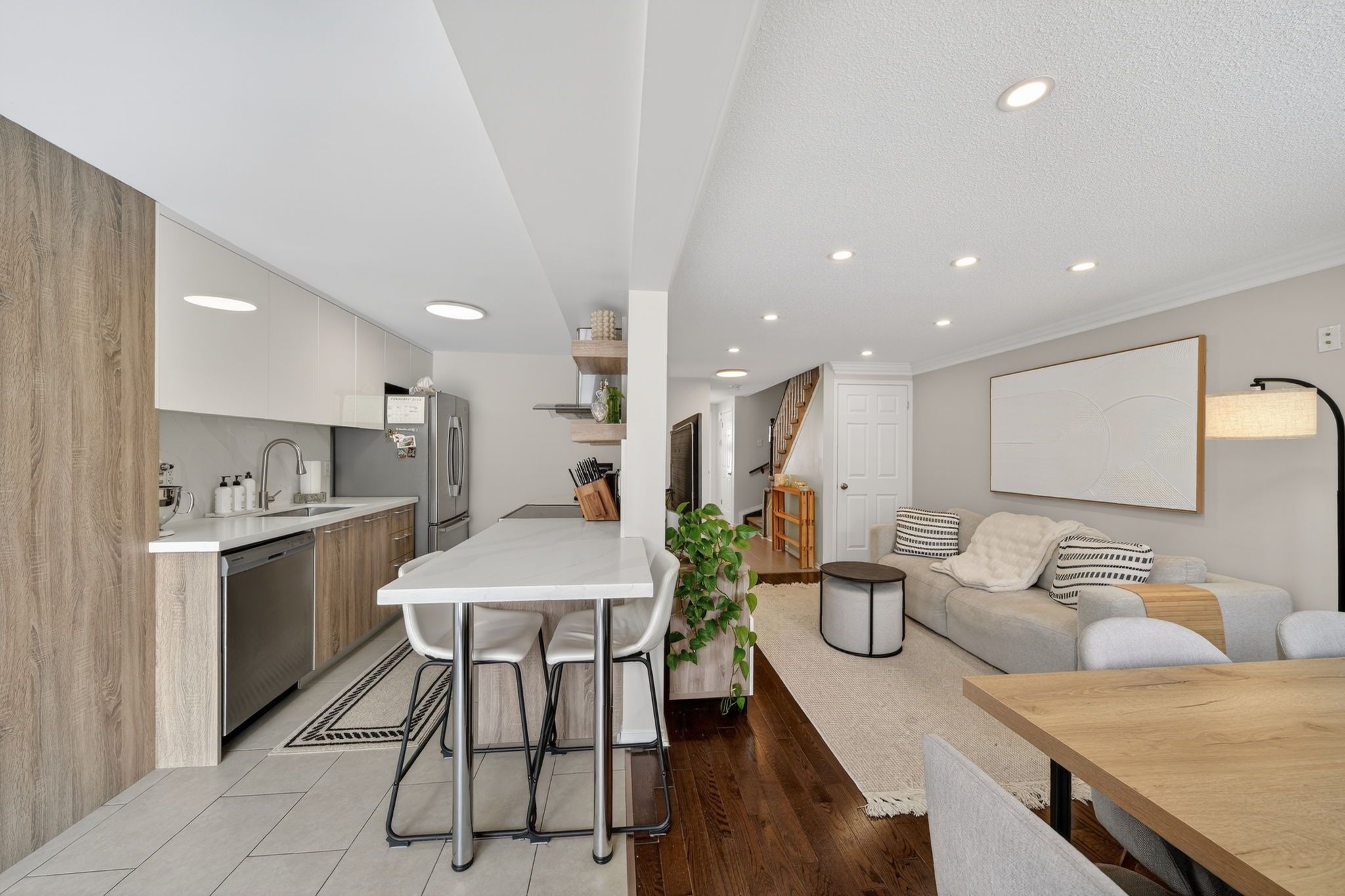 Welcome to this beautifully updated 3-bedroom townhome offering modern comfort & incredible convenience. The renovated kitchen features sleek stainless-steel appliances, stylish cabinetry, & a bright, open feel that is perfect for everyday living & entertaining. Enjoy direct access through the home, to the garage and a no-sidewalk driveway, providing extra parking space. Upstairs, you'll find 3 spacious bedrooms, including a primary suite with a semi-ensuite bath for added privacy. The finished basement extends your living space with additional space and a 3-piece bathroom. Located close to parks, schools, shopping, and transit. This move-in ready home is the perfect blend of style, function, and location.