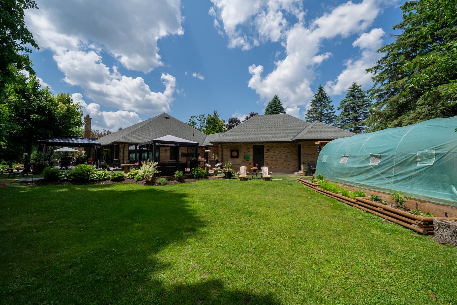 A rare & versatile opportunity on an over 1-acre corner lot in rural stouffville. Welcome to a truly unique offering - a stunning ranch bungalow featuring 2 completely separate living spaces, perfectly designed for multigenerational living or rental potential. Situated on a beautifully landscaped lot with mature trees, armour stone & lush gardens. This home has over 6000 sqft of finished living space spread over 2 levels with 2 separate large driveways, their own front entrances & own garage spaces. The main level spans over 3,400 sqft & offers 4 spacious bedrooms, 3 bathrooms & an airy layout filled with natural light. The open-concept great room features a wood-burning fireplace & custom built-ins, seamlessly flowing into the kitchen with a central island, coffee station, walk-in pantry & two walkouts to the backyard. The large home office boasts wall-to-wall diamond-pattern windows, rich wainscoting & custom built-ins. The primary suite is a private retreat with a 5-piece ensuite, walk-in closet & walkout to the deck. Additional highlights on this level include a large mudroom/laundry room with garage & backyard access, a 3-car garage & parking for 10+ vehicles. Step outside to an entertainers dream: an outdoor kitchen, covered dining area, hot tub under the gazebo, and a greenhouse - all with complete privacy, huge mature trees & fully fenced in. The lower level is more than just a walkout basement suite, it really is its very own home. With approximately 2000 sqft of finished living space with its own front entry. This space includes a full kitchen, large family room, home office, gym, bedroom with 5-piece ensuite, den, laundry & plenty of storage. Behind the scenes this home has 2 furnaces, 2 a/c units, and 400amp service. Plus the bonus in-ground irrigation system adding ease to property maintenance. Ideally located minutes from hwy 404 & aurora rd. Neighbourhood trails connecting to vandorf park with baseball diamonds, tennis & pickle ball courts & more.