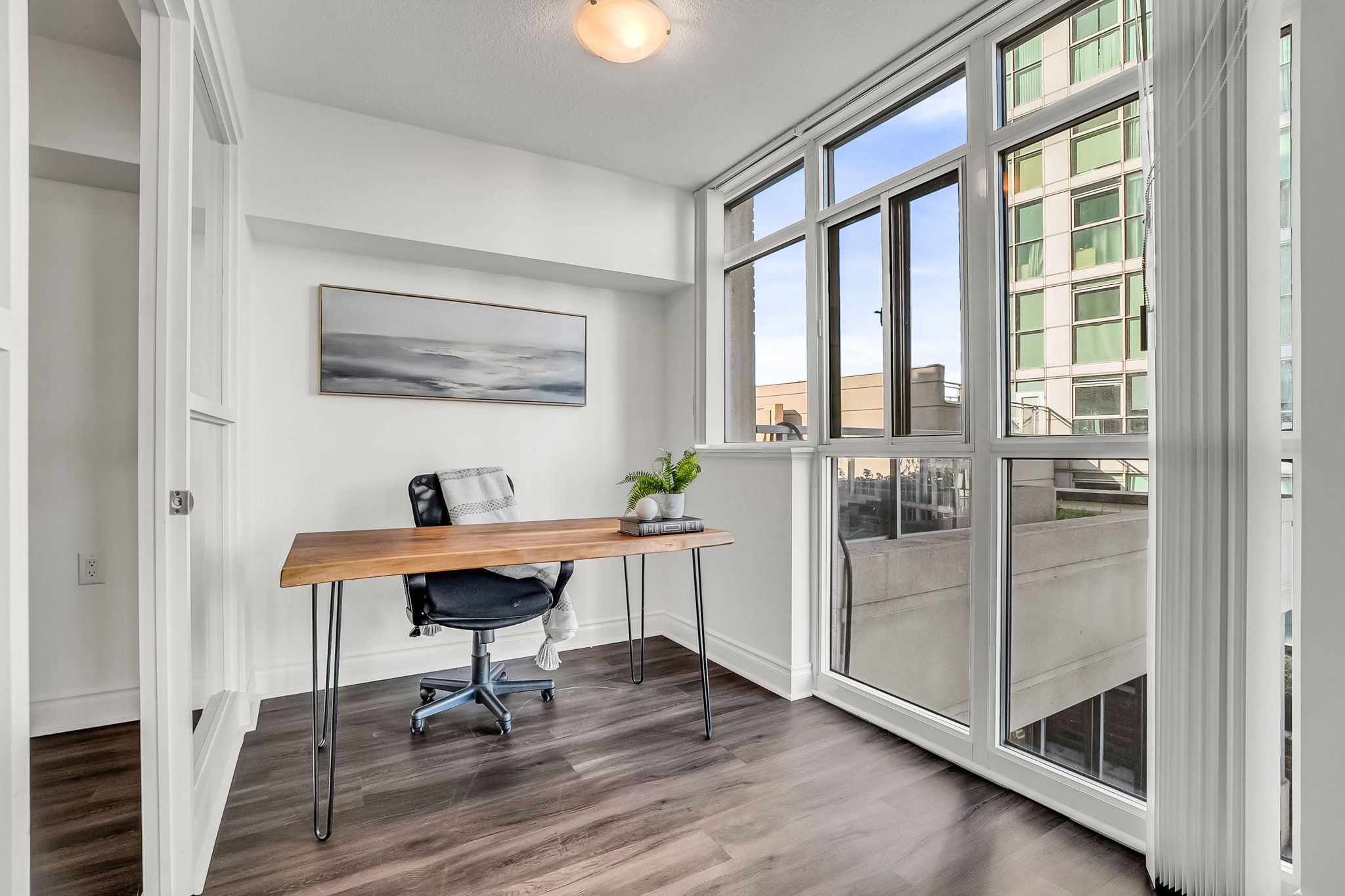 • Private balcony, solarium, and office nook offer flexible living options.