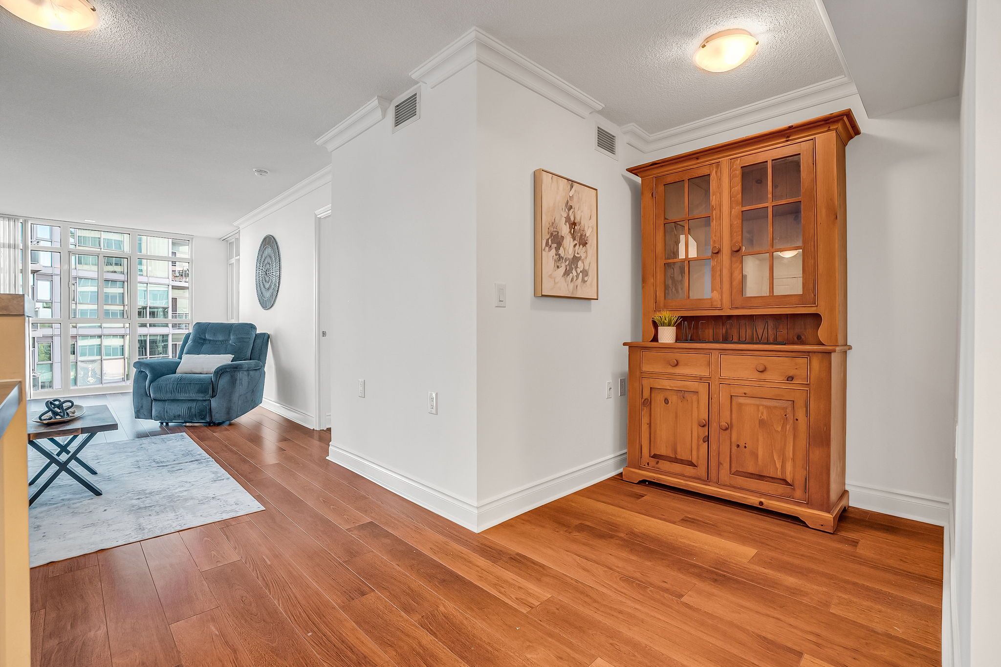 • Bright living space with floor-to-ceiling windows and partial lake views.