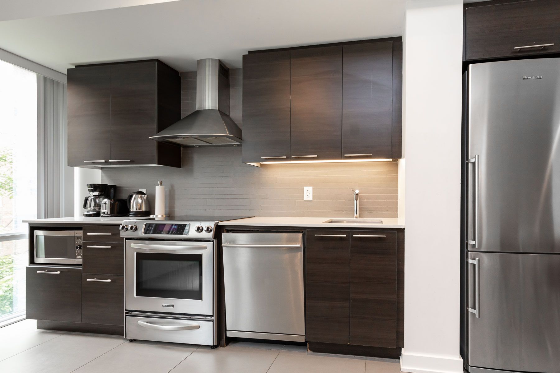 • Modern kitchen with stainless steel appliances and granite countertops.