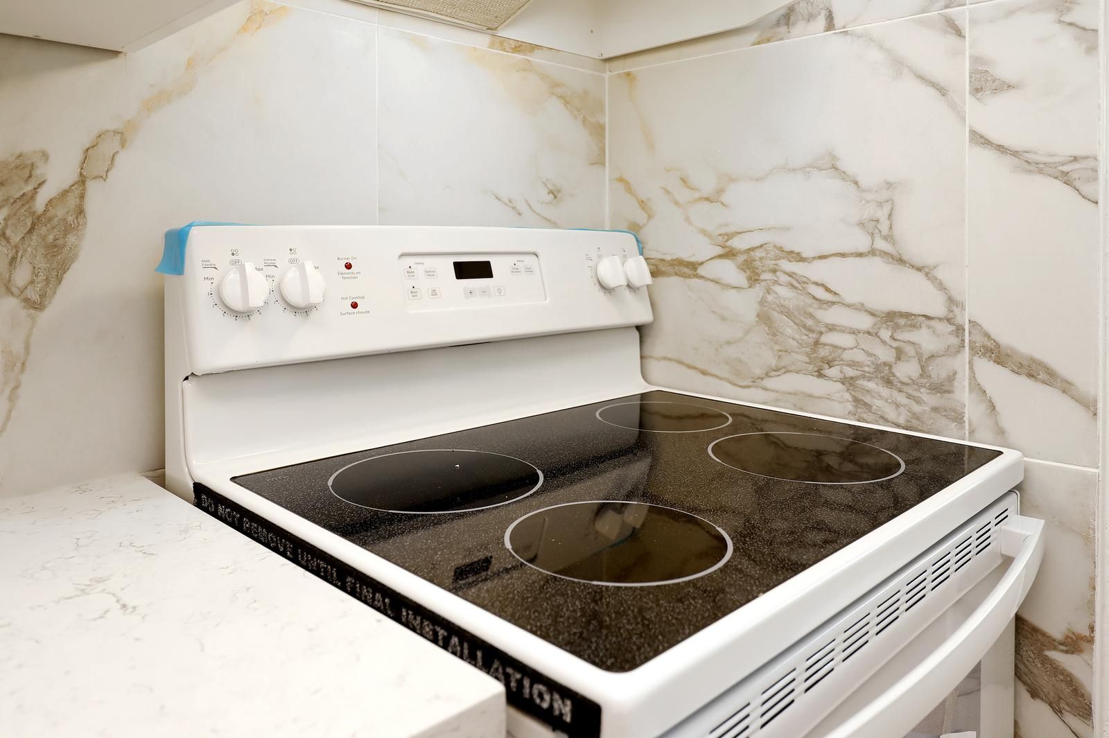 • Modern kitchen with quartz countertop, new stove, and dishwasher.