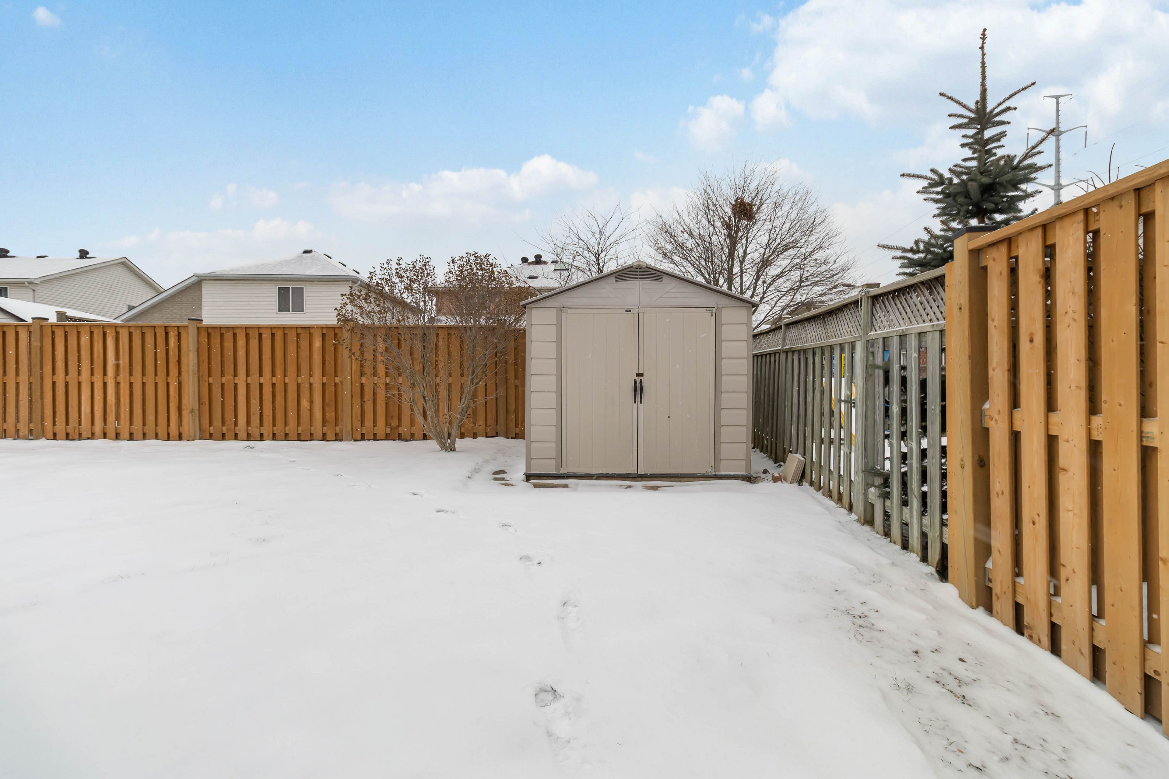 • Flat, fenced backyard with storage shed and ample parking on a corner lot.