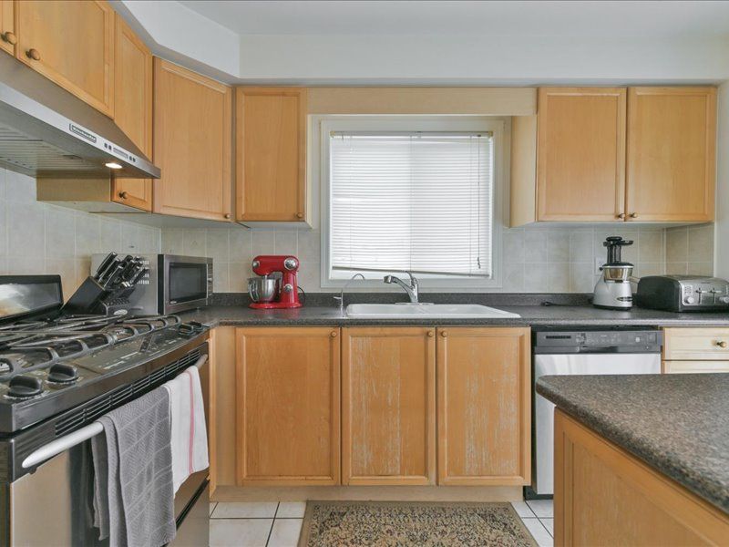 • Open-concept kitchen leads to a private interlock patio for relaxation.