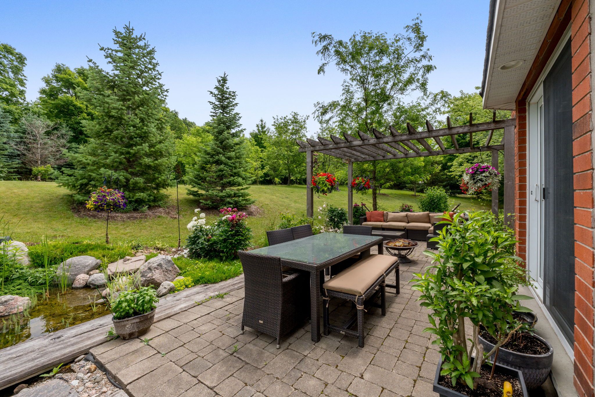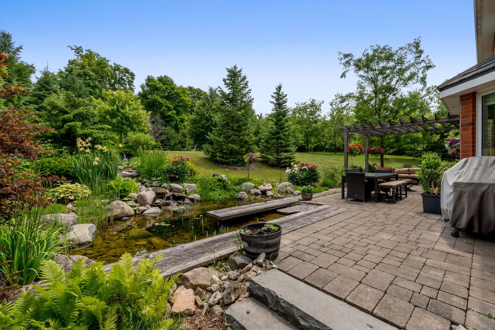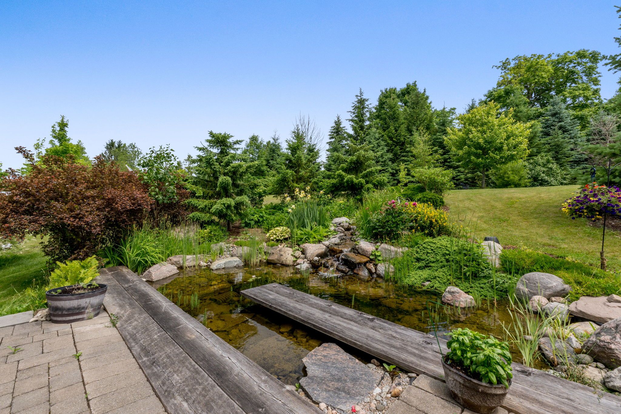 • Peaceful setting featuring wildflower meadows and a serene pond with waterfall.