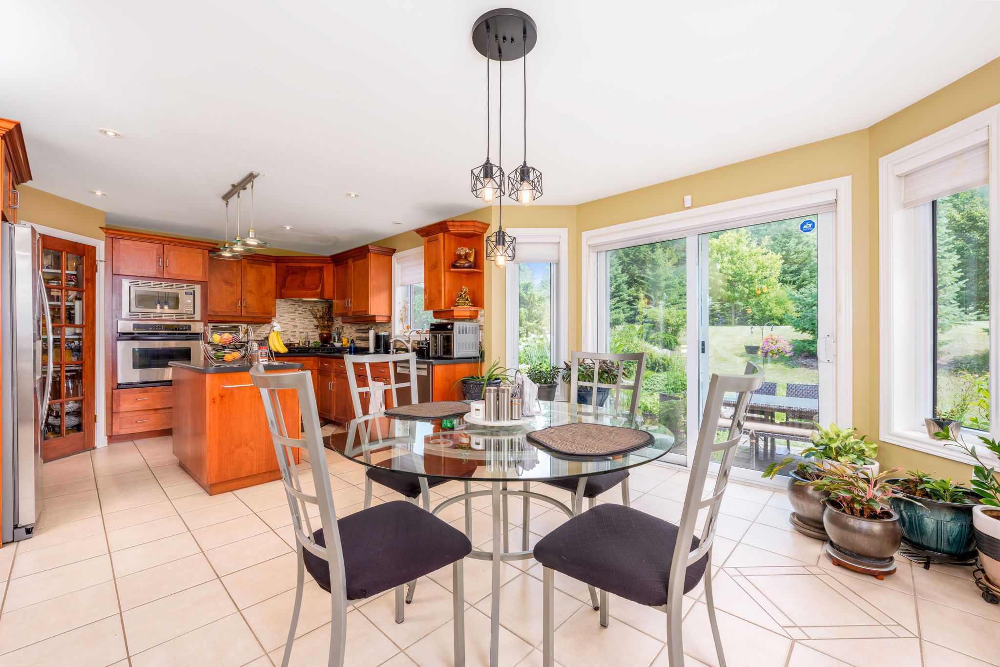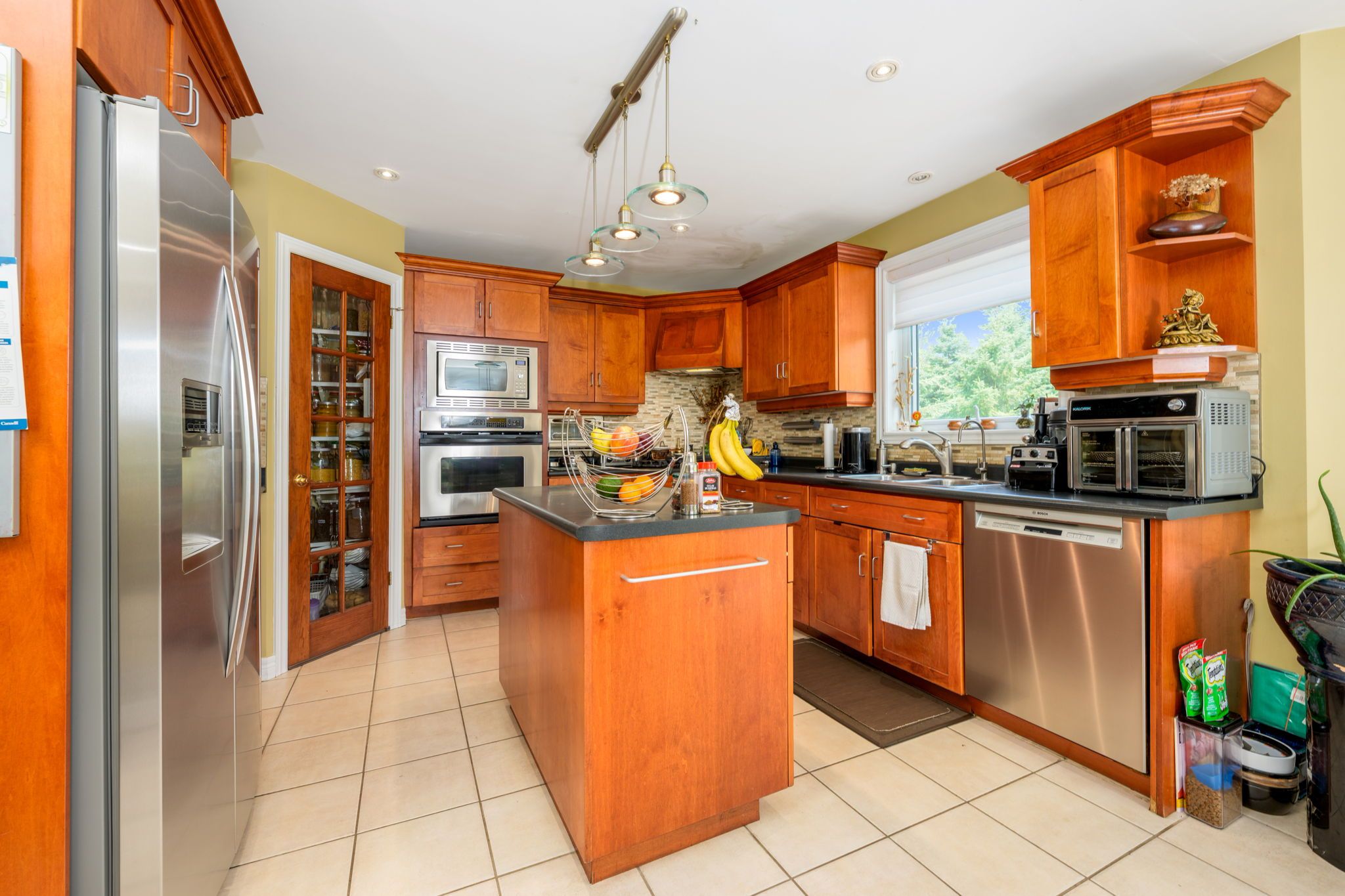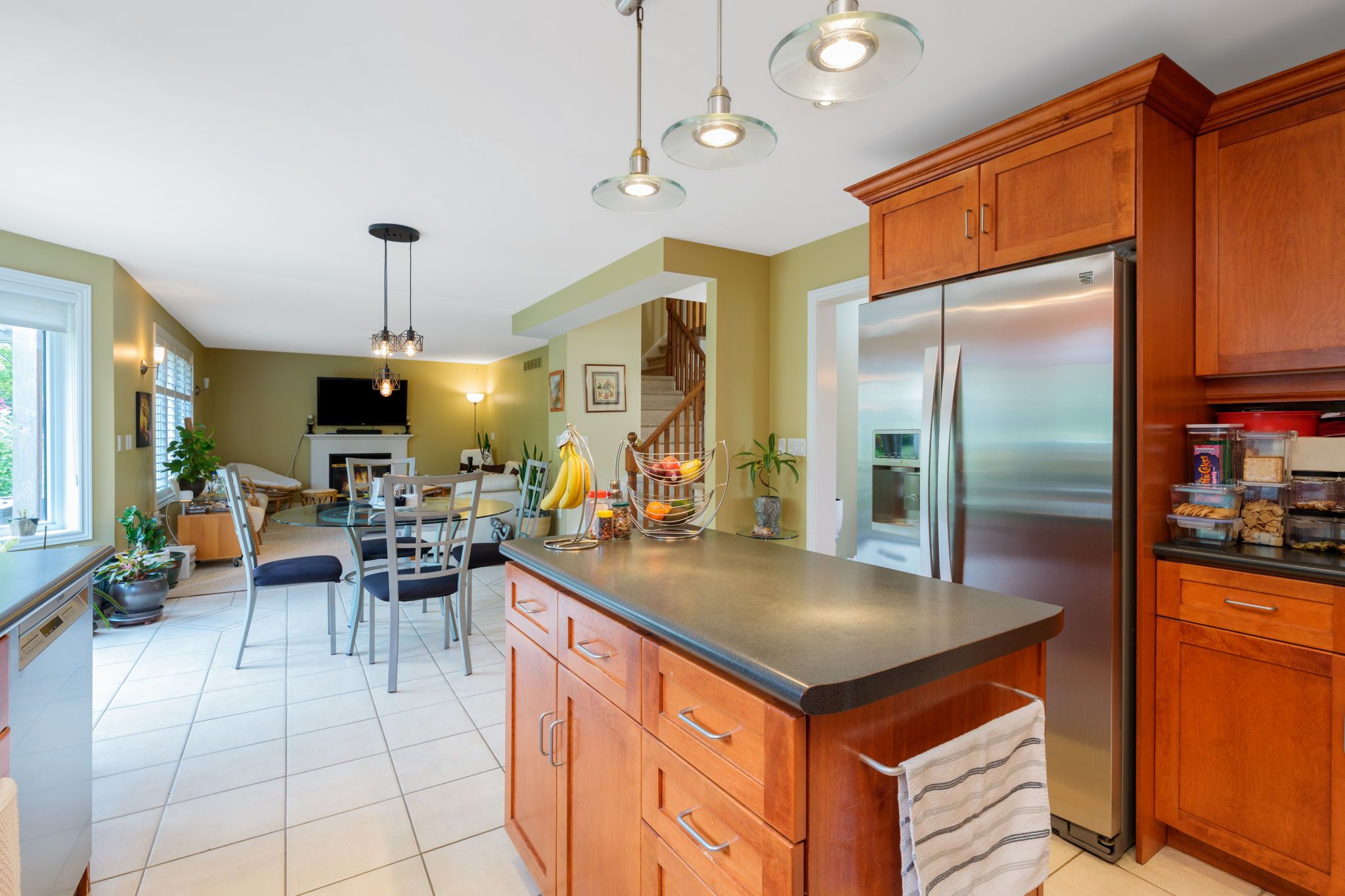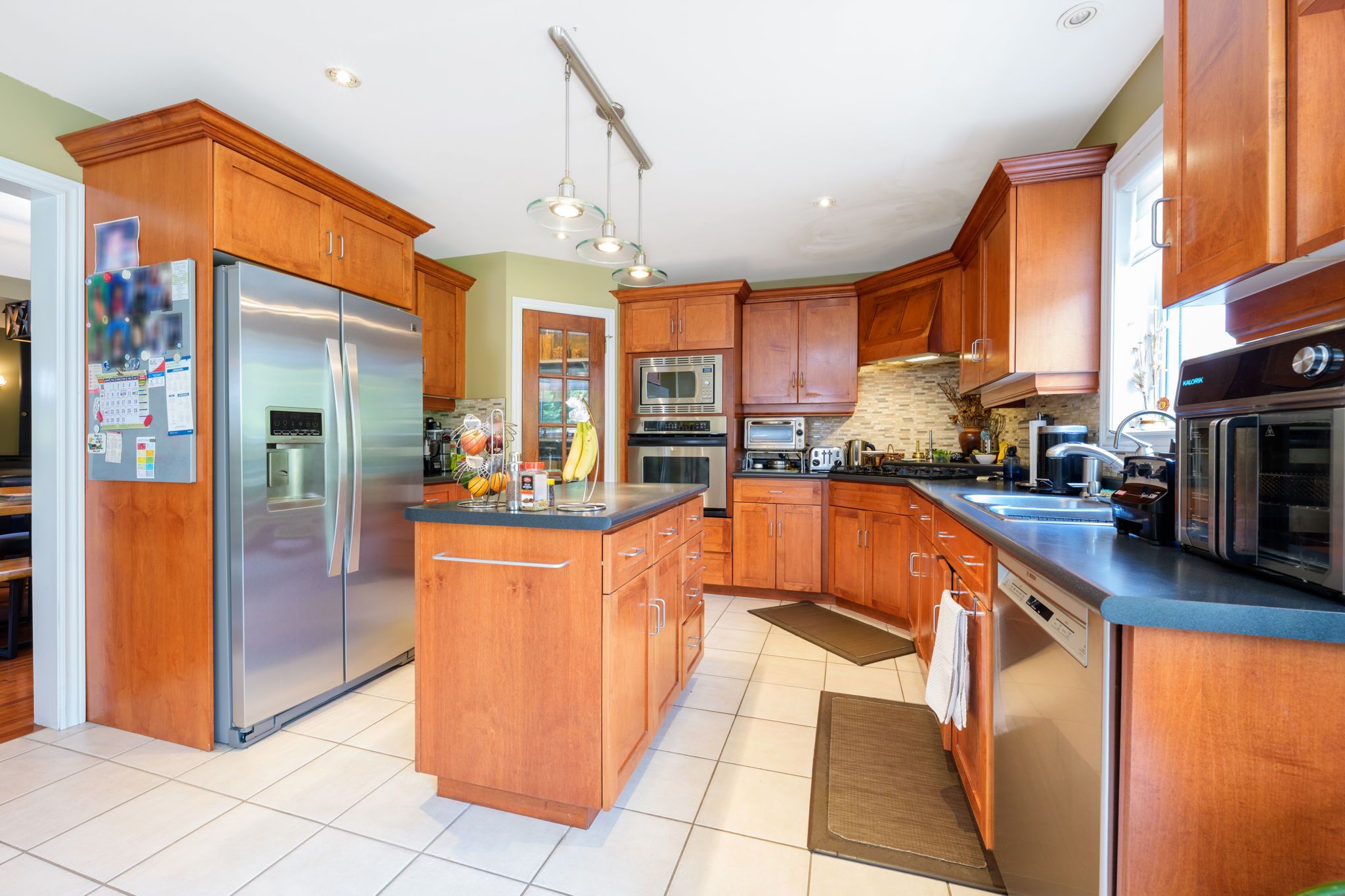 • Open concept kitchen with stainless steel appliances and easy backyard access.
