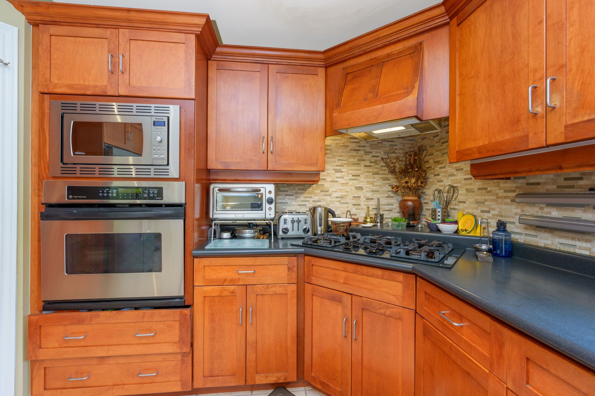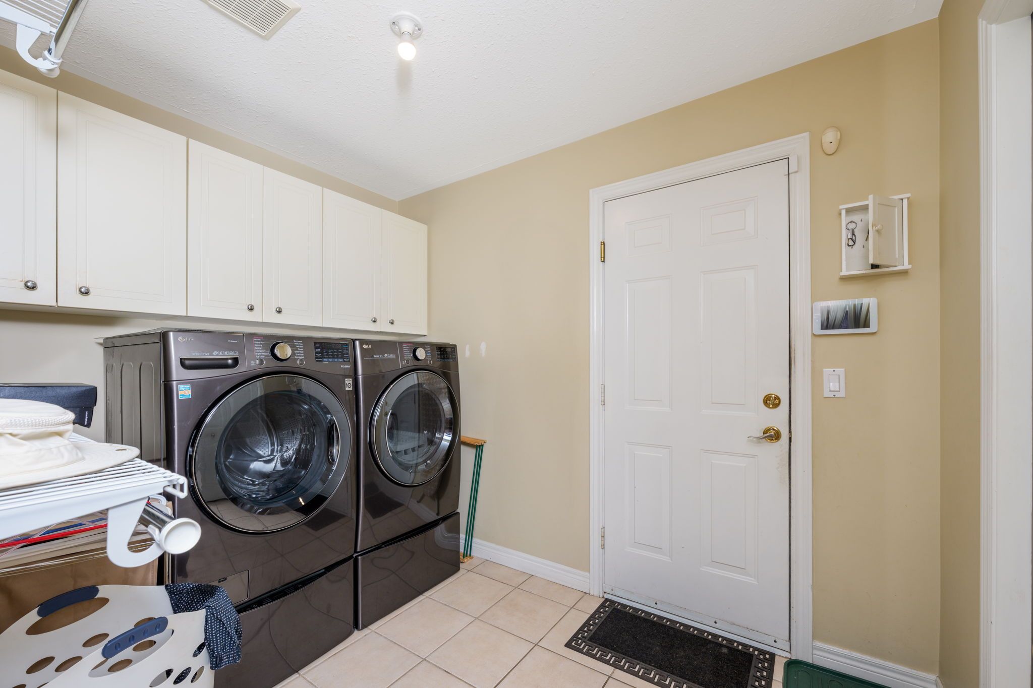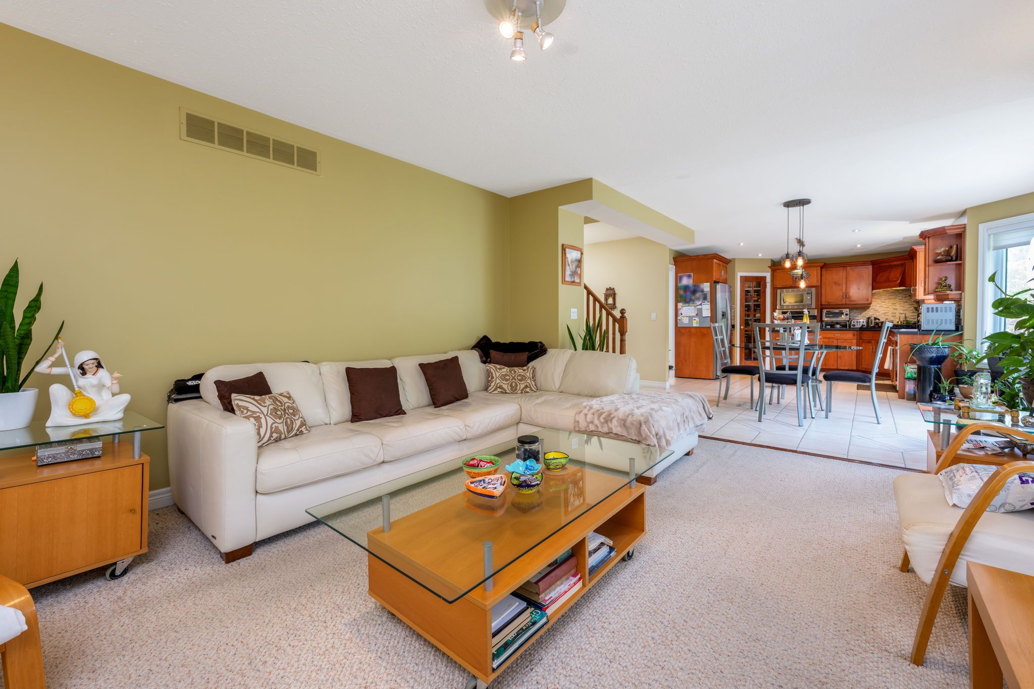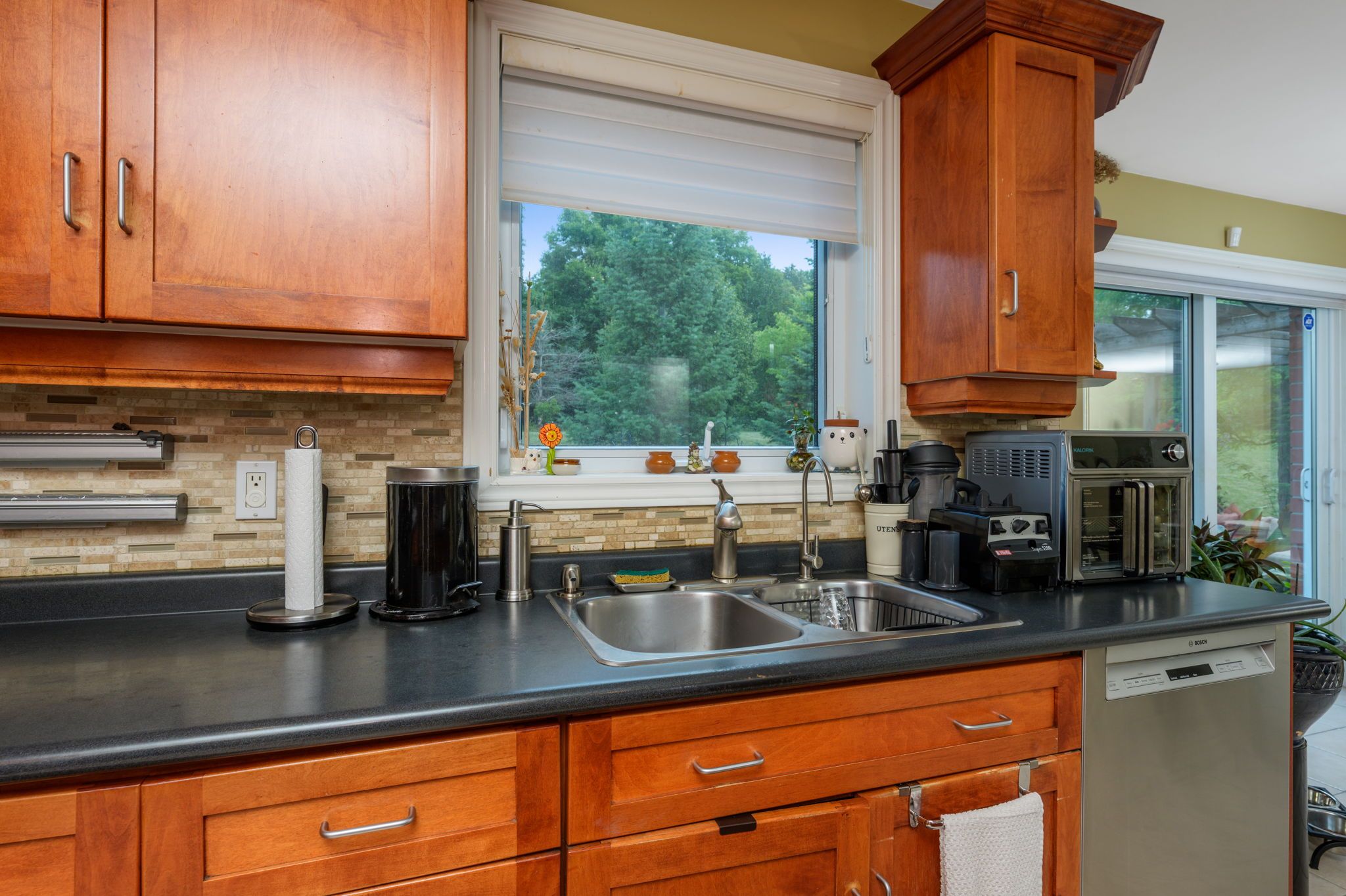 • Open concept kitchen with stainless steel appliances and easy backyard access.