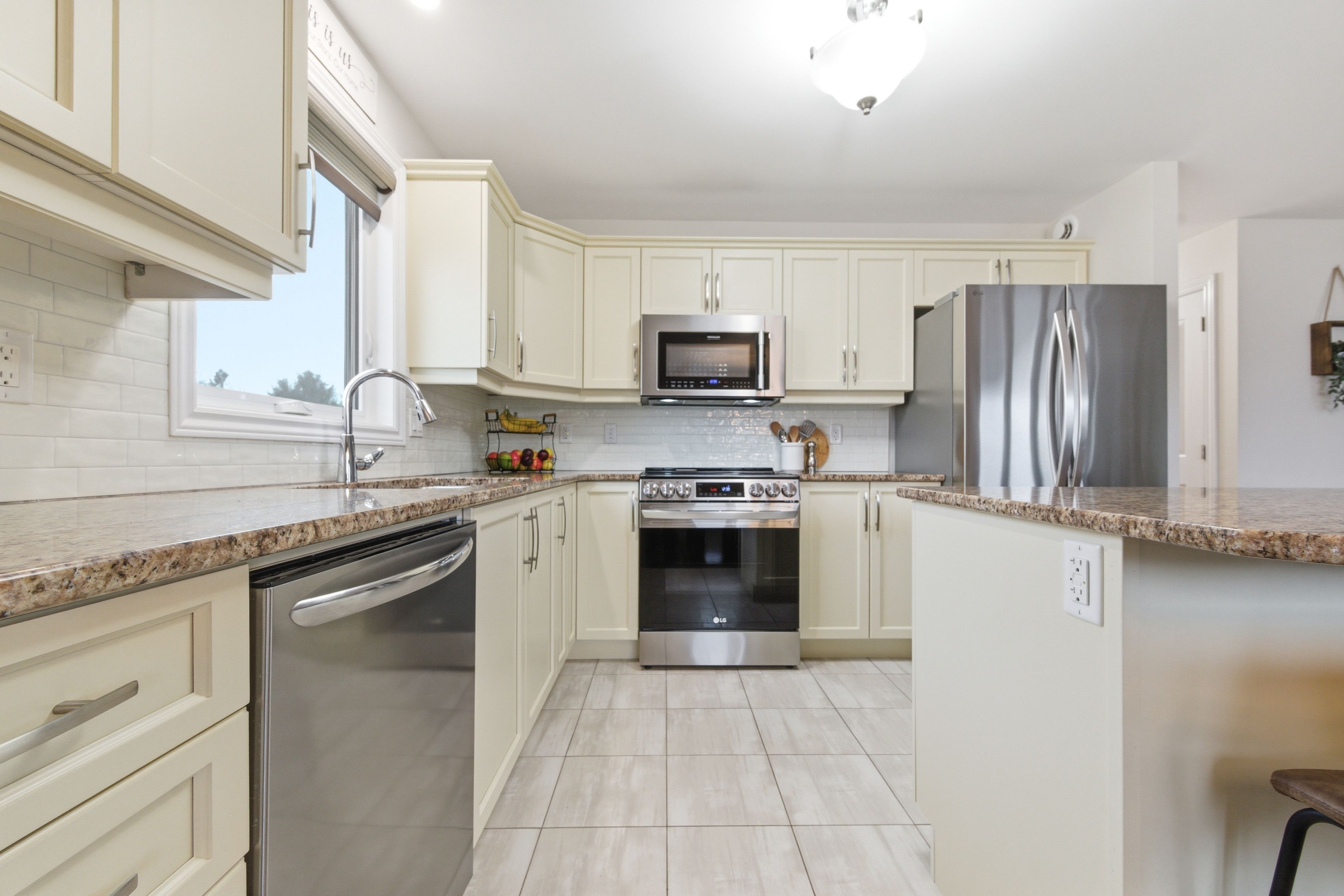 • Open concept kitchen featuring granite countertops and ample cabinetry.
