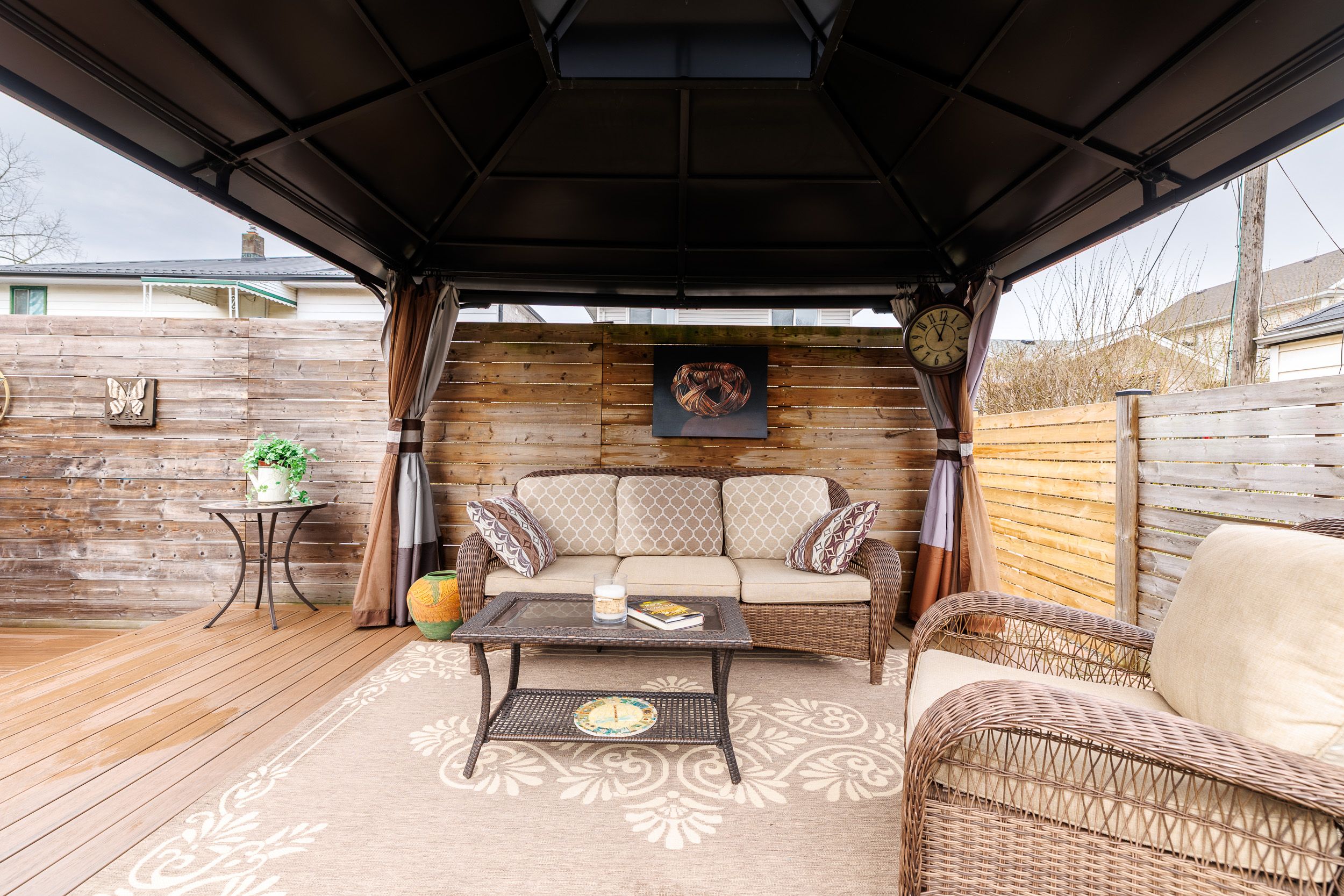 • Backyard features low maintenance decking and a gazebo for relaxation.
