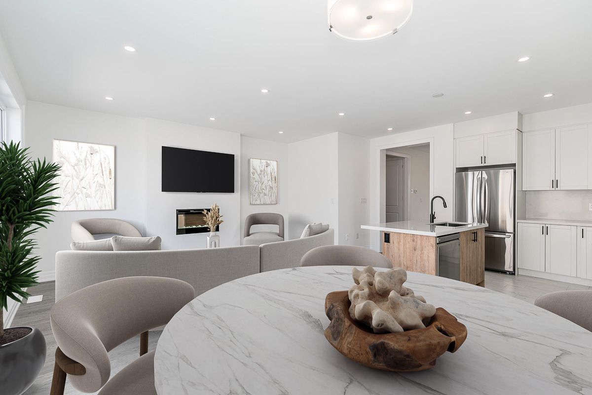The 'talbot' floor plan offers 1,568 square feet of open concept living space, 2 spacious bedrooms and 2 full bathrooms. The exterior is of vinyl siding, stone brick features and black window trim. The interior offers main floor living at its finest, with engineered hardwood flooring, 9ft ceilings and 8ft doorways throughout. The laundry room is also conveniently situated on the main floor with upgraded whirlpool front loader washer and dryer as well as upper cabinetry for additional storage needs and inside access to the garage. The kitchen is a bright enjoyable space with white quartz countertops, a seamless matching quartz backsplash, pot lights, upper cabinets, upgraded stainless steel appliances, island with dishwasher, undermount sink and black hardware. The living room has pot lights, an electric fireplace with outlets situated above for a mounted television, and a large window for natural lighting. The home comes with a 200-amp electrical service, tankless on-demand hot water heater, hrv system, sump pump and air conditioning. Schedule your showing today and see what living in wasaga beach's river's edge has to offer.