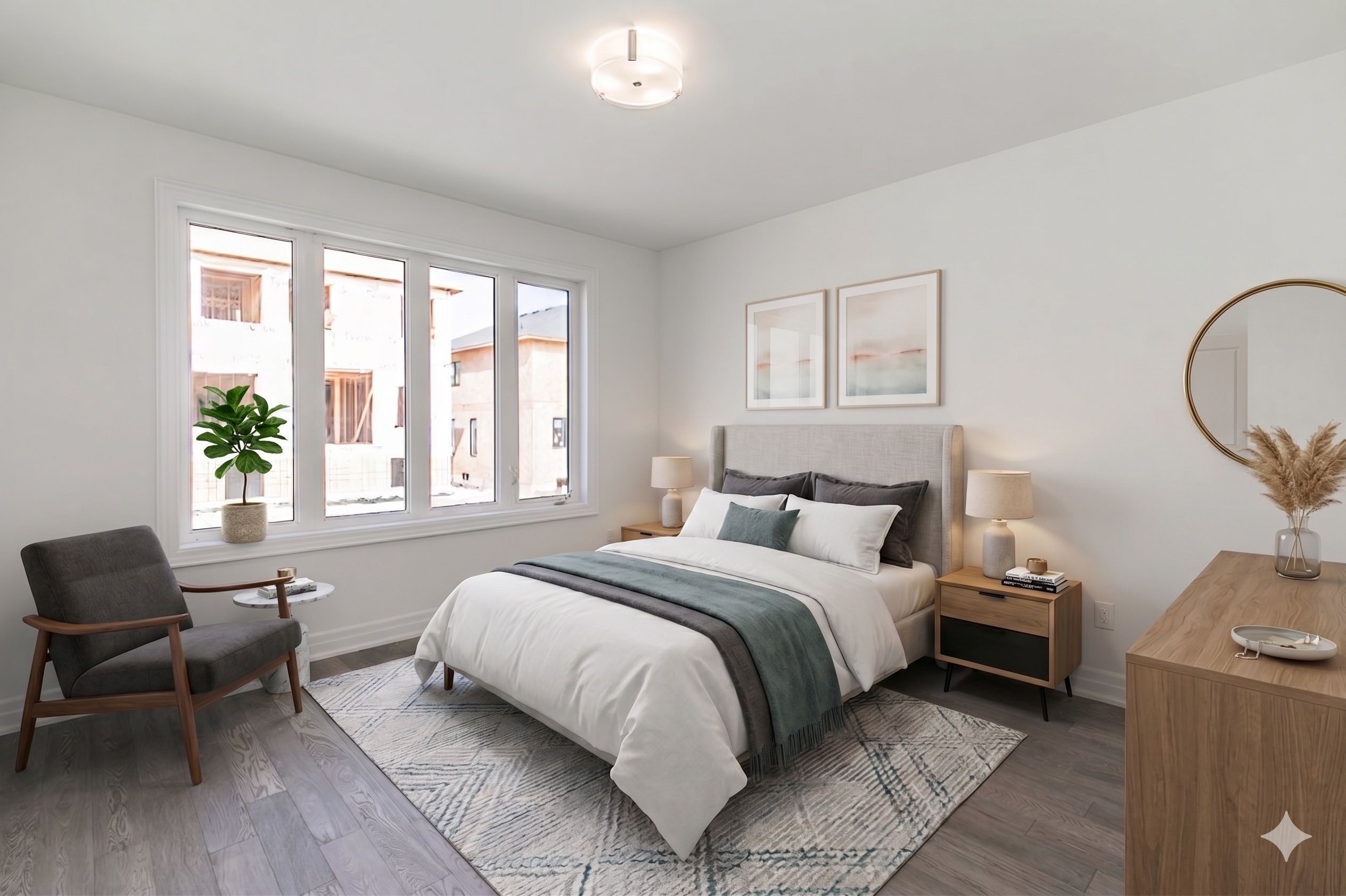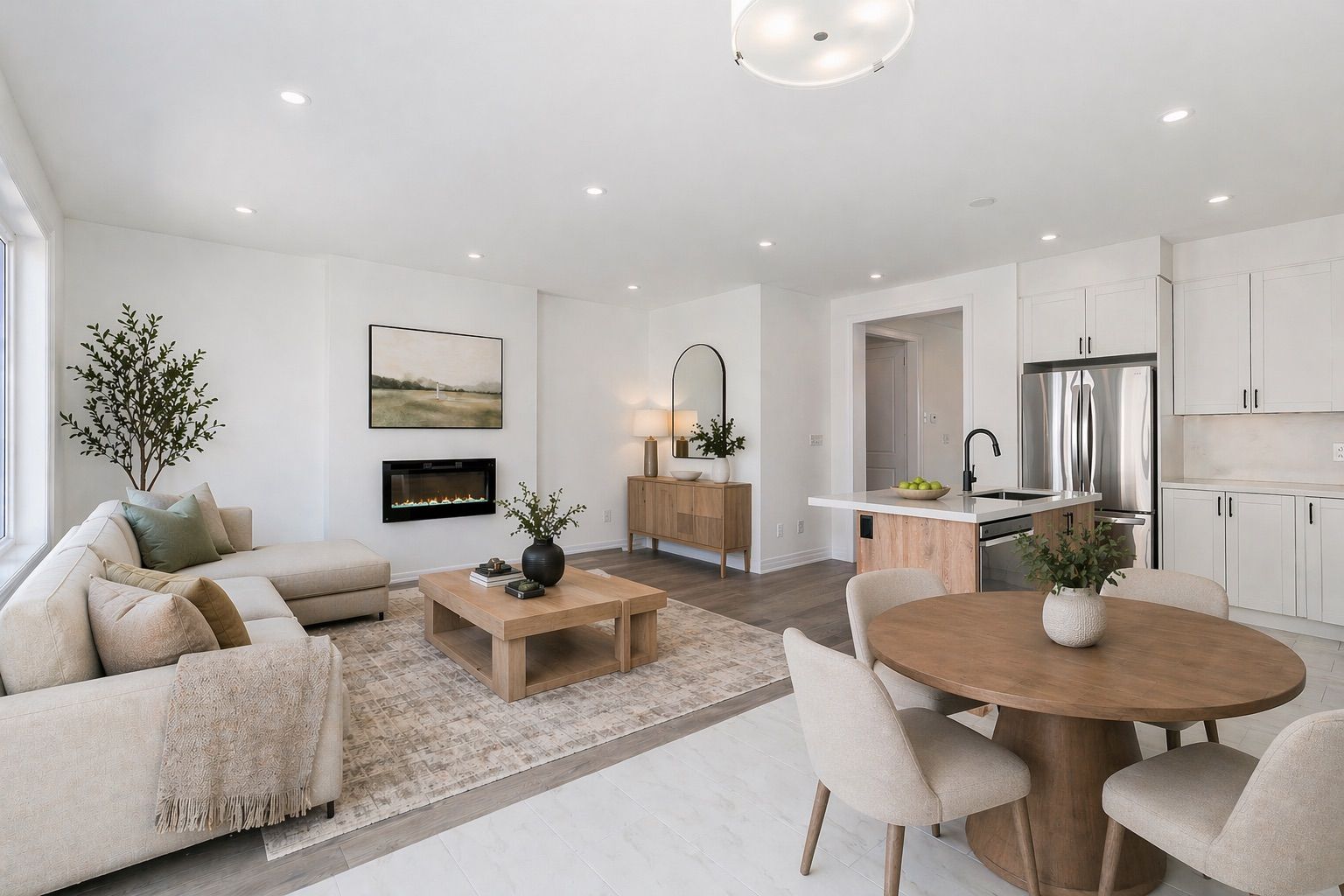 • Bright living room features an electric fireplace and large windows for sunlight.
