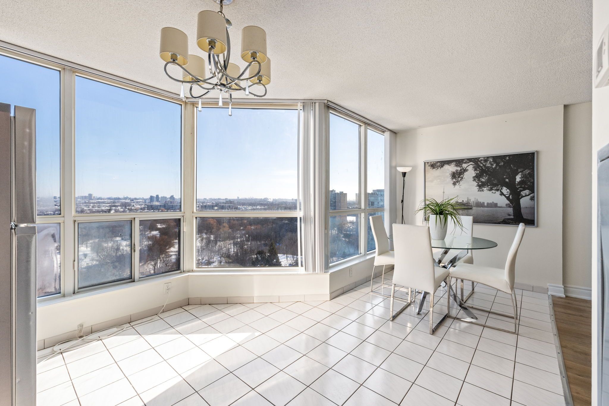 Rarely offered 2-bedroom plus solarium condominium featuring approximately 1,200-1,399 sq. Ft. Of well-designed living space with scenic ravine views. The functional layout is enhanced by large windows throughout, allowing for abundant natural light. The modern kitchen is appointed with quartz countertops, designer backsplash, upgraded cabinetry, and stainless steel appliances. The unit offers two spacious bedrooms and two 3-piece bathrooms, including a primary bedroom with a walk-out to an open balcony. Enjoy the convenience of an ensuite laundry. The solarium provides flexible use as a sitting area or home office, overlooking the ravine for a peaceful backdrop. One parking space is included. Conveniently located close to schools, shopping, and public transit. The well-managed building offers a full suite of amenities, including a gym, indoor and outdoor swimming pools, a party/meeting room, a recreation room, and 24-hour security.
