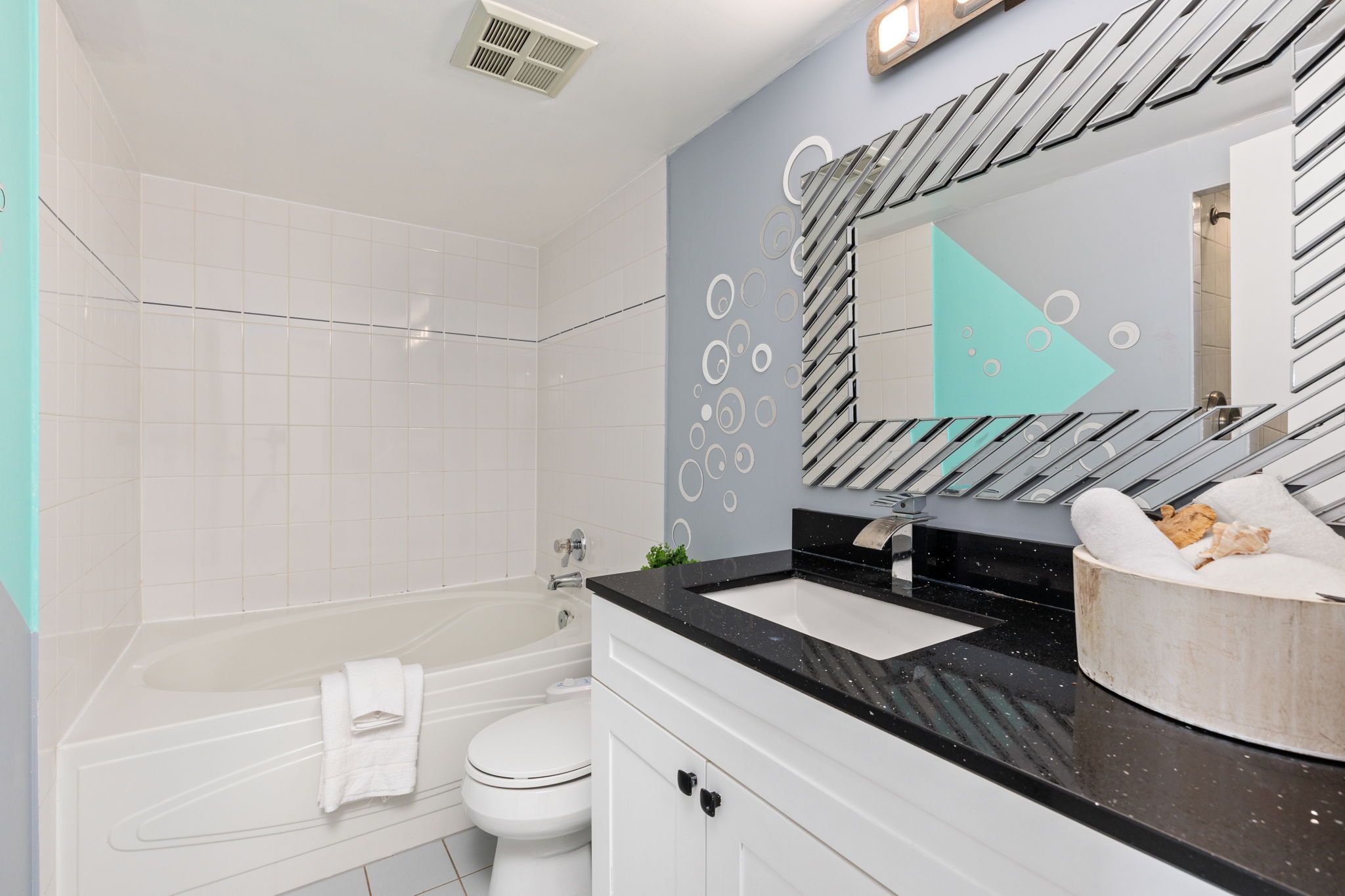 • Modern kitchen featuring quartz countertops, designer backsplash, and stainless steel appliances.